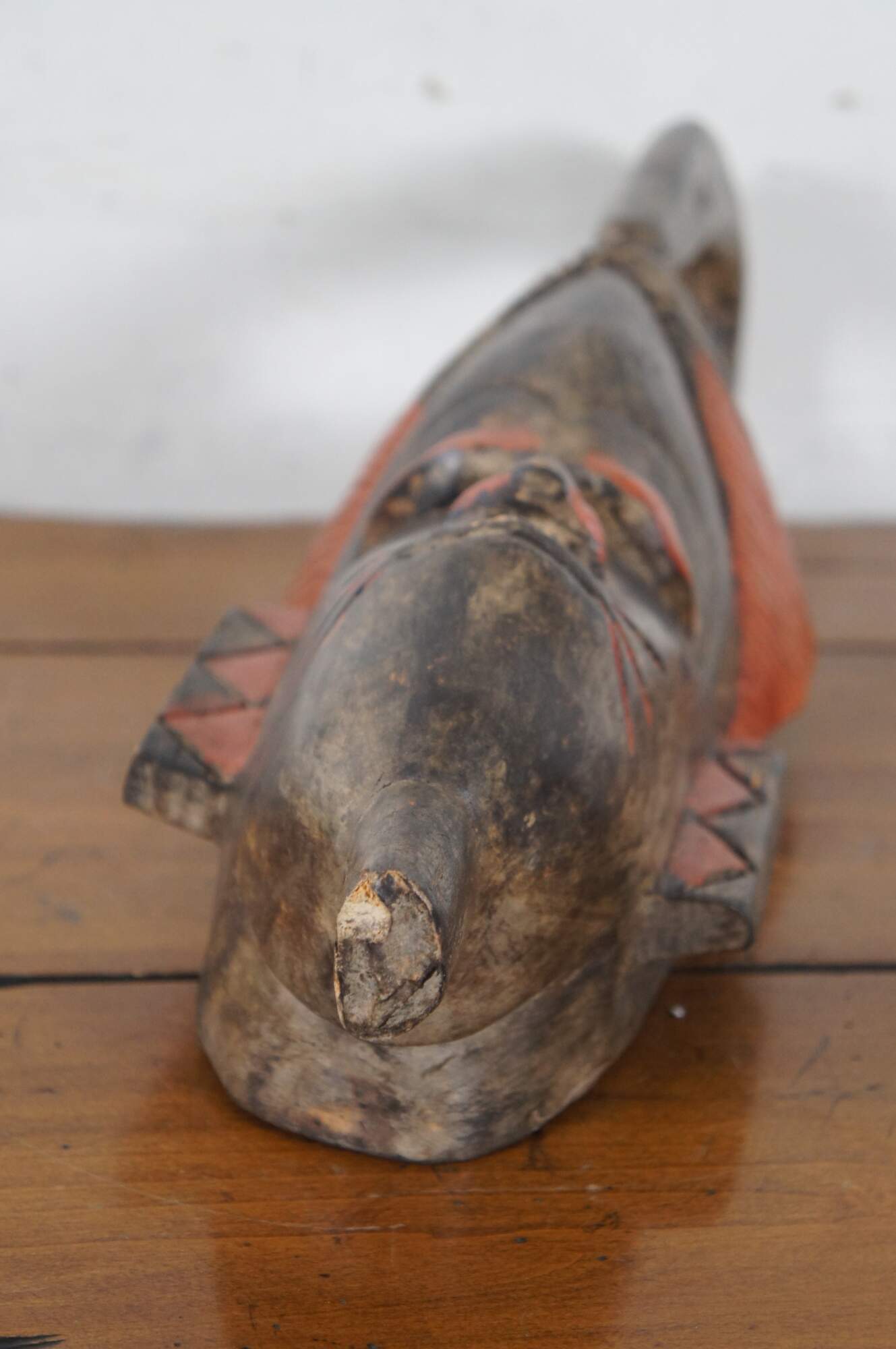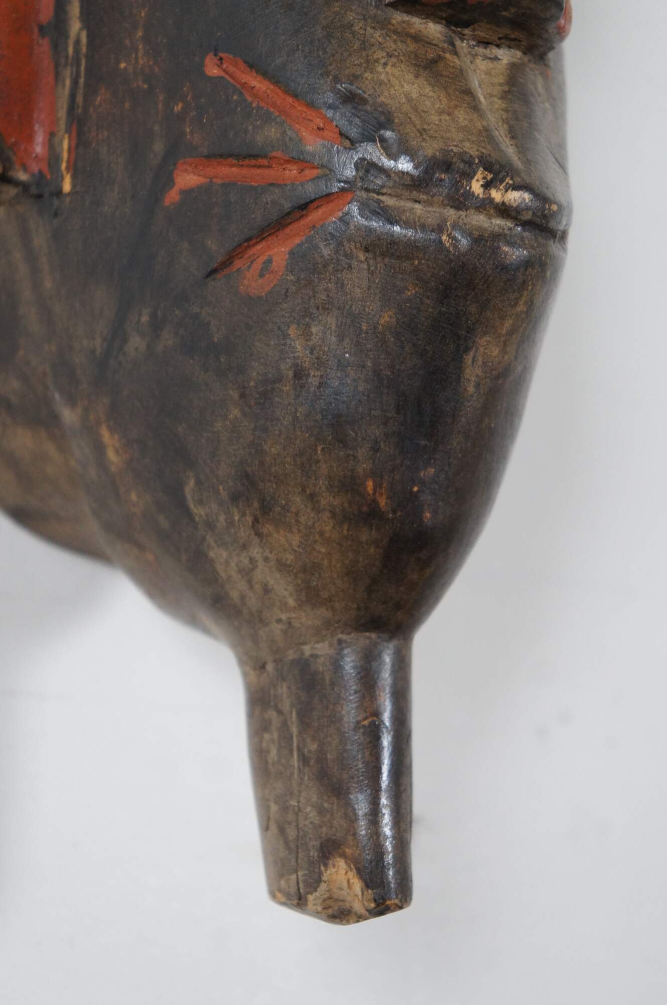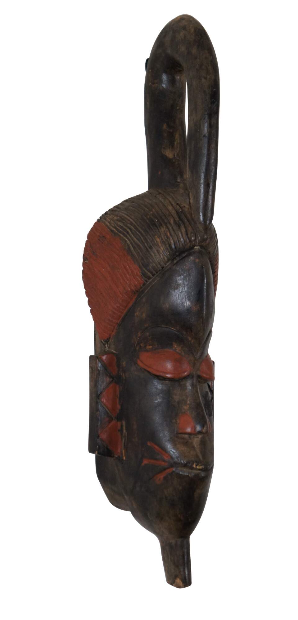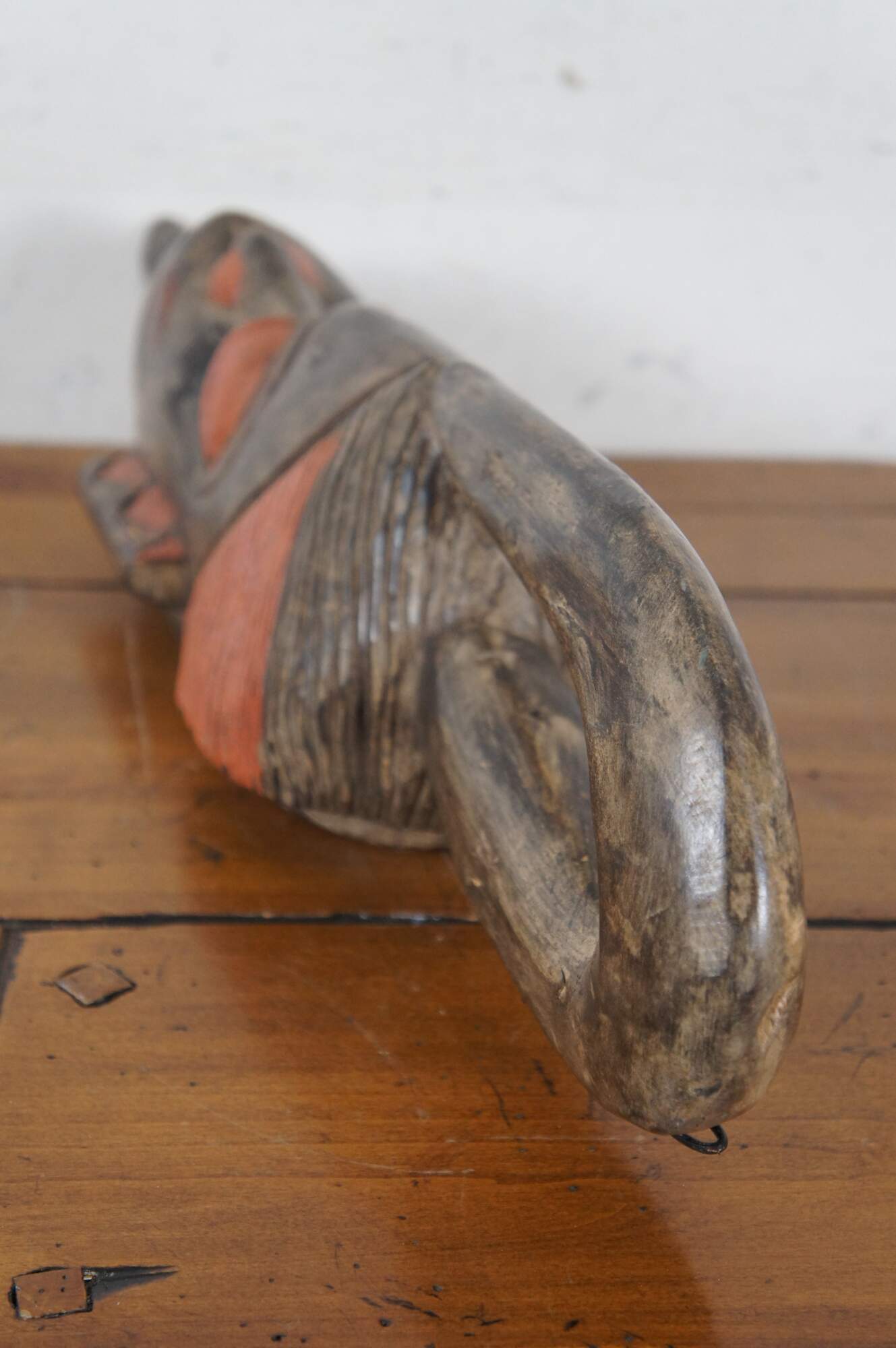 Vintage African folk art wall hanging mask, hand carved wood painted red and black with large headress and goatee.