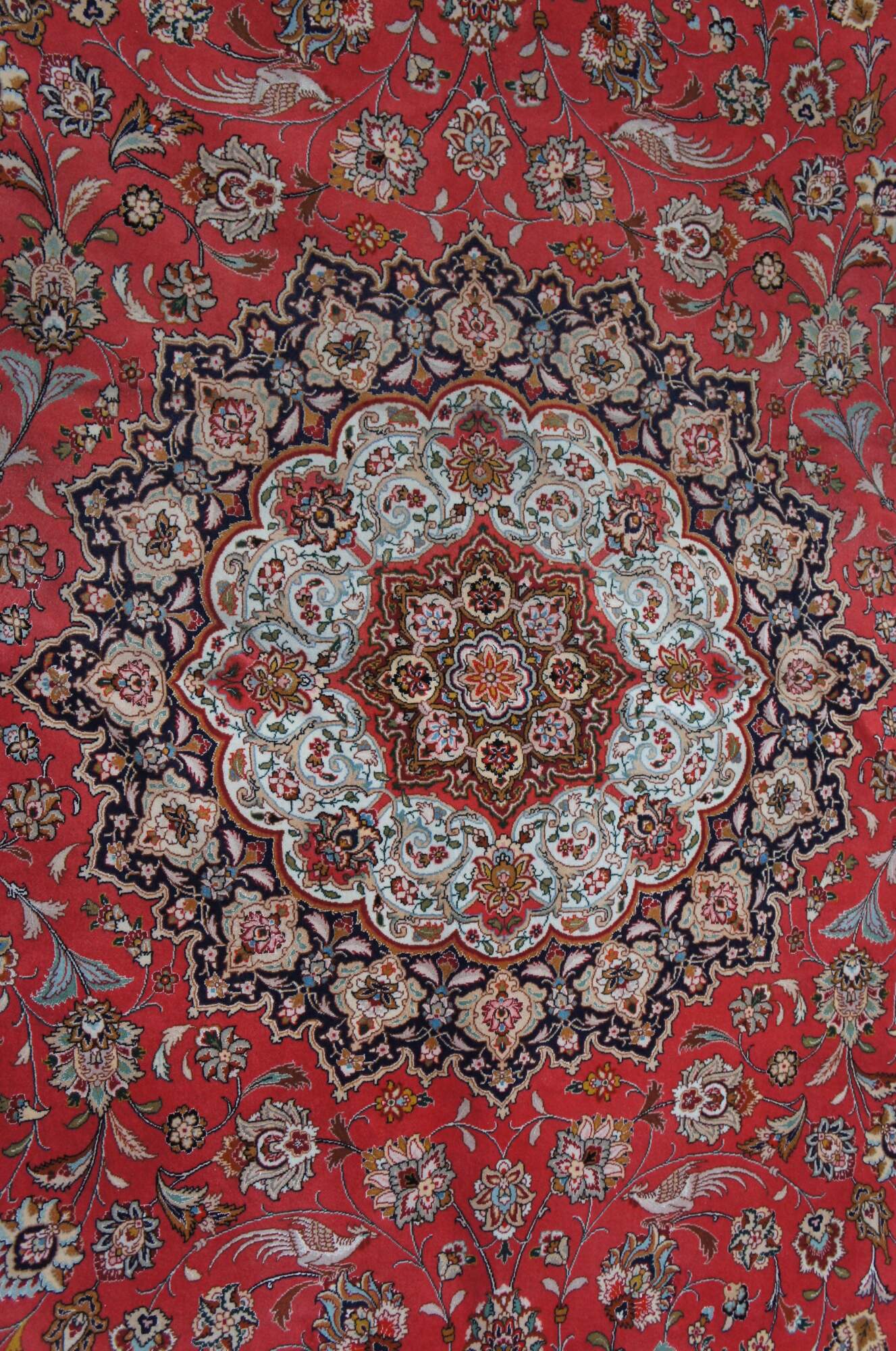 Very high quality vintage hand knotted Persian Tabriz. Features silk and wool pile featuring a red field with central medallion and floral all over design with birds. Reds, Blues, Tans, Creme, Pink, Greens, Yellows, Orange, Browns