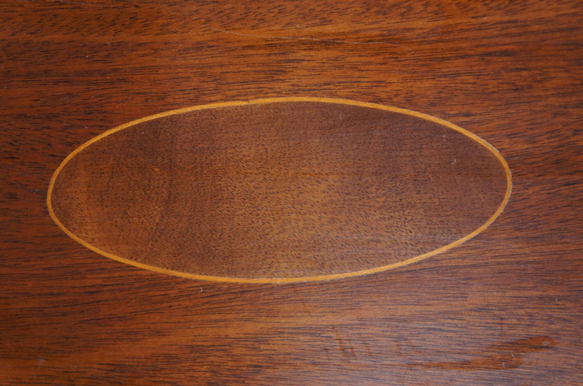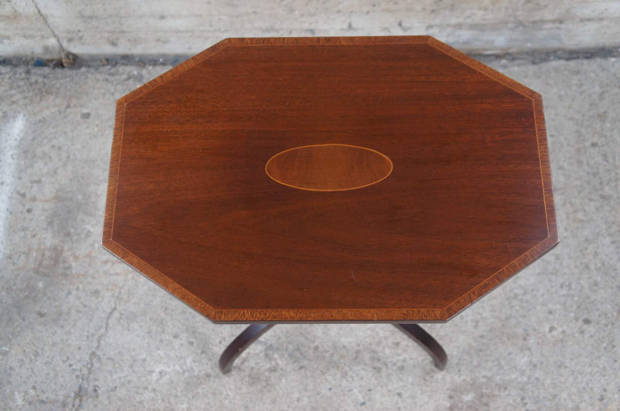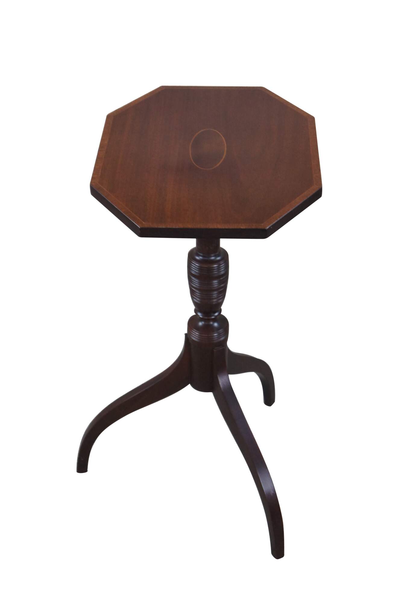 Biggs Furniture Old Sturbridge Village Collection Federal Candle or Sculpture Stand, circa last half 20th century. Made from mahogany with an Octagonal inlaid and crossbanded top over turned and ribbed center support leading to spider leg base. Table is marked along underside.