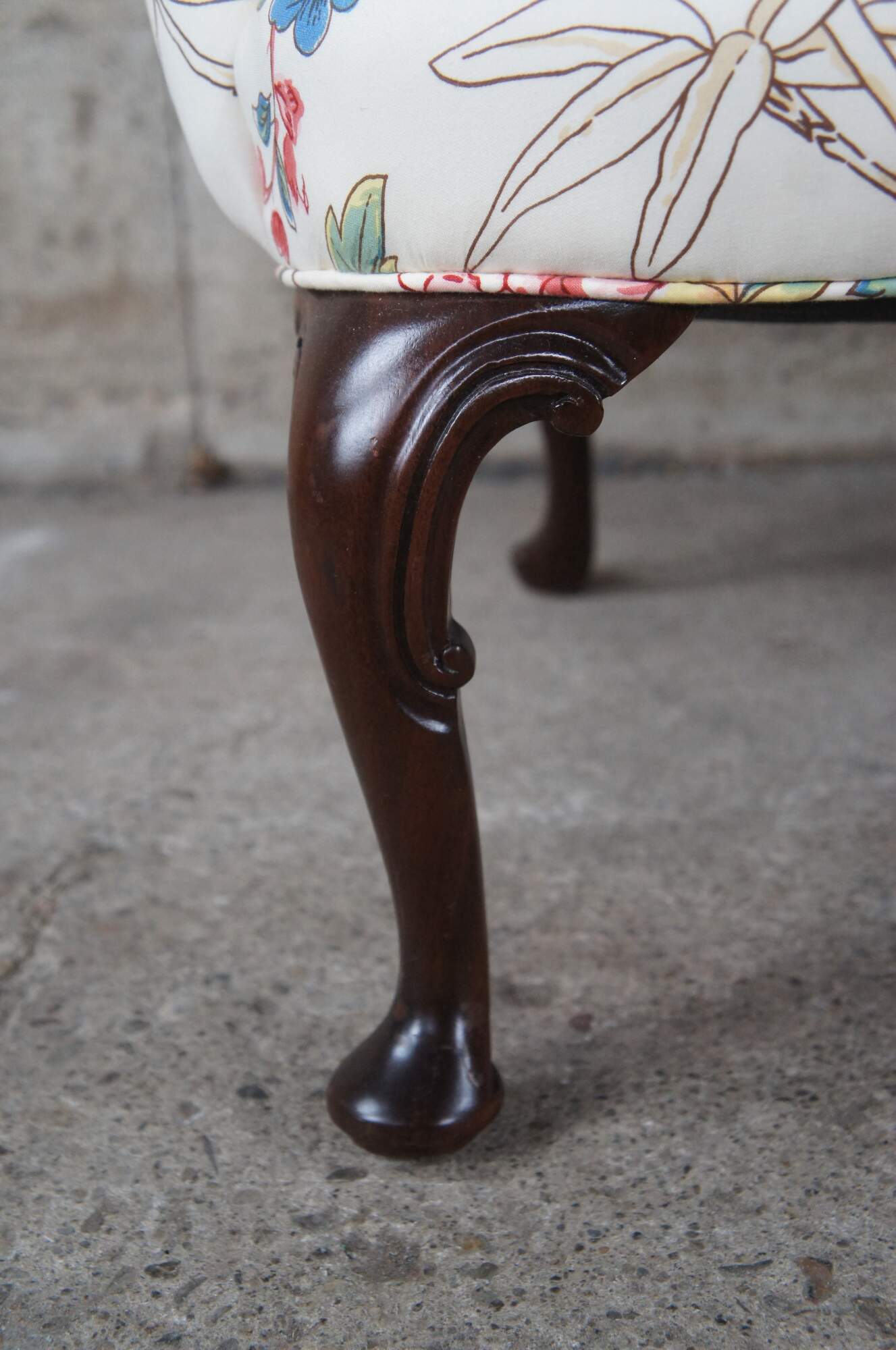 A beautiful Queen Anne style wing chair by Biggs Furniture, circa last half 20th century. Made from mahogany with a highback and scrolled and flared arms. The chair is supported by downswept cabriole legs leading to pad feet. The floral fabric is blooming in color and includes a down seat. Originally Purchased from William W. Sauer Associates Ltd. in Virginia Beach, Virginia in 1997
