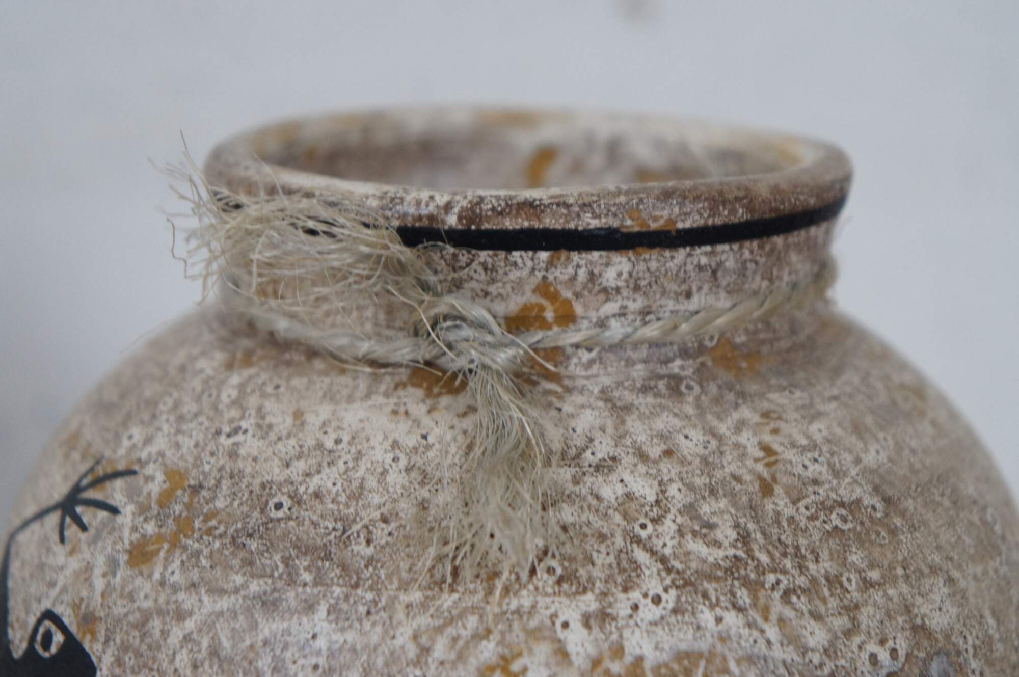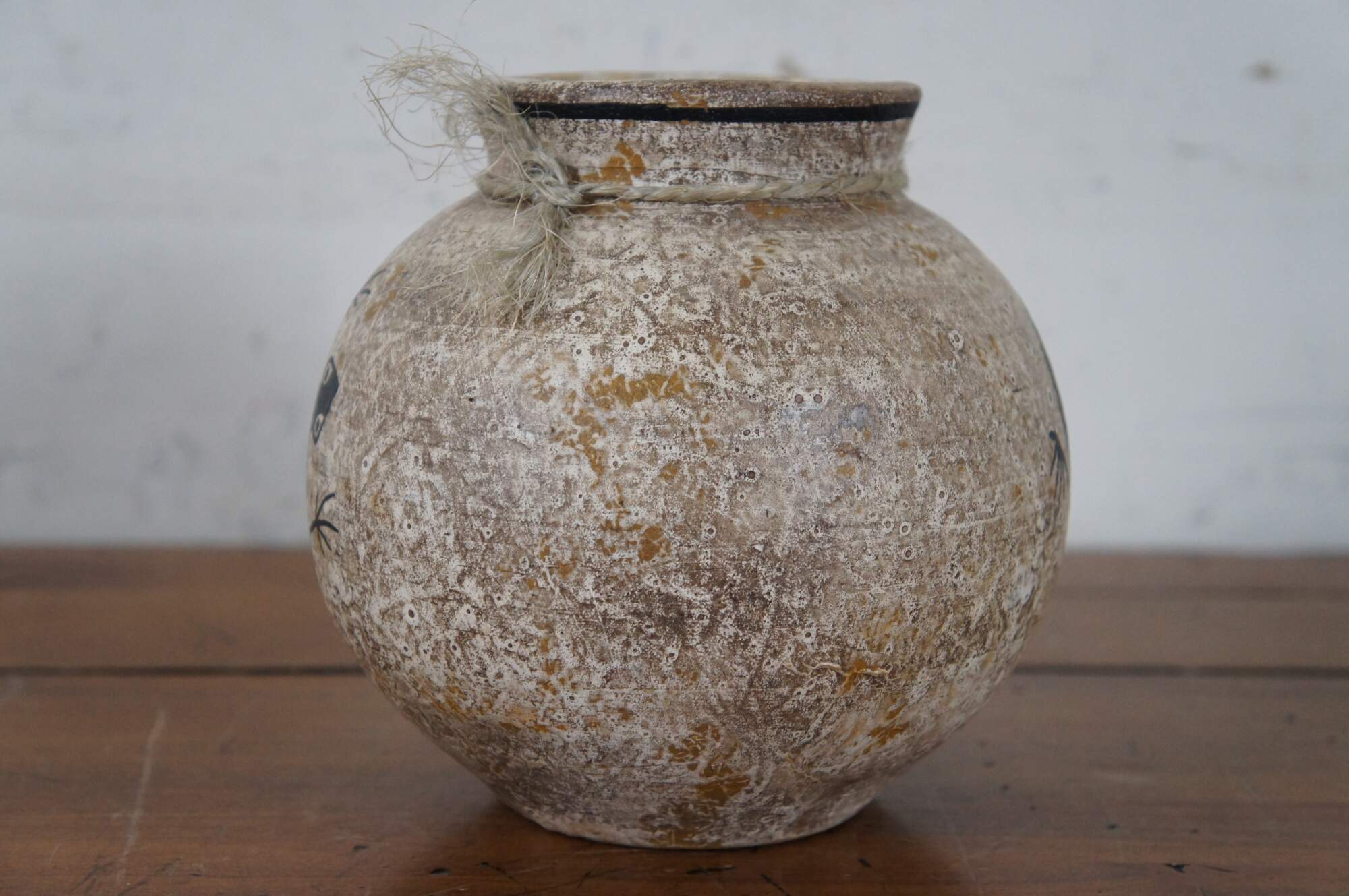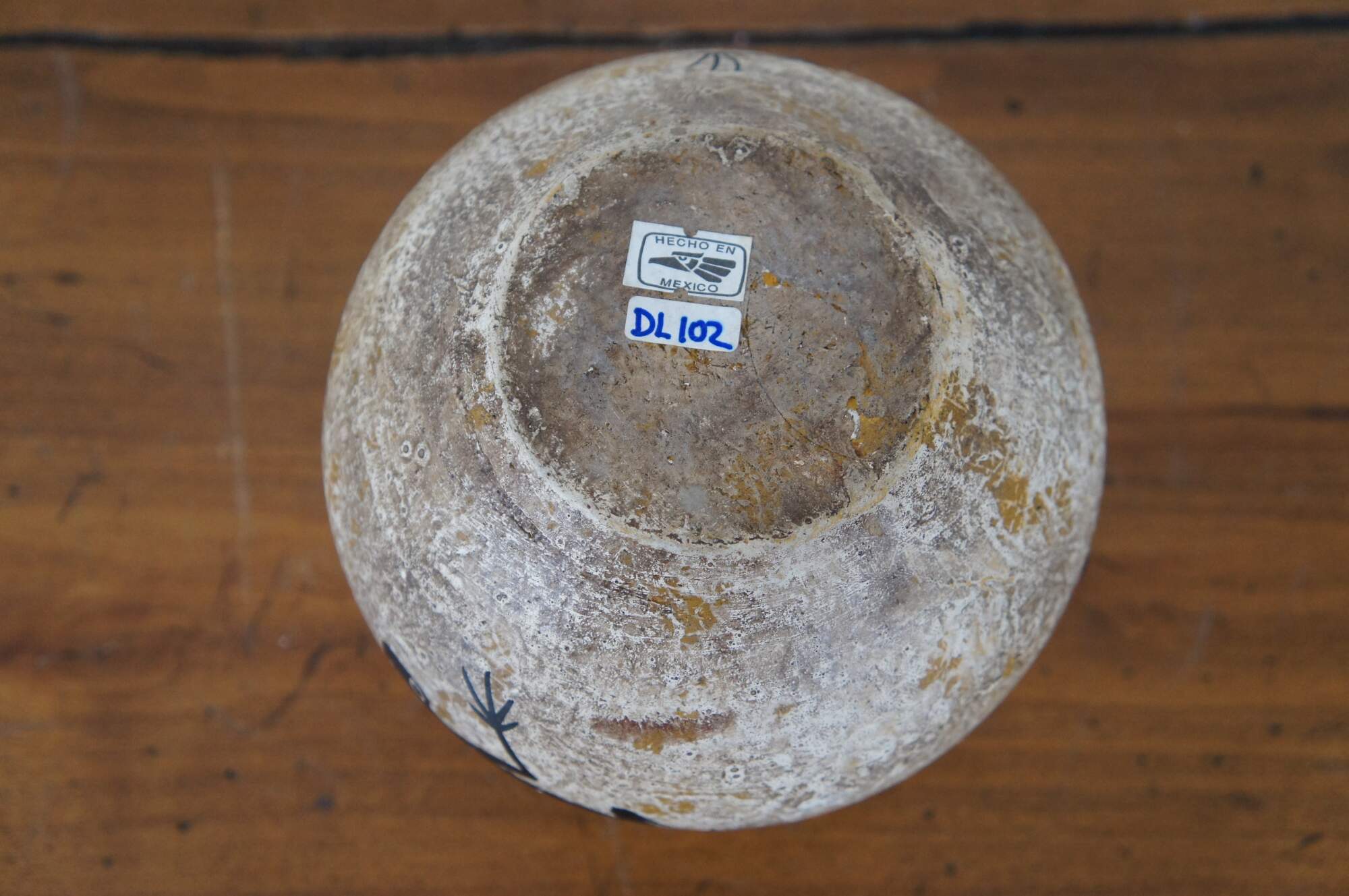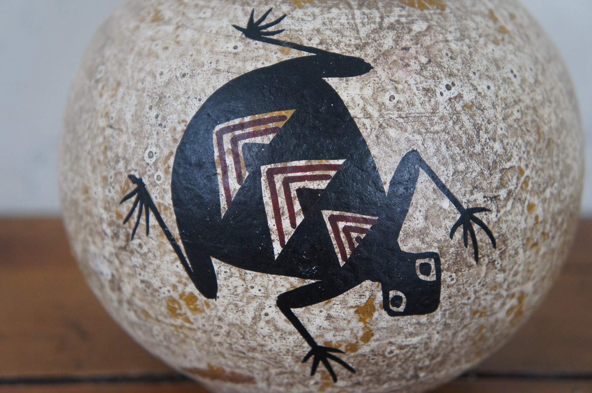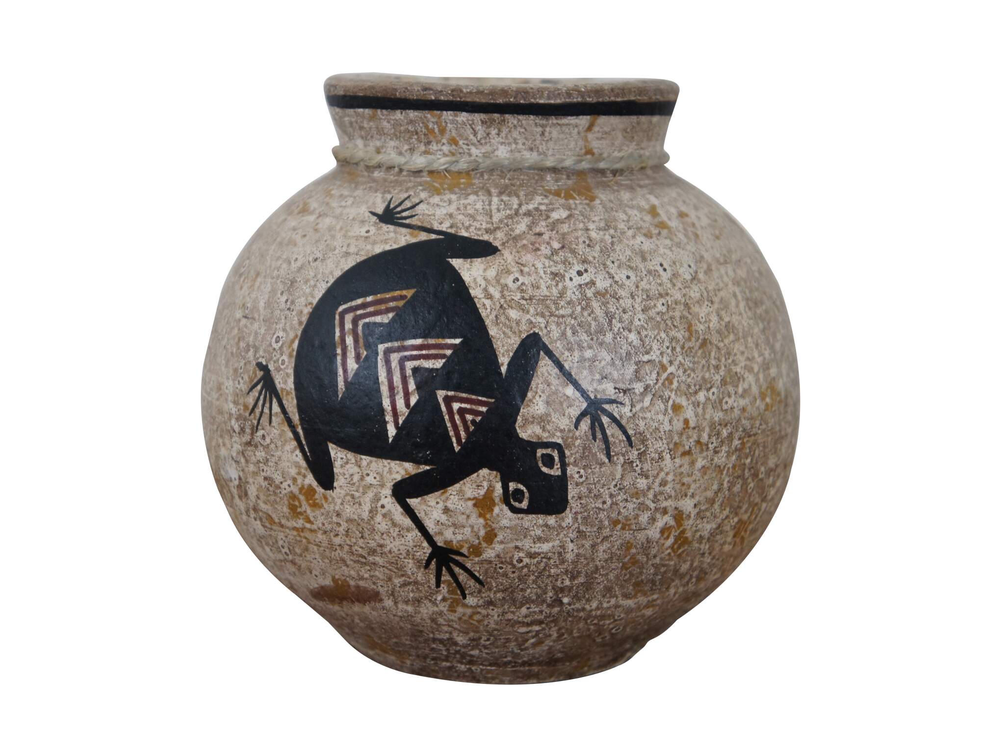 Vintage Mexican / Southwestern / Native folk art pottery pot or low, round vase in a mottled pale brown and decorated with a pair of black frogs with red chevrons on their backs. Hecho en Mexico (Made in Mexico). Hand written sticker on base marked DL 102, Pucano.