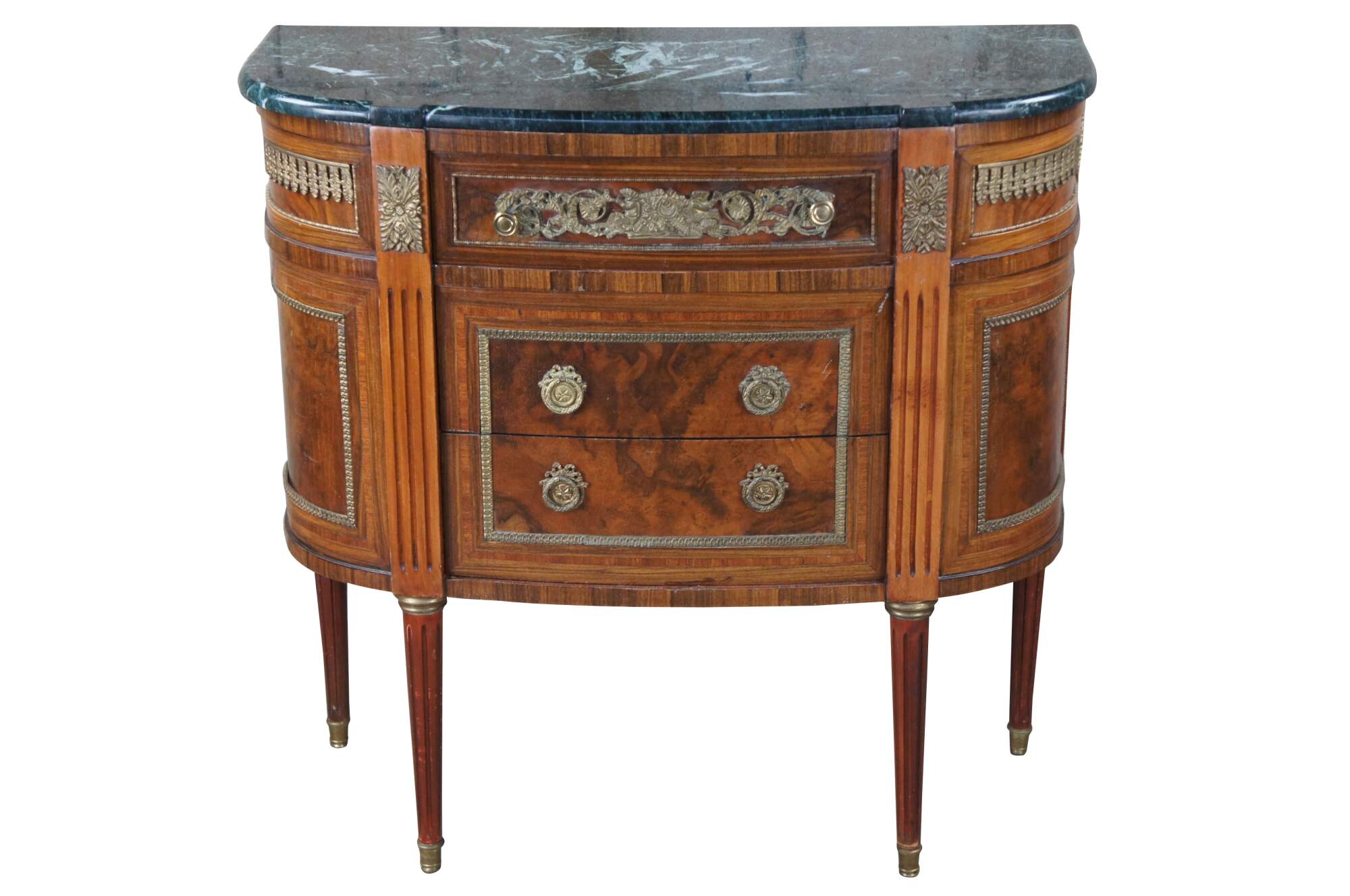 Vintage French Louis XVI style commode, dresser or console, circa 1970s. Made of mahogany featuring half round demilune form with ornate brass trim, notched marble top, three drawers, fluted accents and tapered legs capped with brass feet. Made in Egypt.