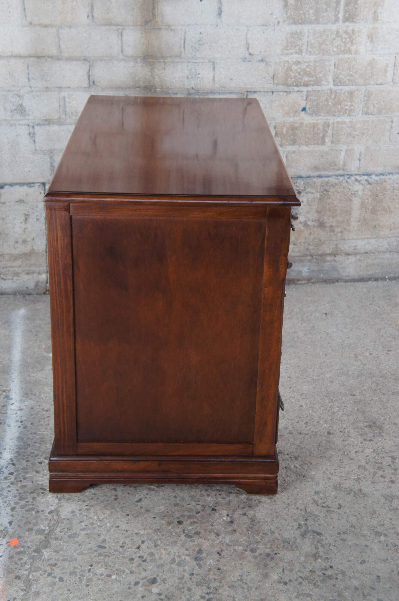 Antique Chippendale style kneehole writing desk featuring rectangular form with eight drawers, bracket feet, and brass hardware.