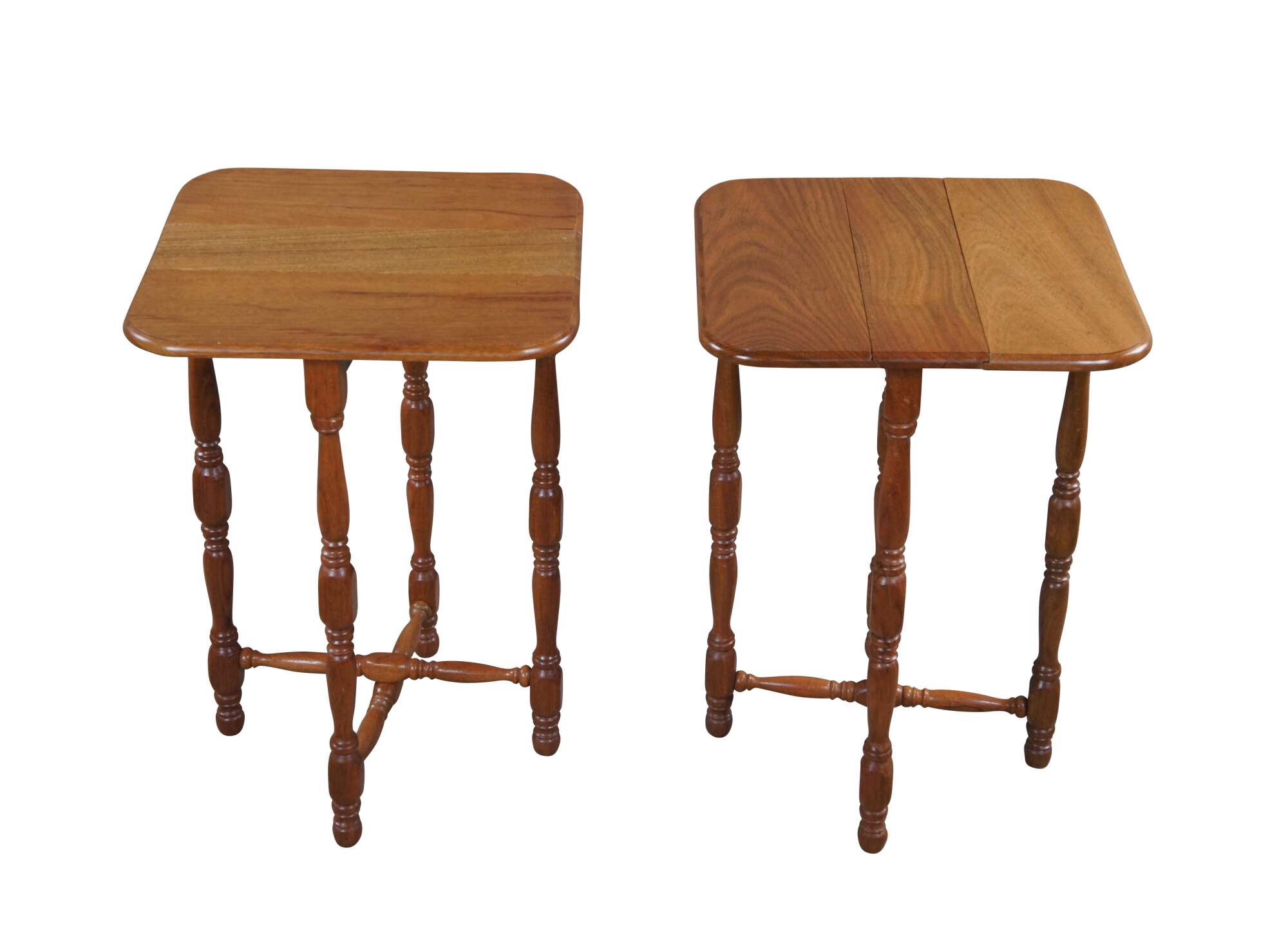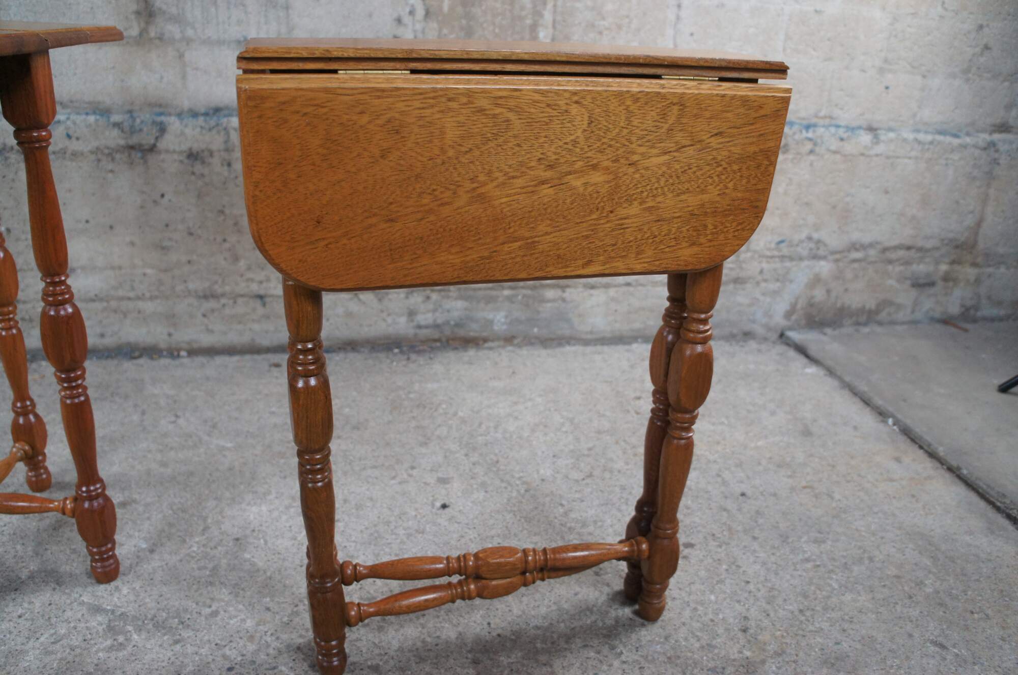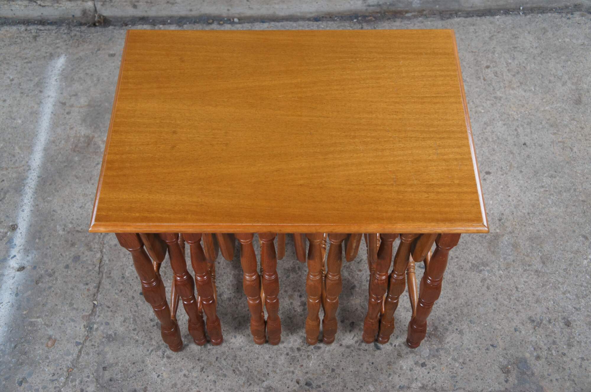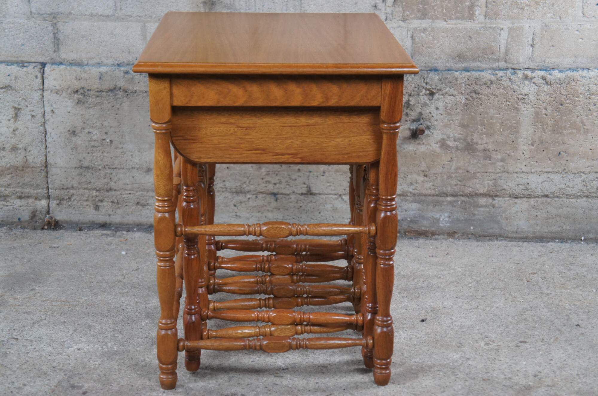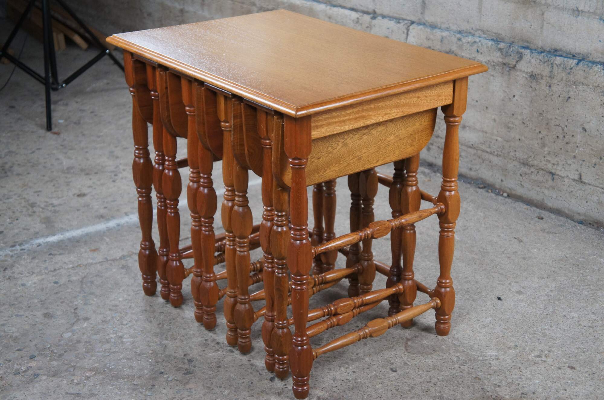 Intriguing set of farmhouse nesting tables. Made from oak with a carrier or larger side table that houses each of the four drop leaf nesting tables. Nesting tables. Features turned legs and X formed base when opened.