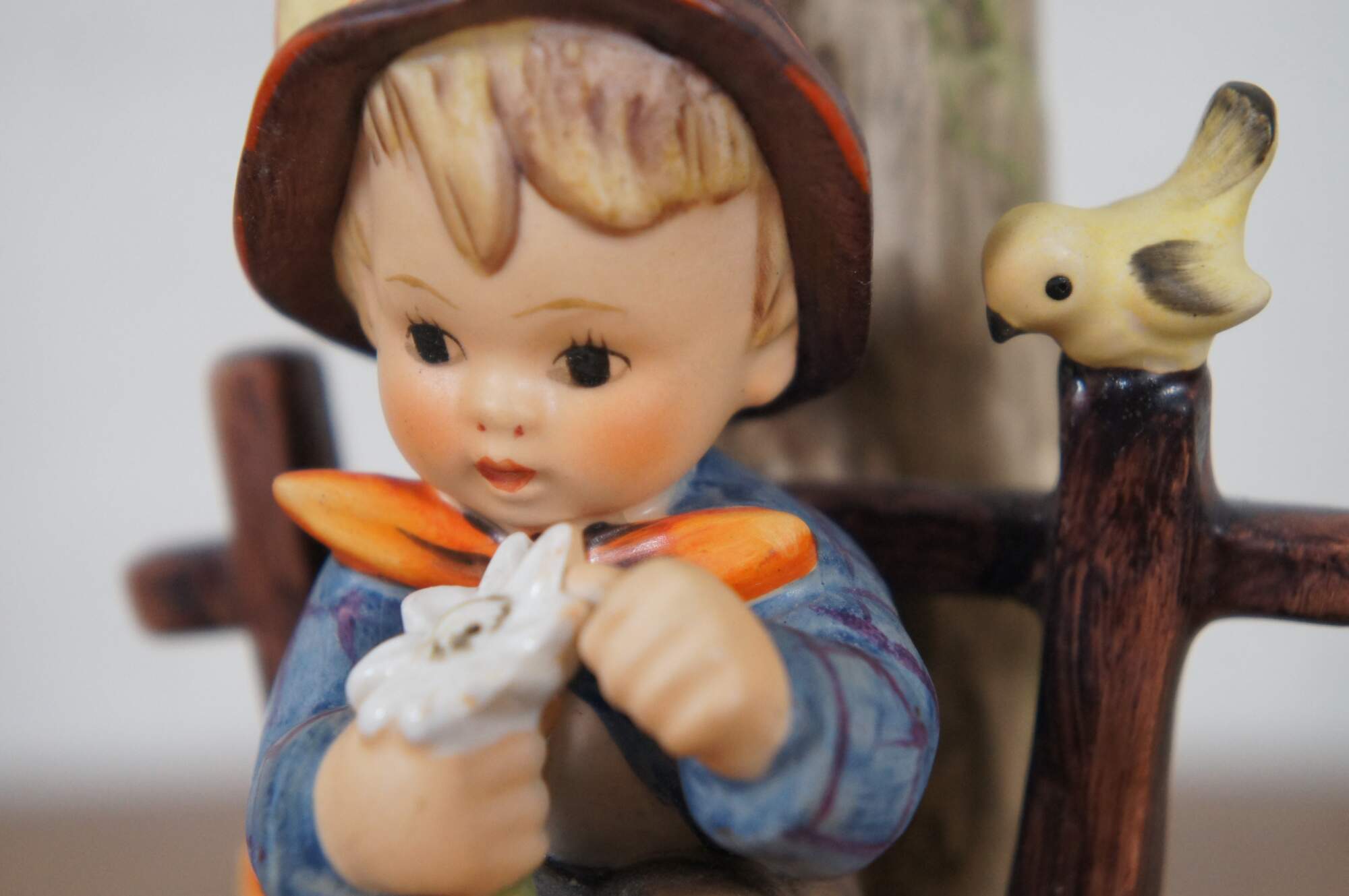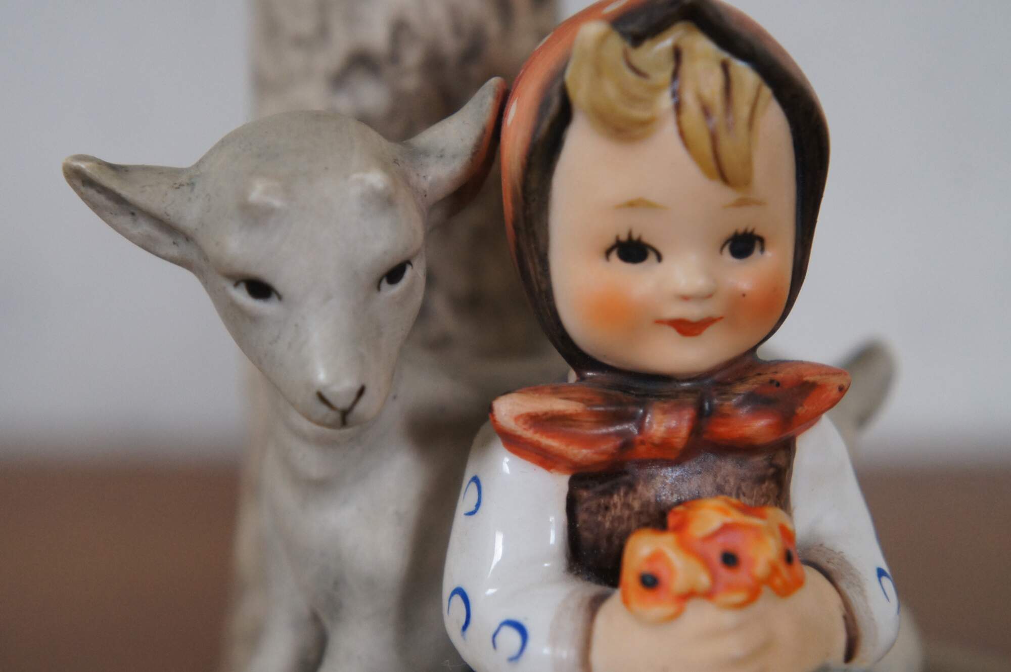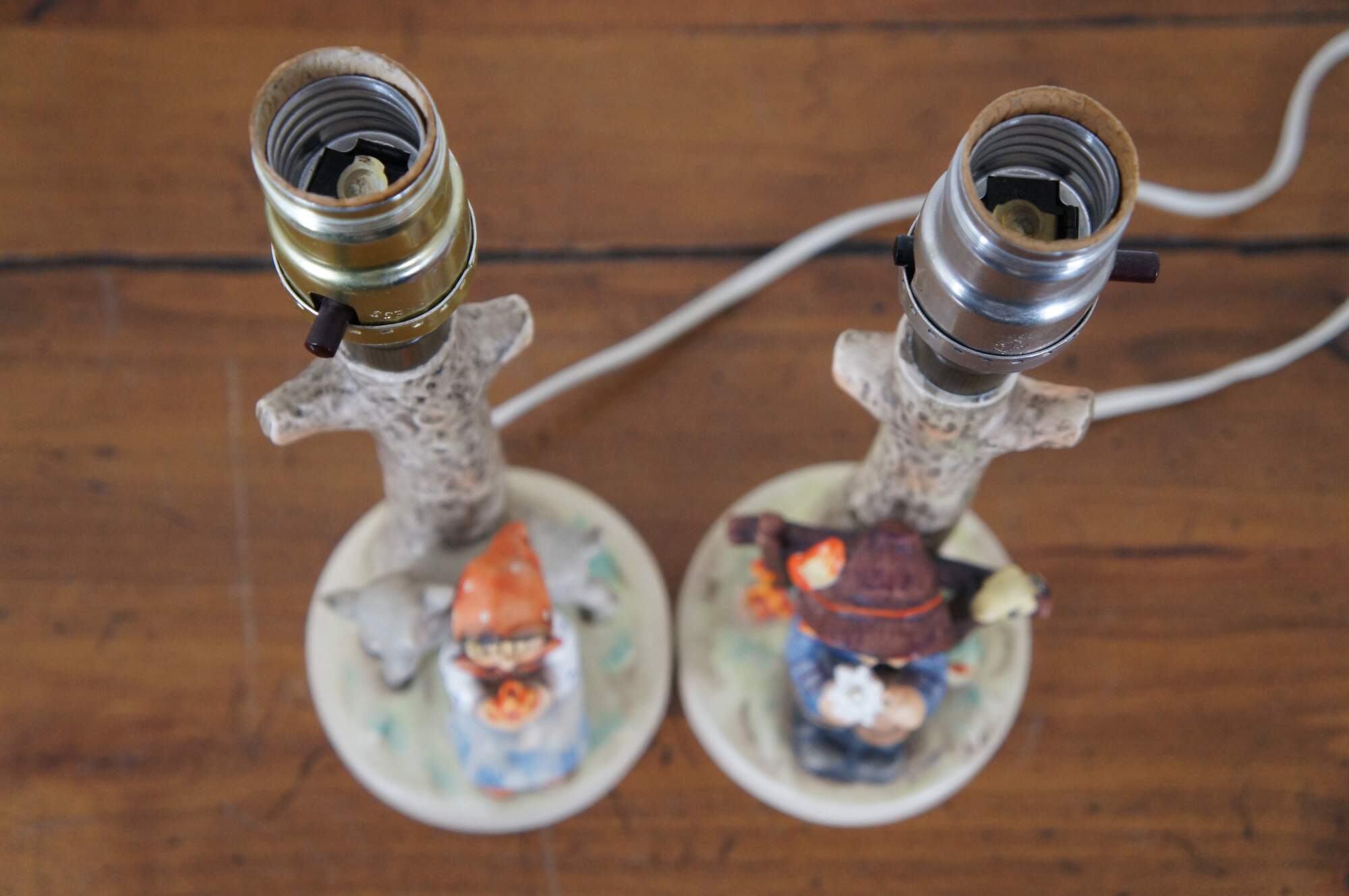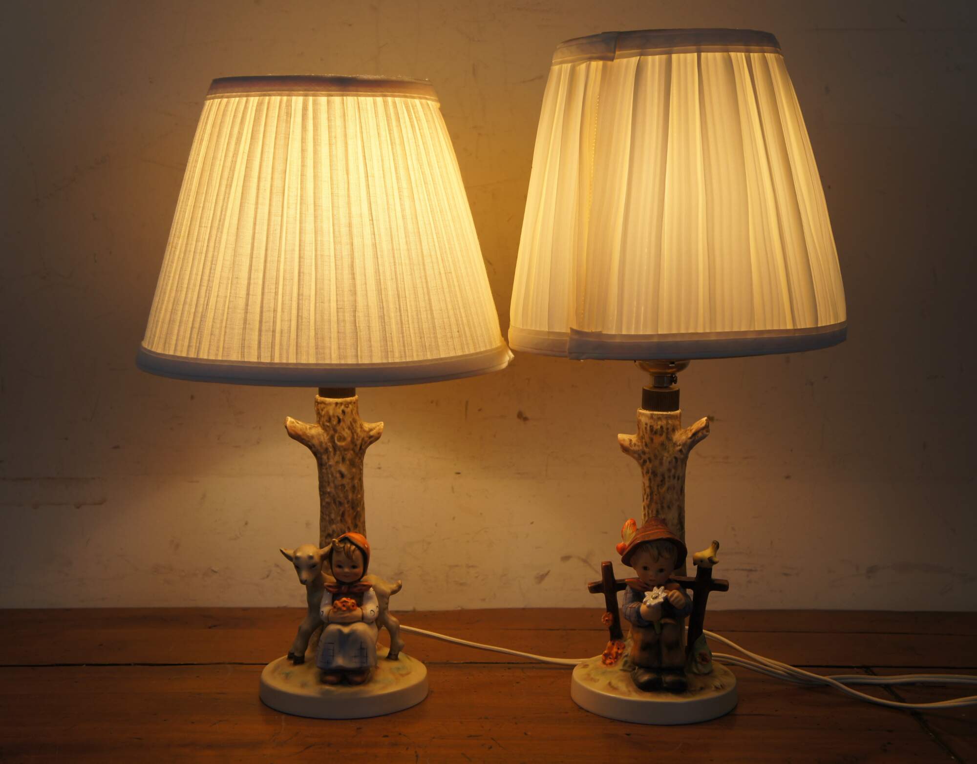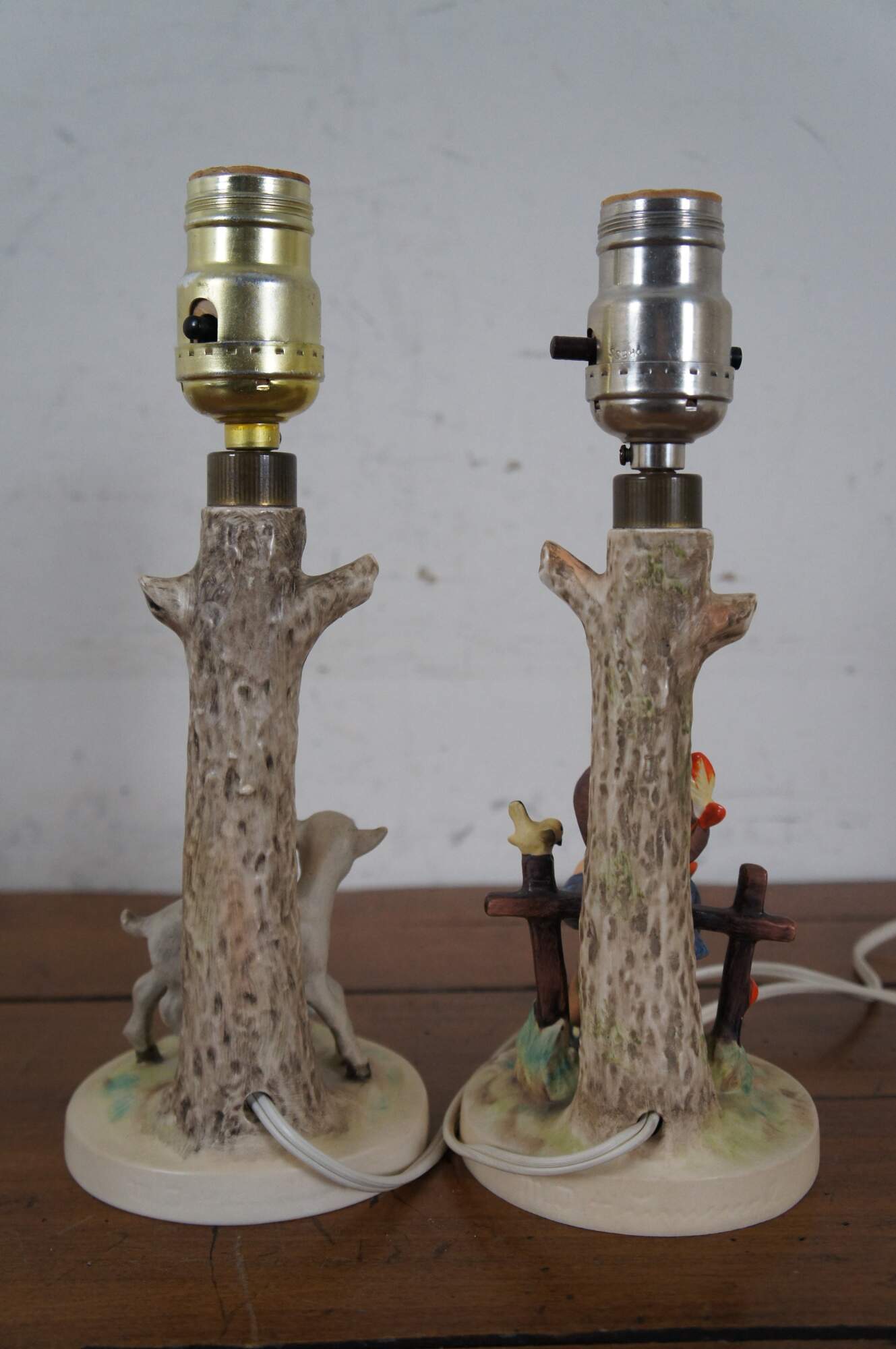 Pair of vintage mid century Goebel / M.I. Hummel porcelain table lamps, number 227 titled “She Loves Me” and number 228 titled “Good Friends.” Bases show incised item numbers, stamped TMK-3 Stylized Bee mark (1960-1972), and sticker from Allen Jewelers. Includes shades.