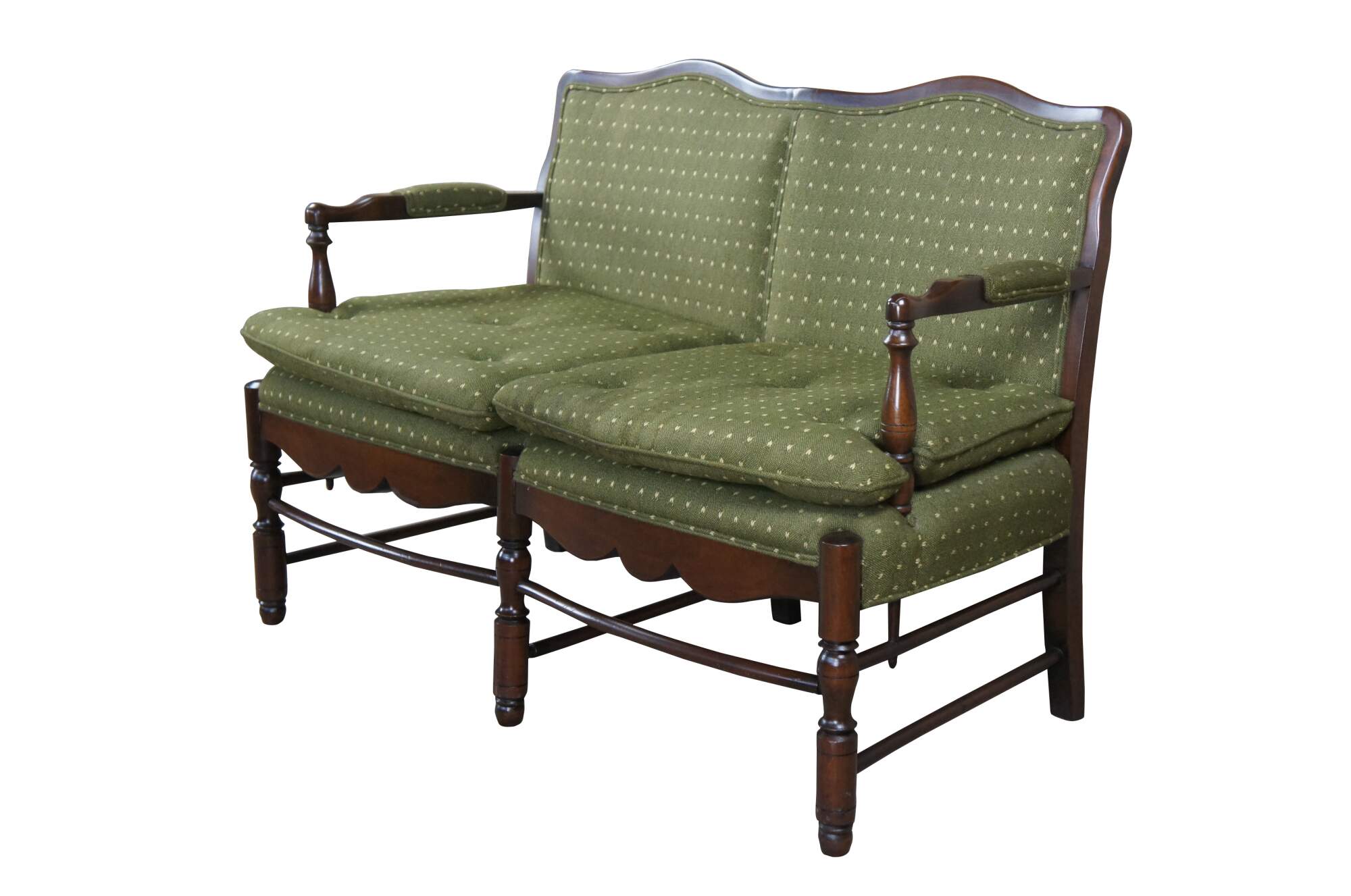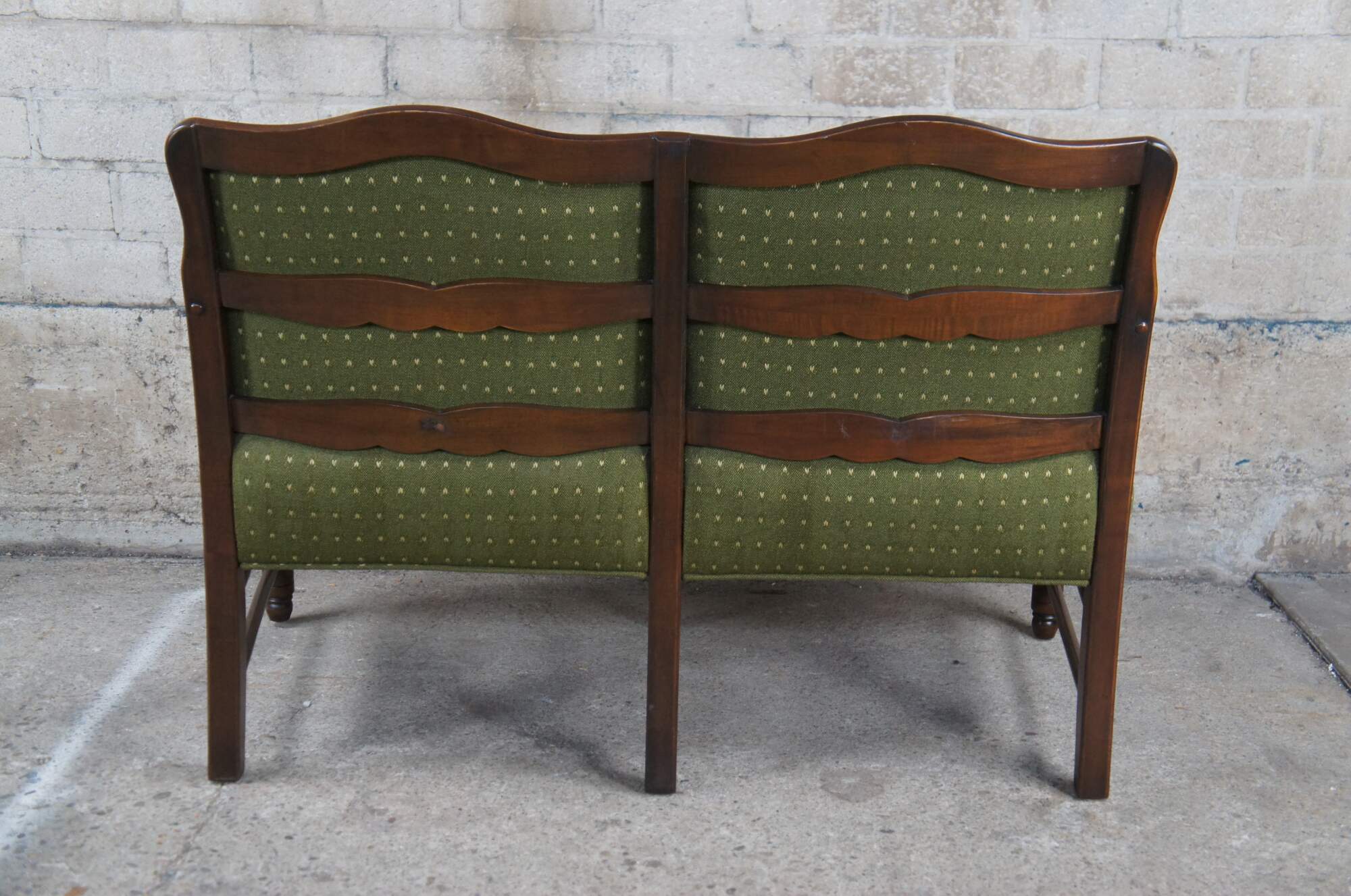 Vintage Country French ladderback settee, circa 1970s. Features an oak frame with serpentine back, padded arms and skirt. Upholstered in a green speckled fabric with two tufted removable cushions.