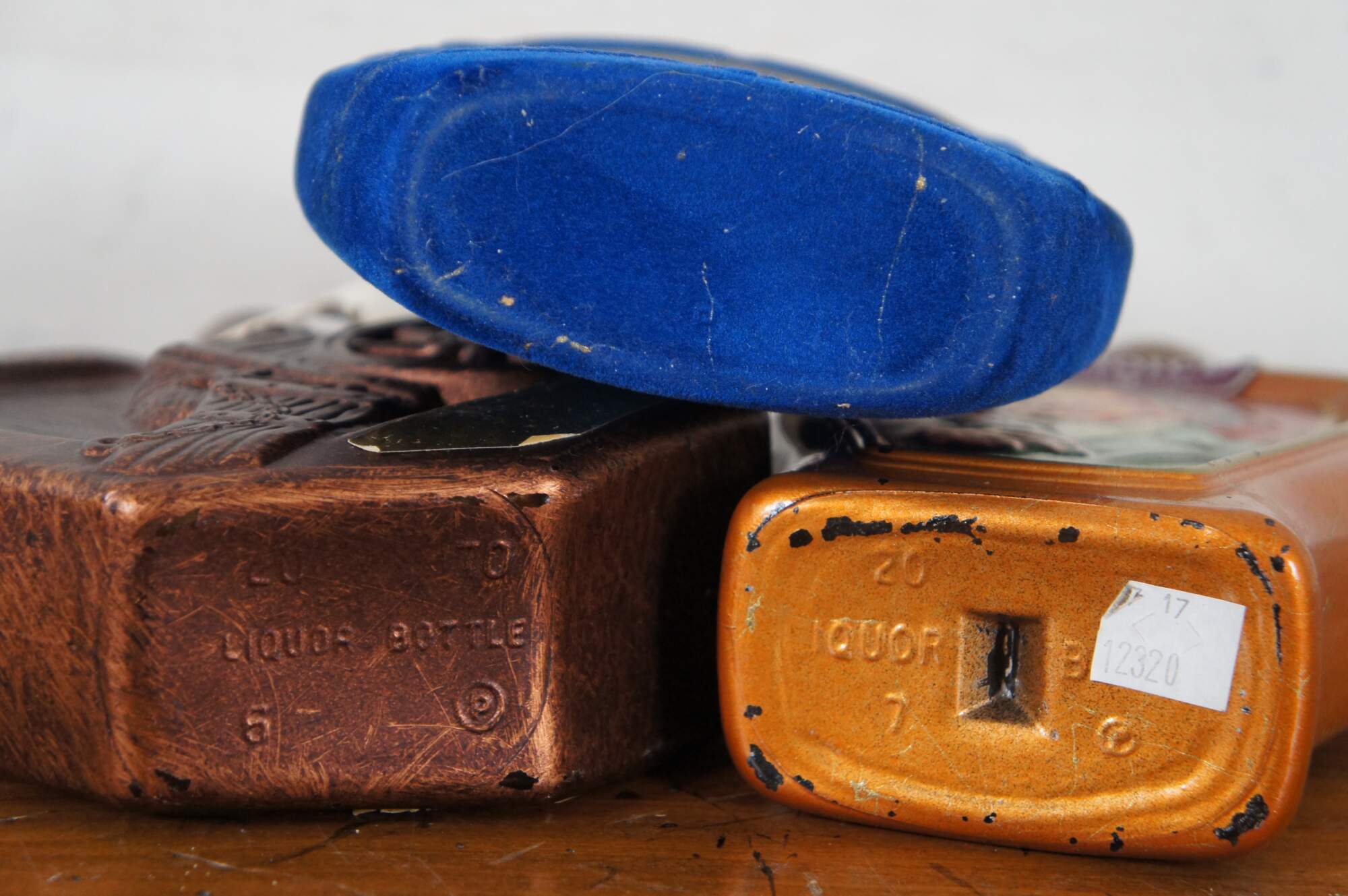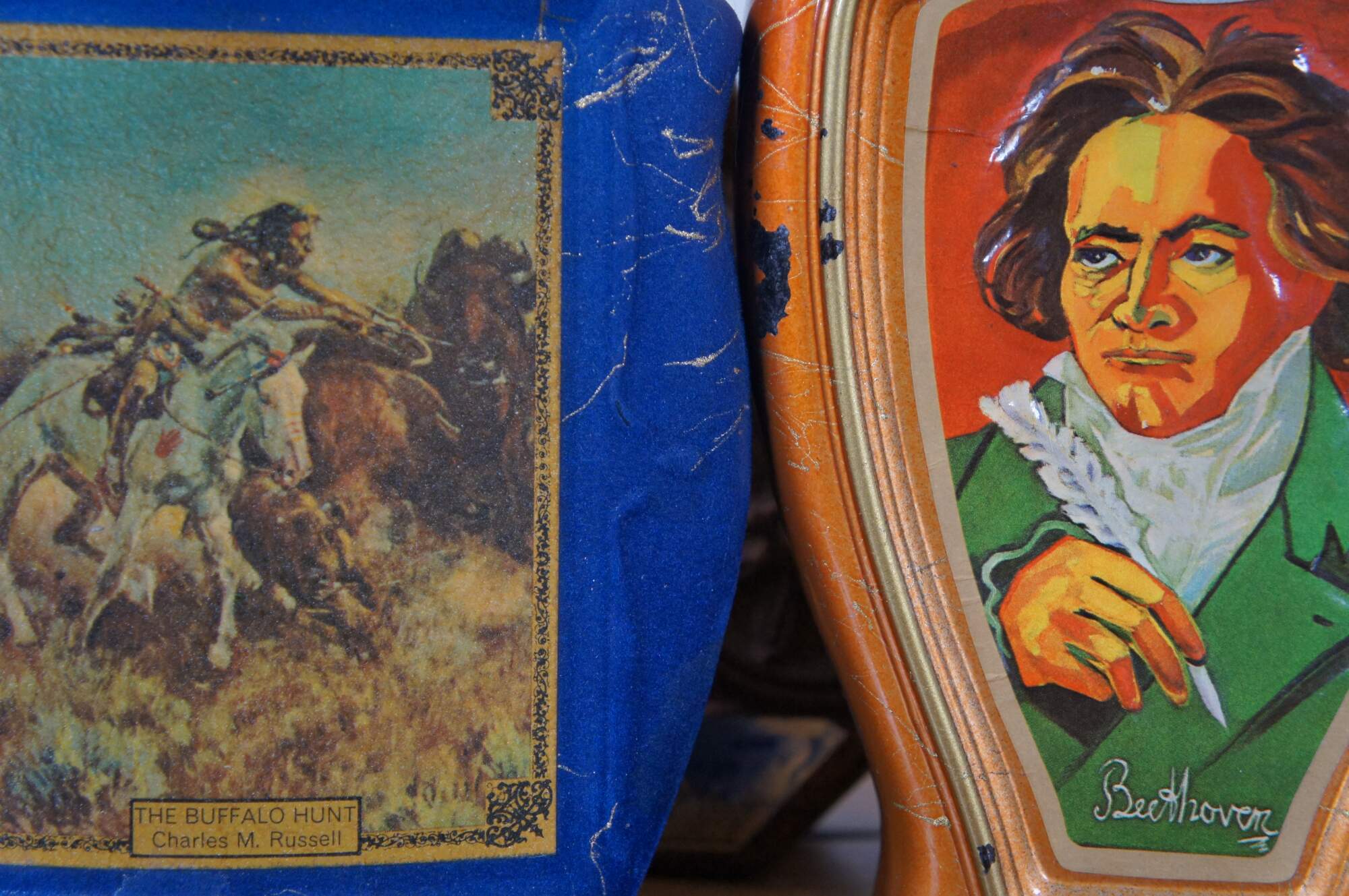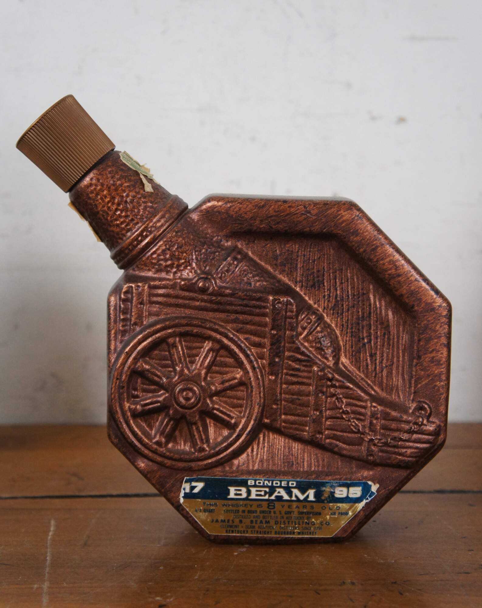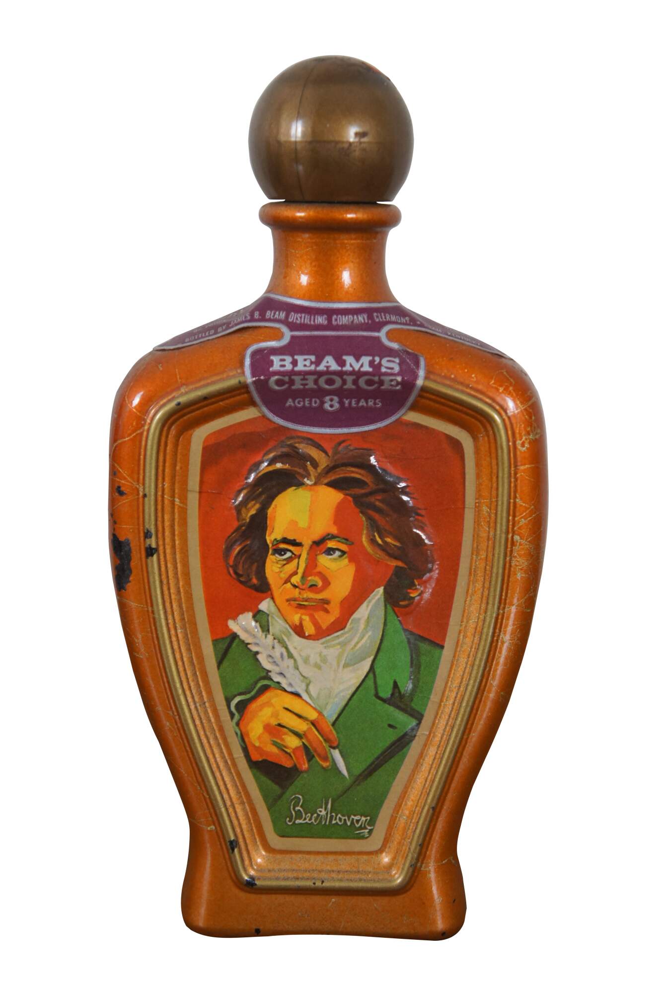 Lot of three vintage empty Jim Beam Whiskey collector’s bottles. Includes Beam’s Choice 8 Year blue velvet and gold splatter painted bottle featuring a print of The Buffalo Hunt by Charles M. Russell, Beam’s Choice 8 Year orange and gold splatter painted bottle featuring a portrait of Beethoven by Edward H. Weiss, and Bonded Beam 8 Year metallic bronze painted octagonal bottle molded with the image of a Revolutionary War era cannon.