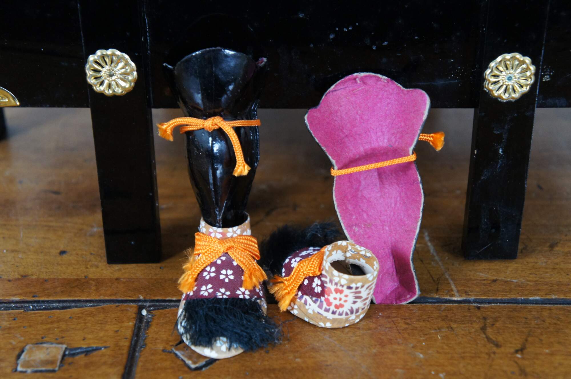 Vintage set of Japanese samurai doll armor in orange and gold, designed to perch on the edge of the black lacquer campaign style storage box with floral gilt metal corner pieces and medallions.