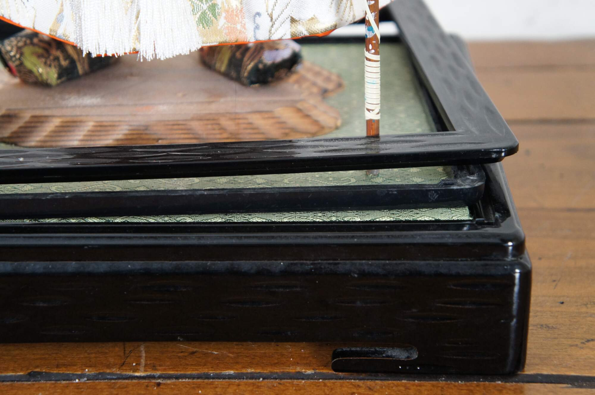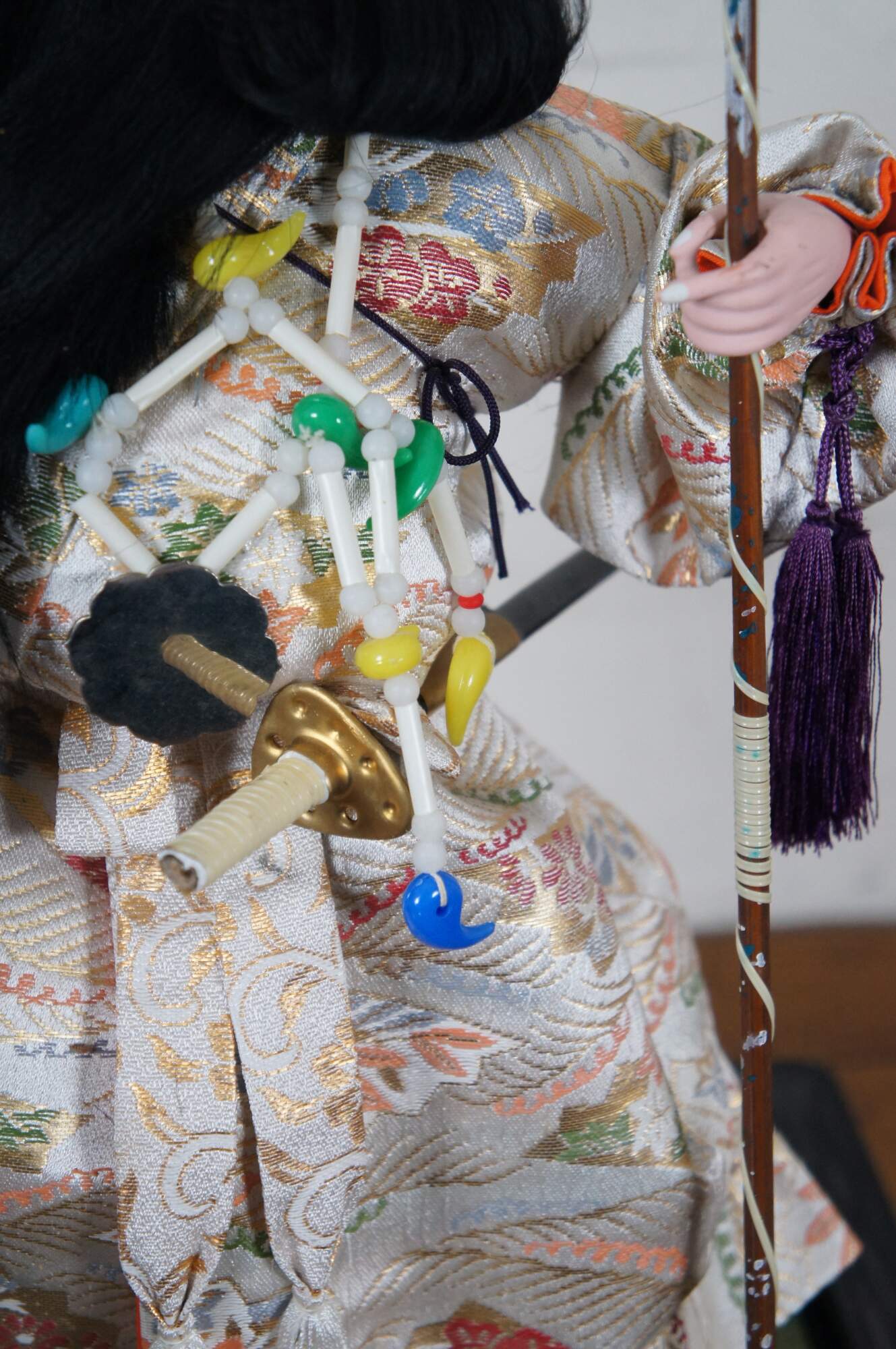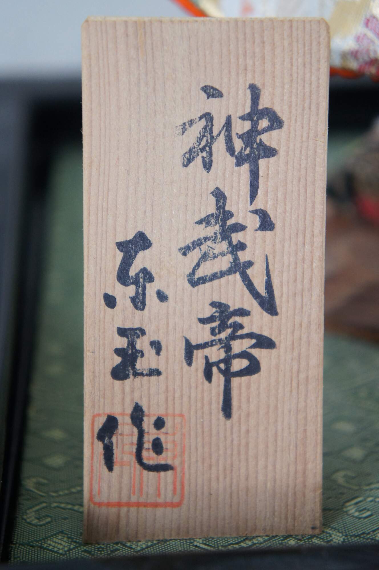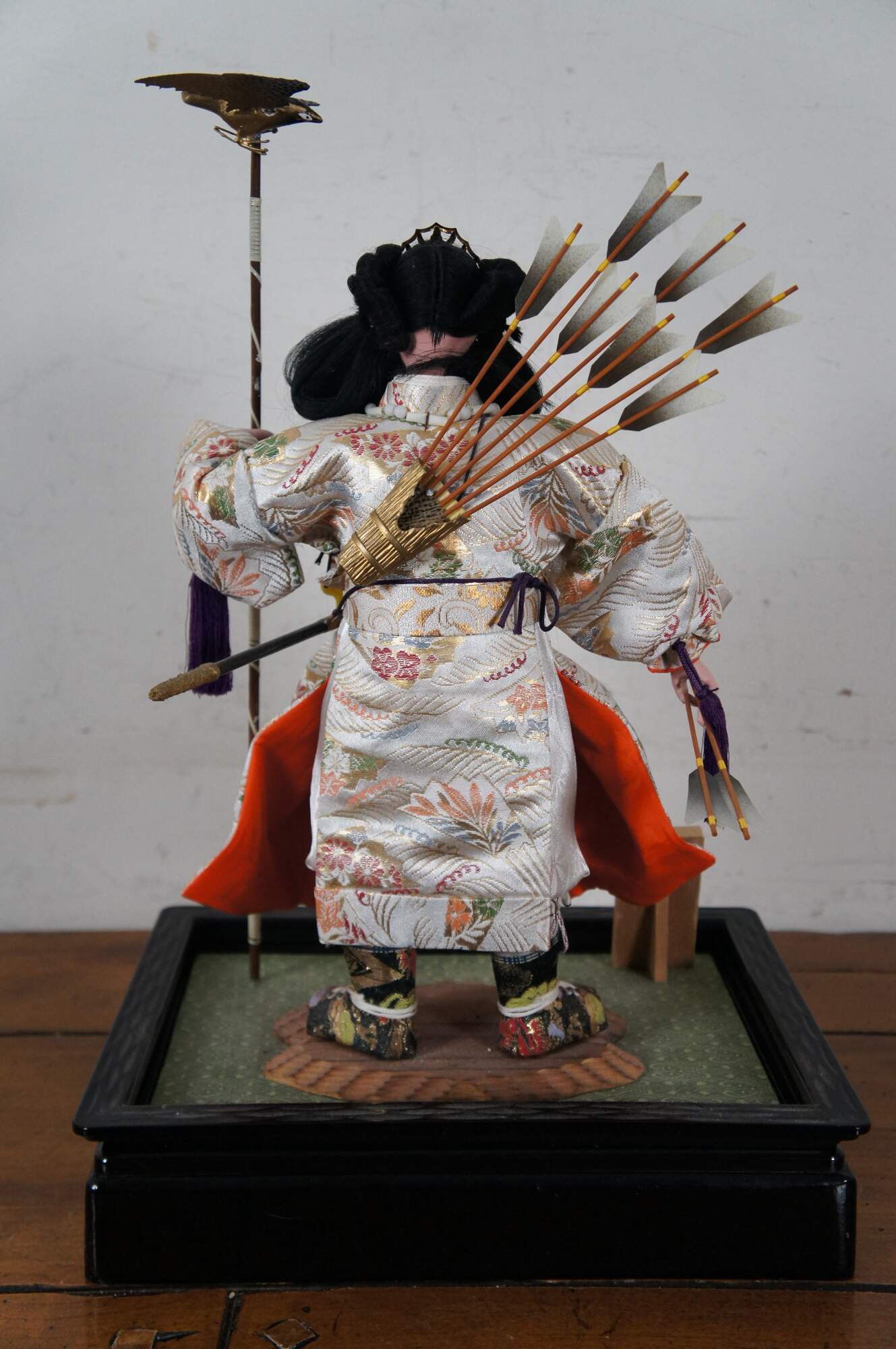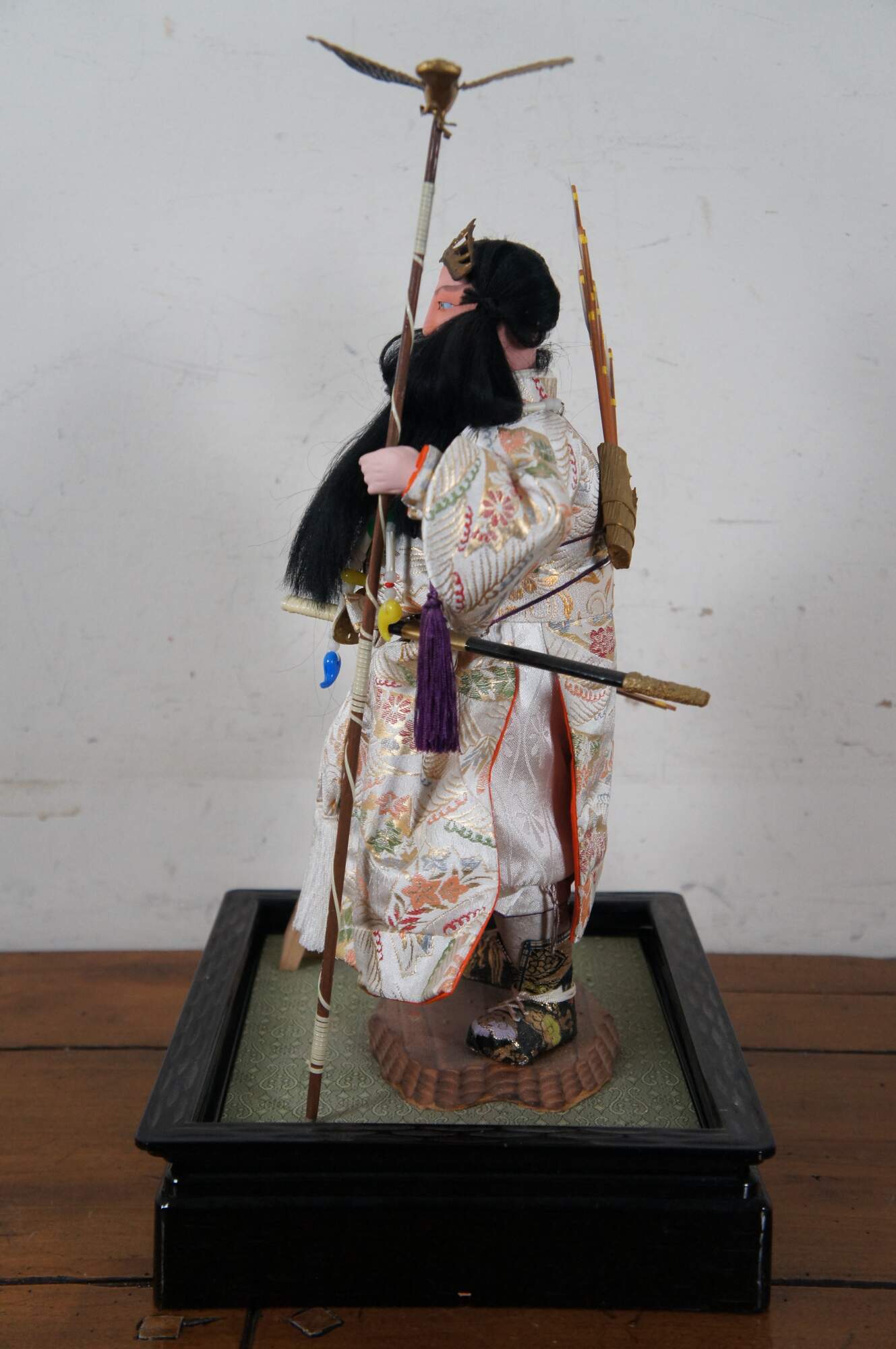 Vintage doll / figurine portraying Jinmu Tenno – Japan’s legendary first emperor. The doll is crafted with un-glazed porcelain / bisque head and hands, painted features and a lovely white silk robe. The Emperor wears a quiver of arrows on his back, and white beads around his neck, carries an arrow in one hand, and a staff topped with a flying eagle in the other; a magical sword hangs at his side and a golden diadem sits on his long dark hair. The stand is black plastic (mimicking lacquer) with a green surface and a small section of brown rock where the Emperor stands. A small wood plaque is mounted in the front corner.