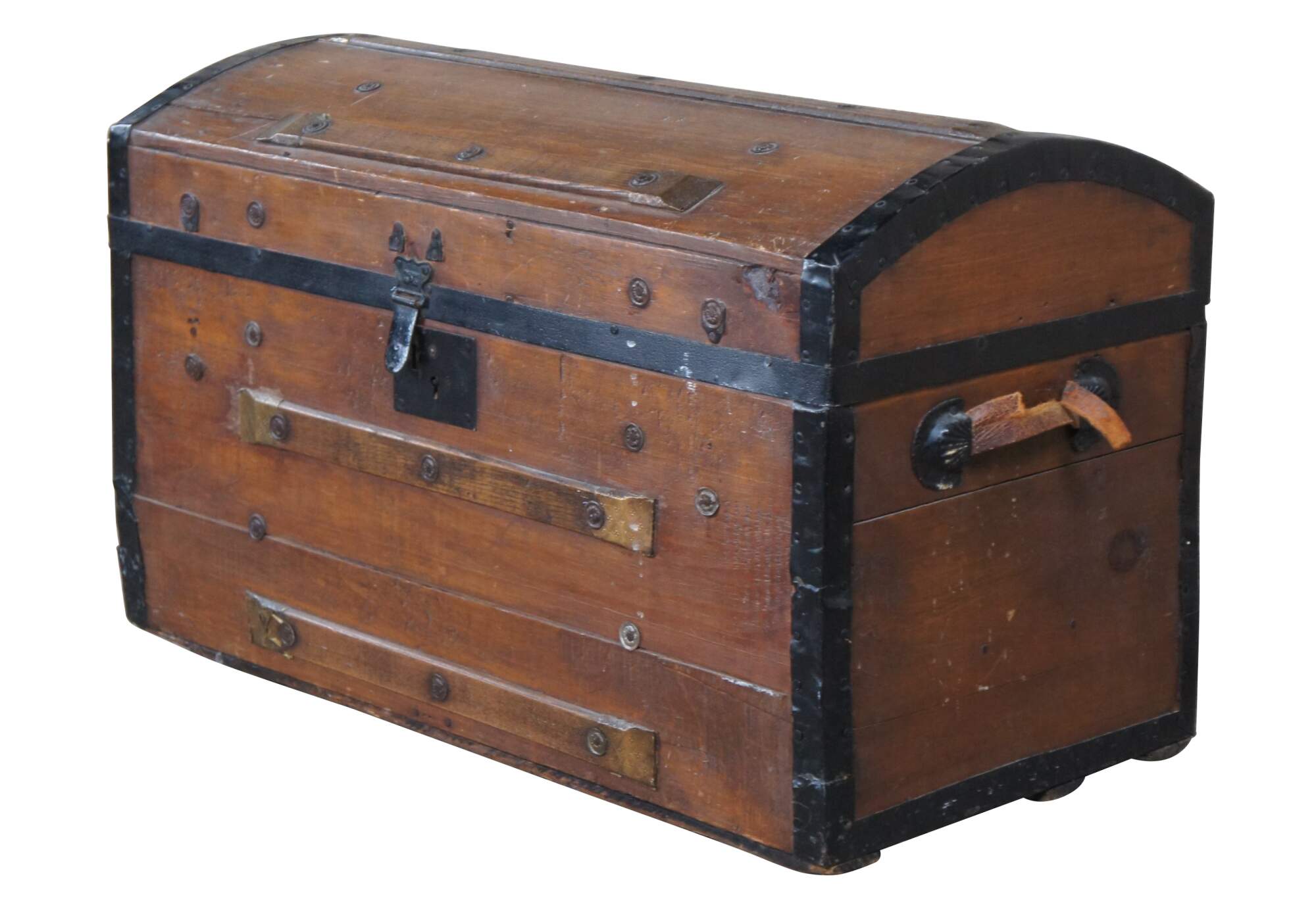 Fair condition, wear and distressing, marking, splitting, damage to metal, damage to handles, no key.