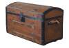 Antique pine trunk featuring domed top with metal banded edges and flower power lining.