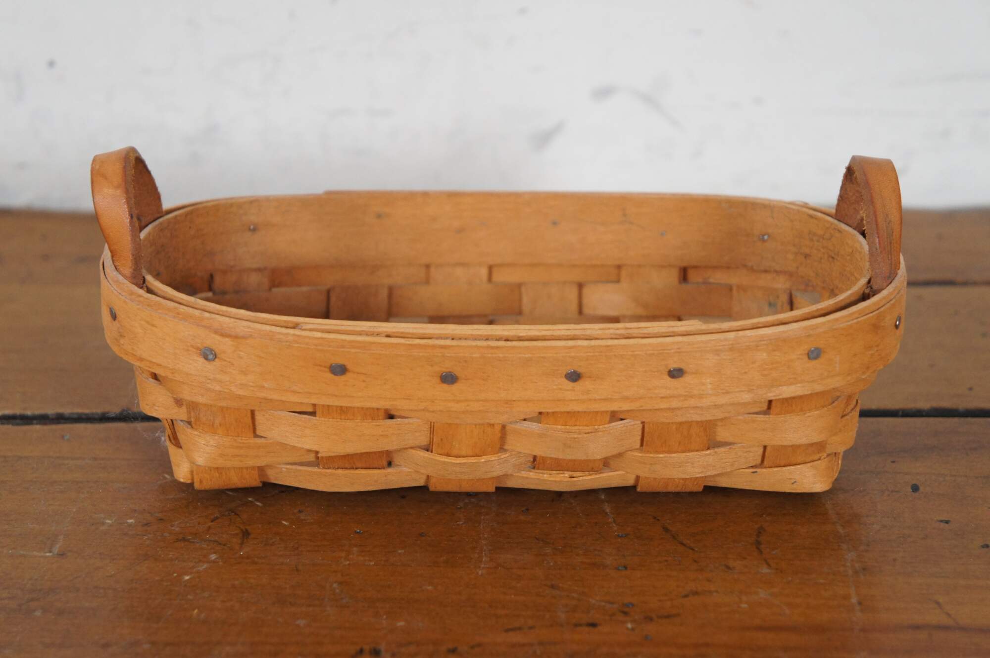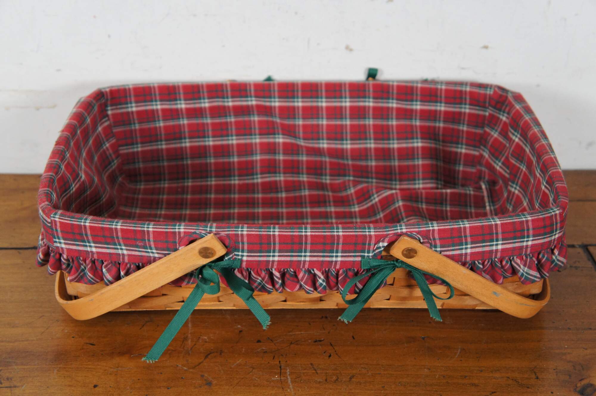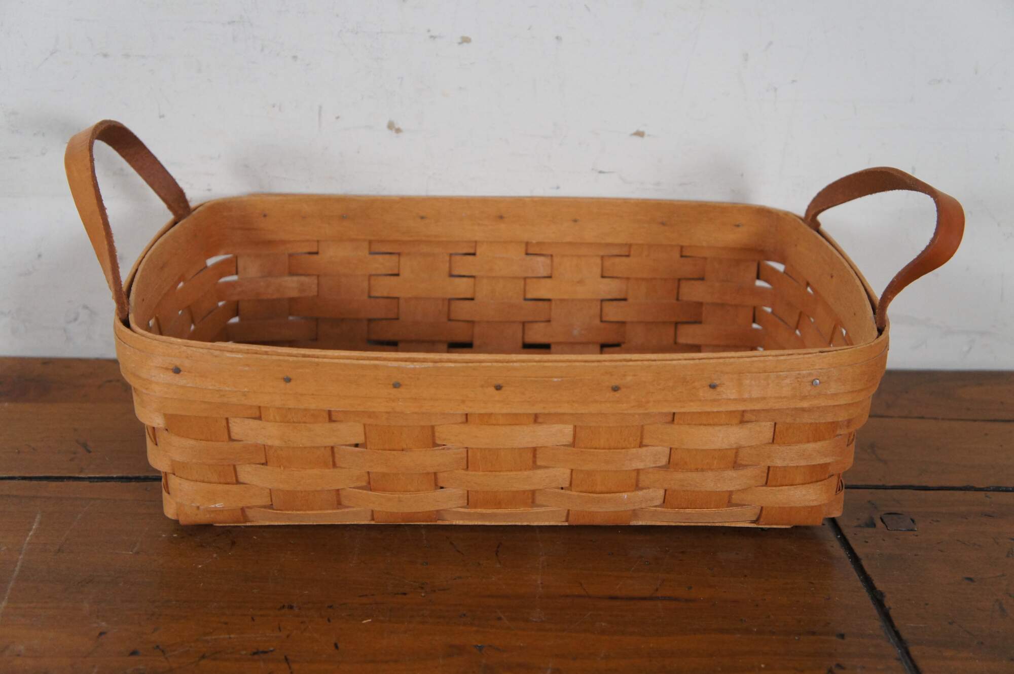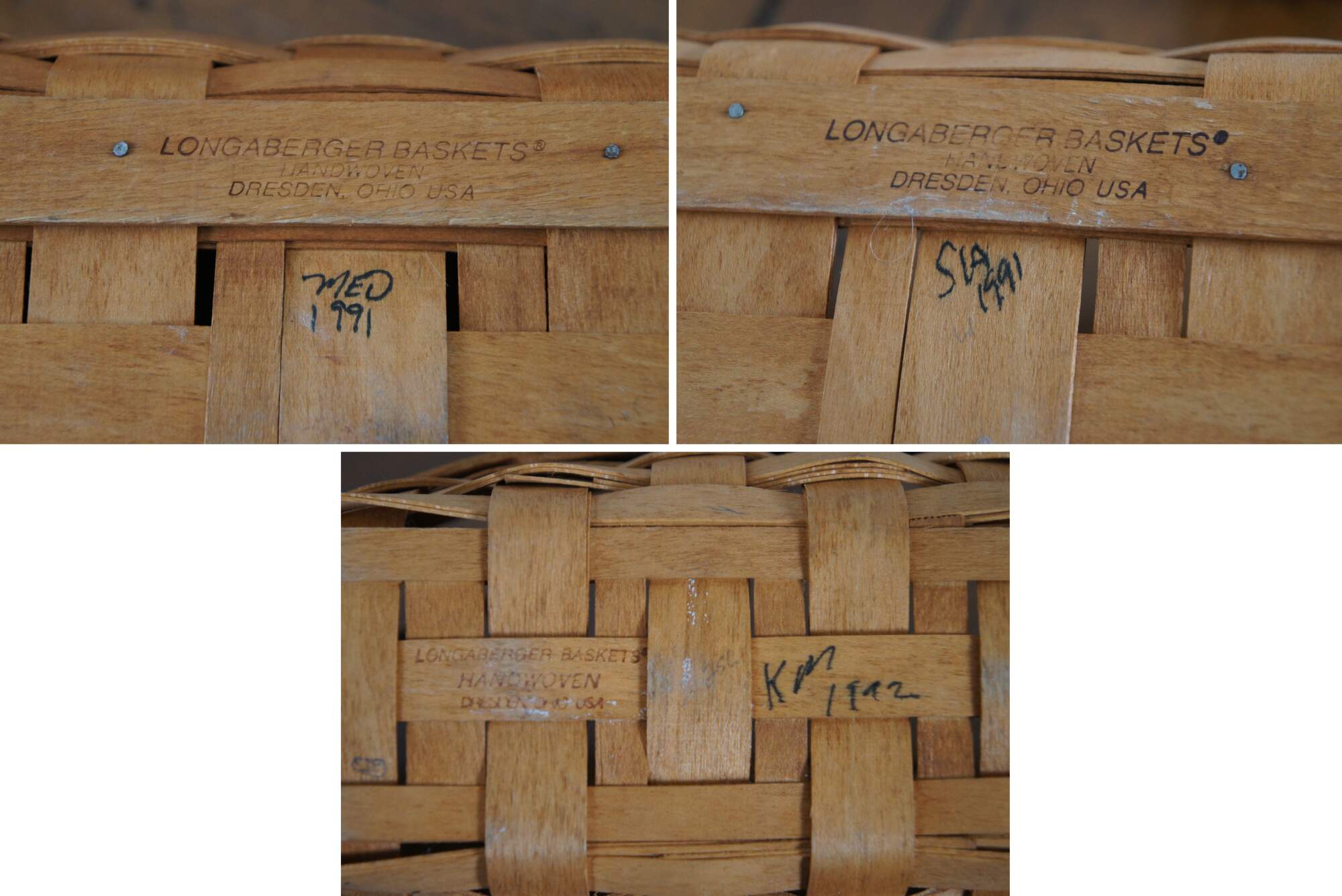 Lot of 5 vintage Longaberger rectangular handwoven maple market baskets. Largest: 1993 Christmas Collection Bayberry Basket with two rotating bail handles and plaid cotton liner; signed US 1993. Next largest also has double rotating bail handles; signed 7K 1994. Of the two medium baskets one is without handles and the other has leather handles; signed MED 1991 and SIA 1991. Smallest basket has leather handles; signed KM 1992.