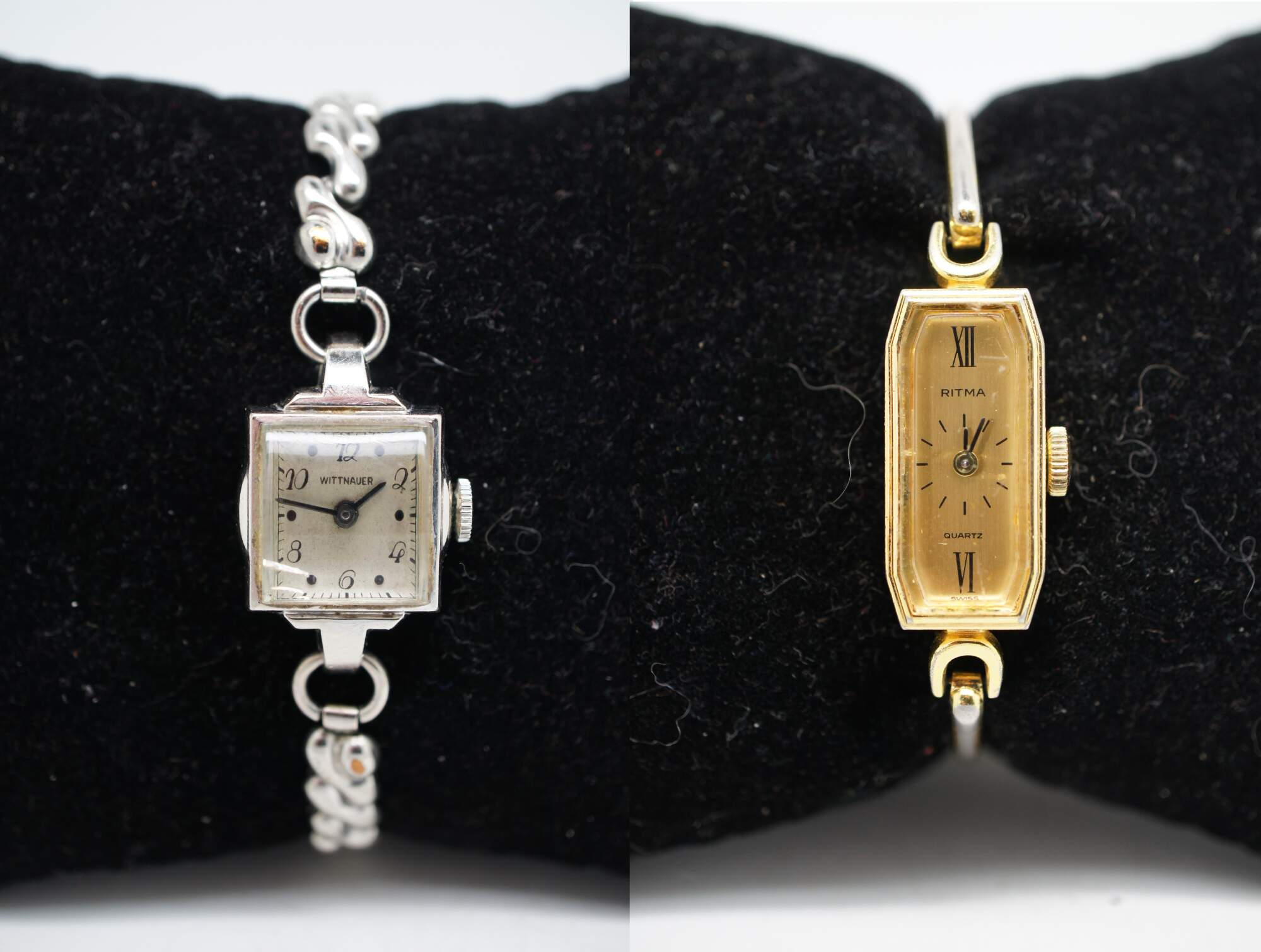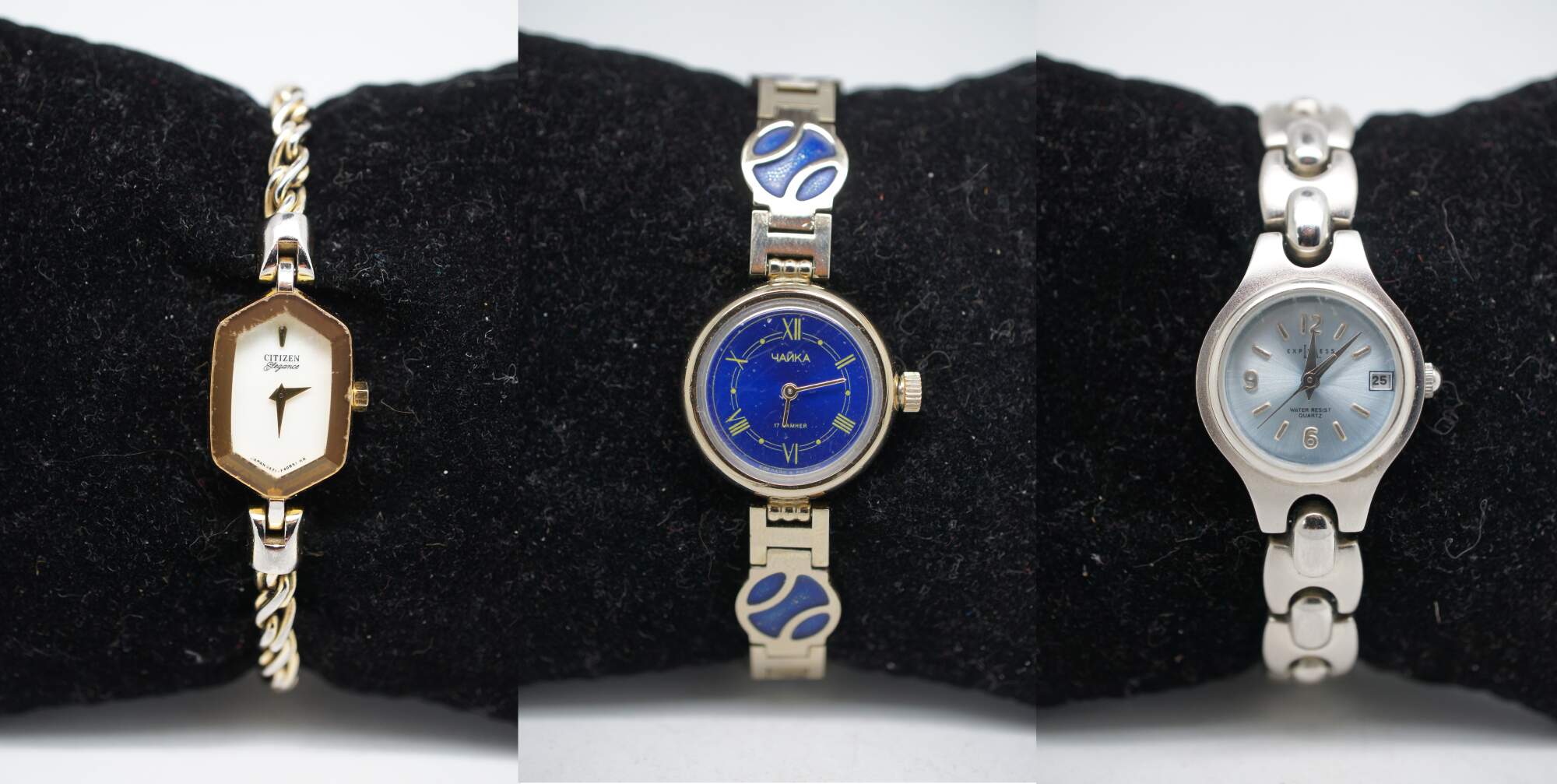 Lot of 11 vintage ladies watches, ten standard wrist watches and one clip on watch. Lot includes Bijou Terner, K-2853L; Anne Klein, 10/4737; Carlo Rossi; Citizen Watch Co. Elegance, 5421-F41841 YO, 1050865; ЧАЙКА (Cajka); LA Express, LAX1336, 012, P022A; Wittnauer; Ritma; Seiko, 2E20-5029 RO, 5N0479; Bulova N2, U78880; and Le Coultre Staybrite 70934, Modele Depose.