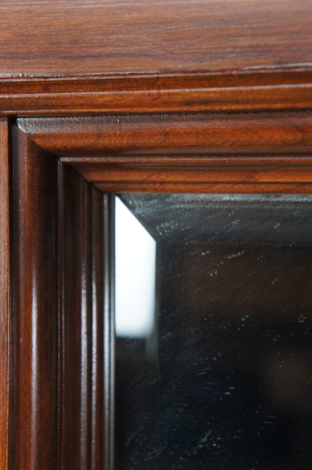 Late 20th Century English Georgian / Chippendale style over mantel or wall hanging mirror. Made from cherry with an open pediment, spire shaped finial, beveled glass and quarter cut reeded columns along the side.