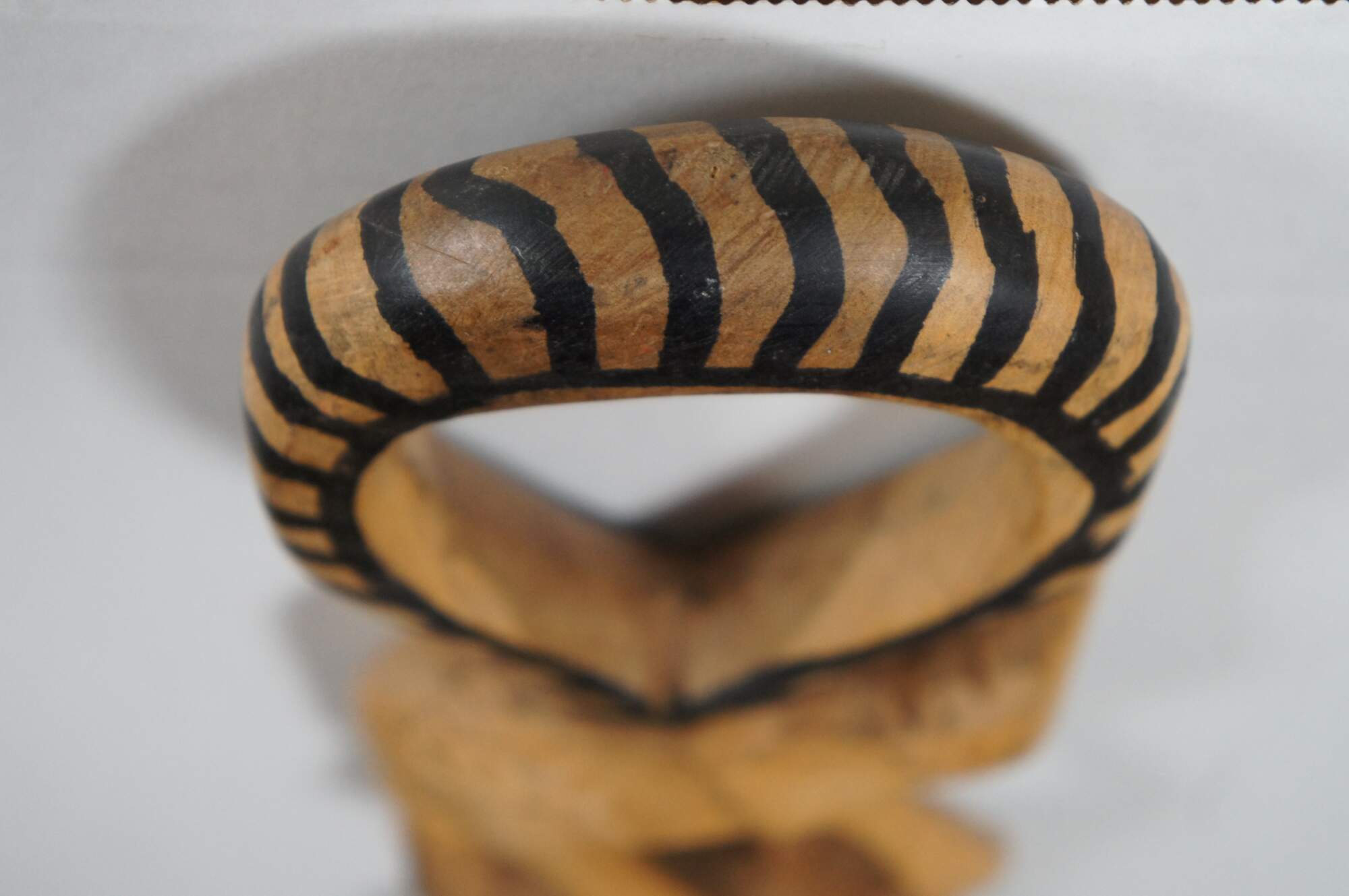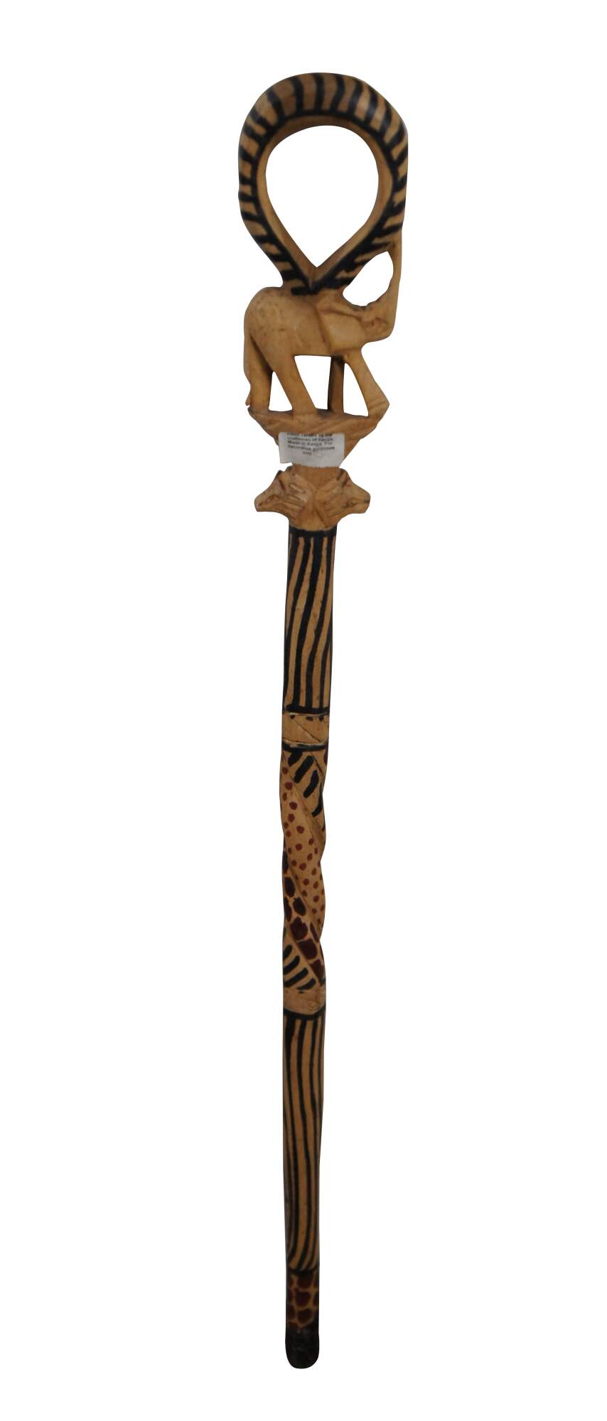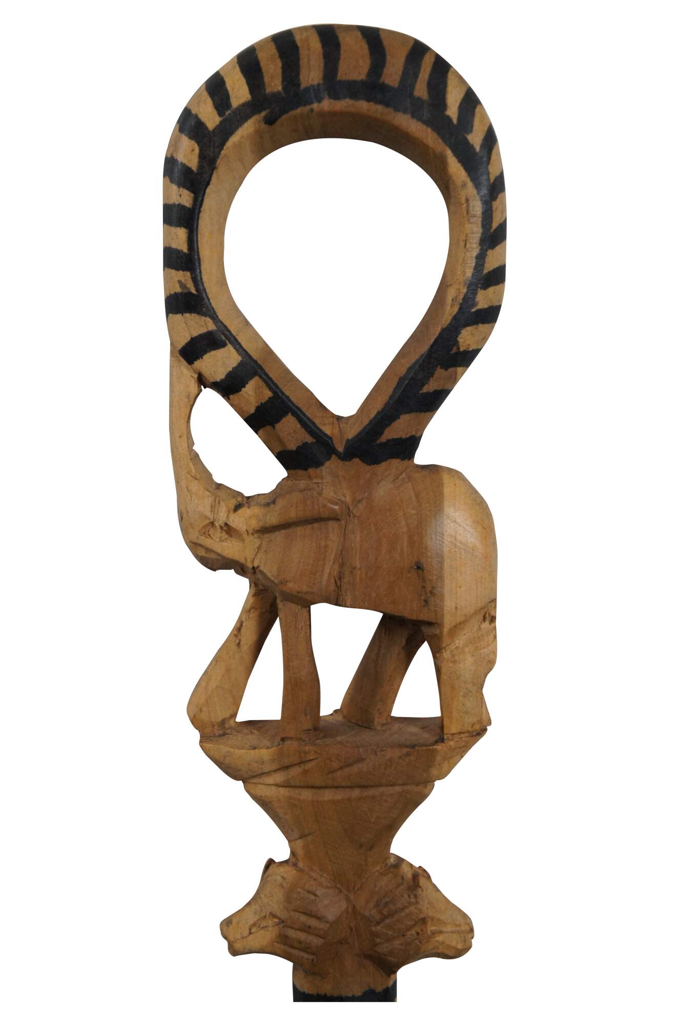 Vintage African folk art walking stick / cane, hand carved with a loop handle, elephant with trunk raised, pair of lion heads and twisted shaft, stained / painted with the stripes and spots of other native animals / giraffes. Hand carved by the craftsmen of Kenya. Made in Kenya.