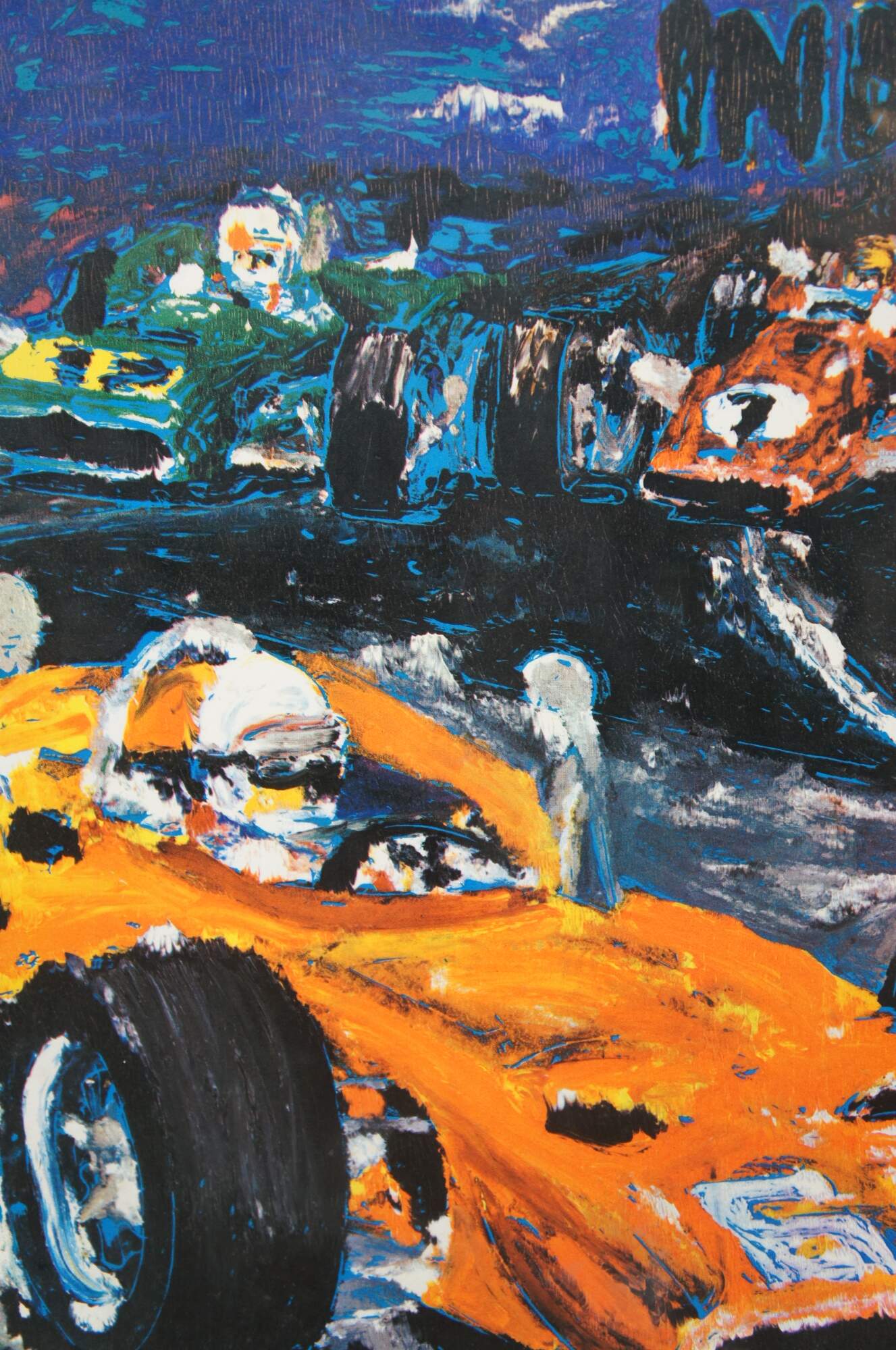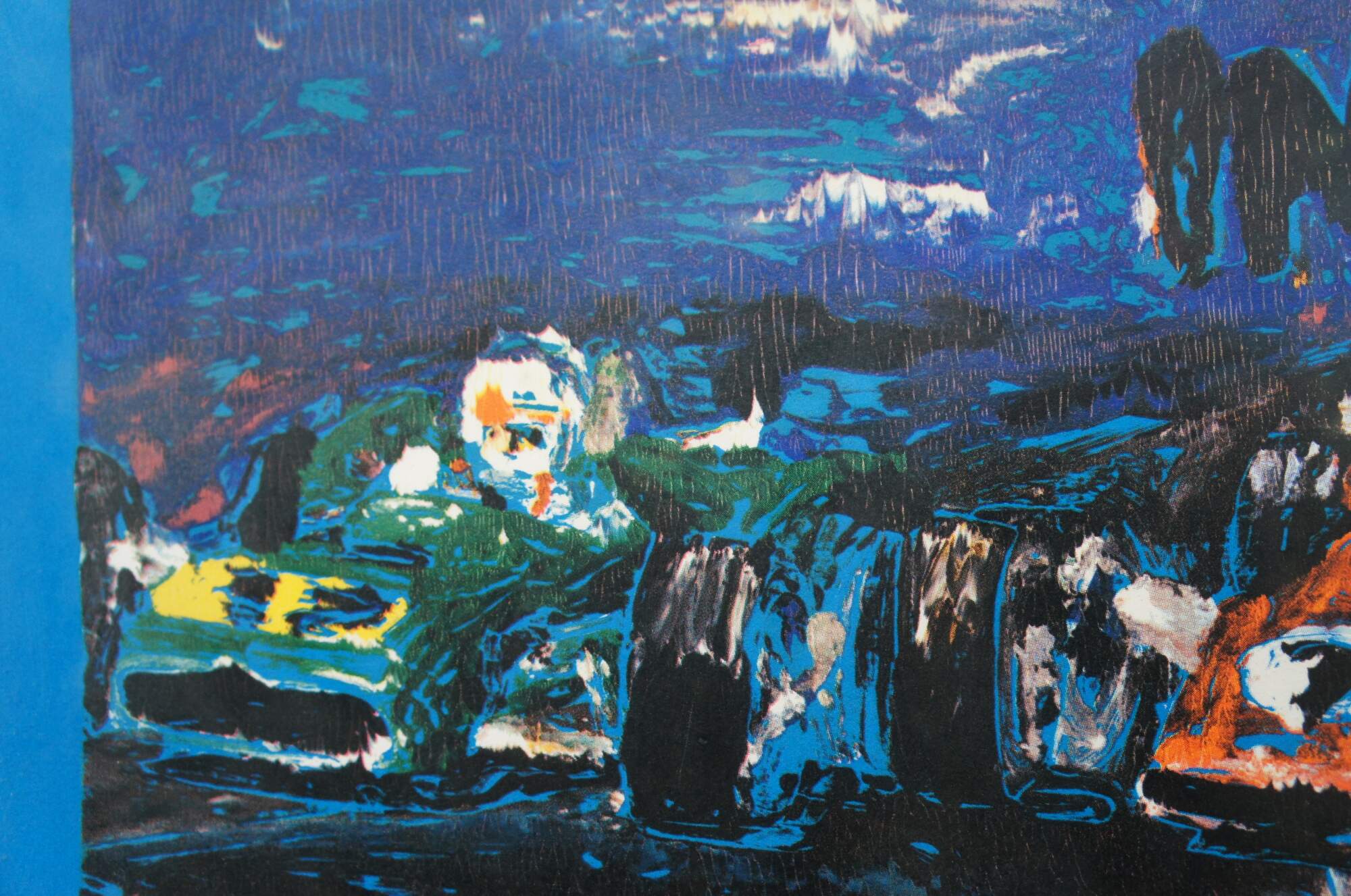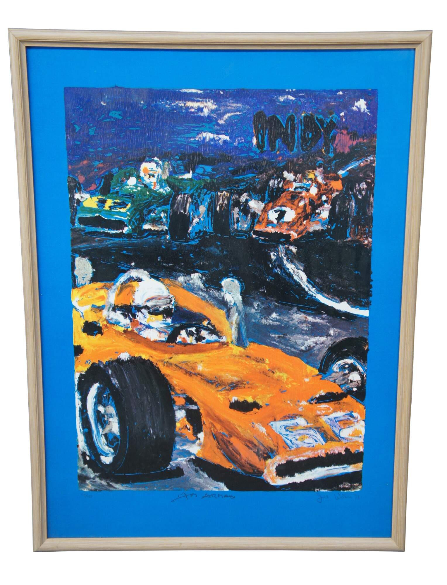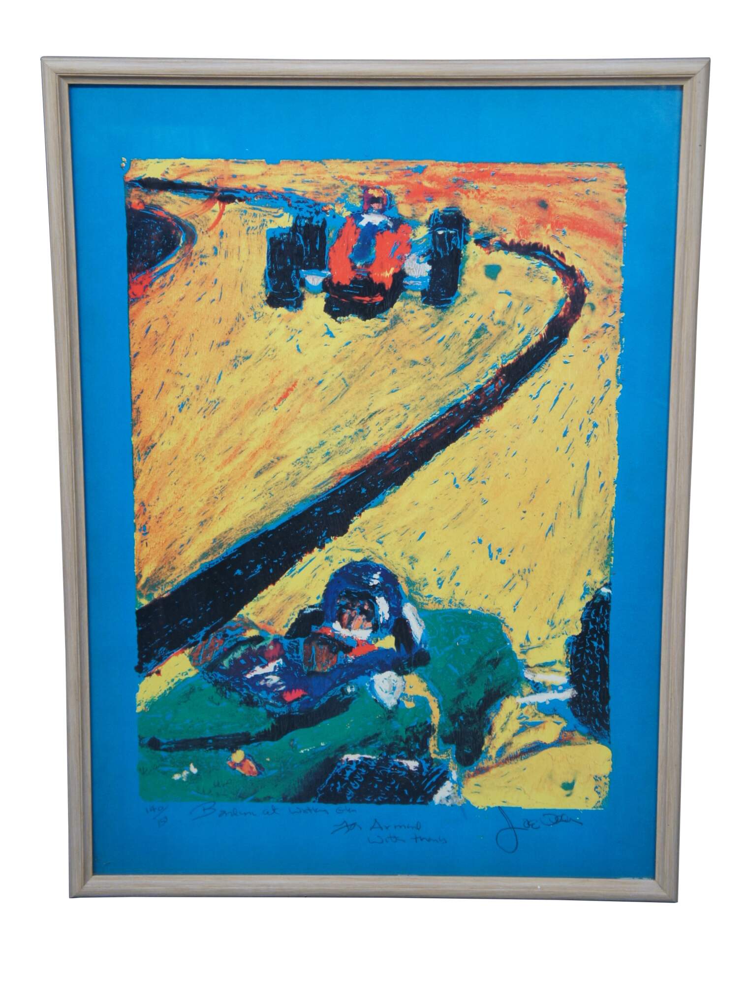 Two vintage Joe Wilder racecar prints. One signed 1971, to Armand; the other signed 140/150, Bonlini at Watkin Glen (Watkins Glen Grand Prix 1971), for Armand with Thanks.