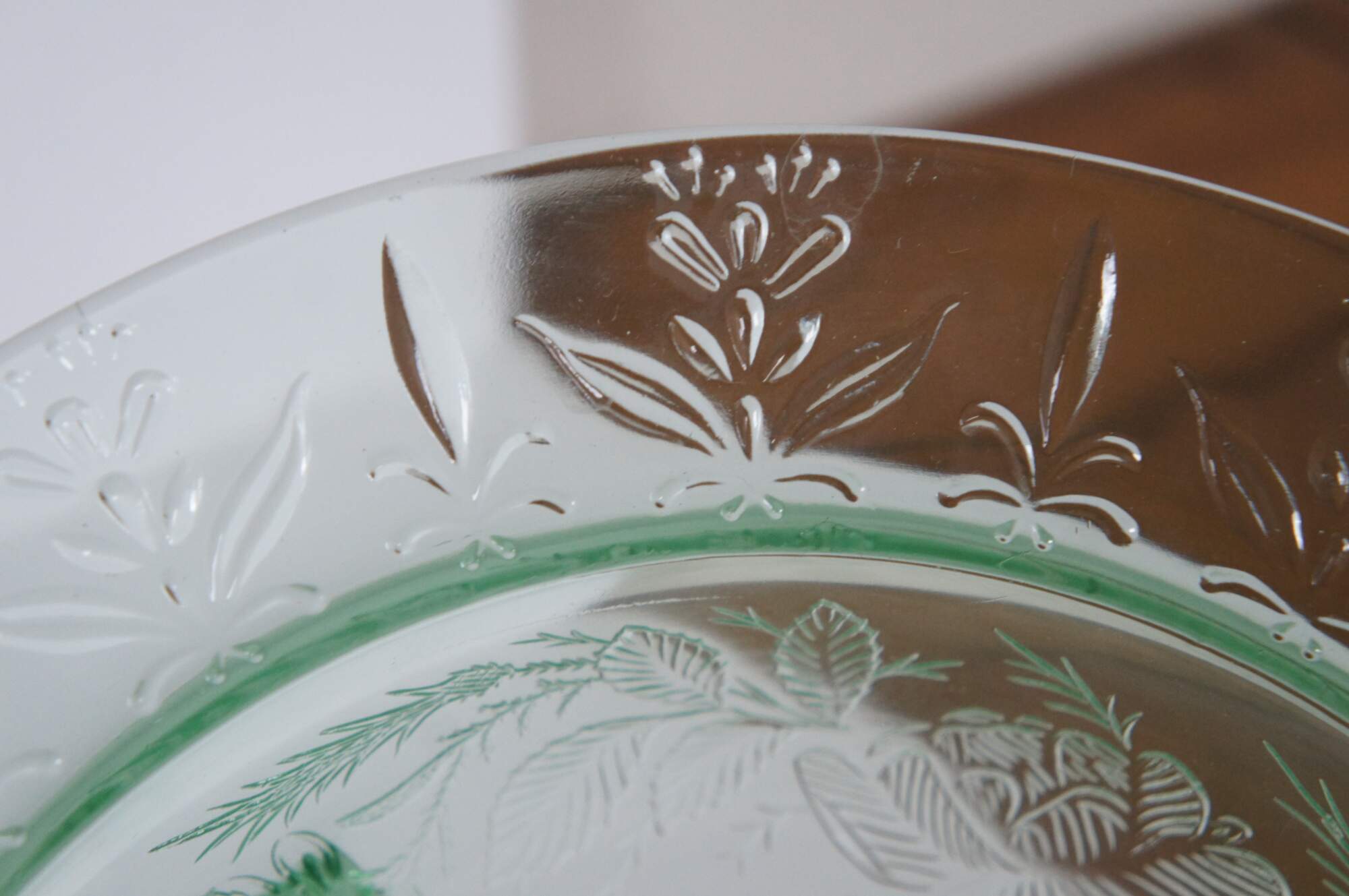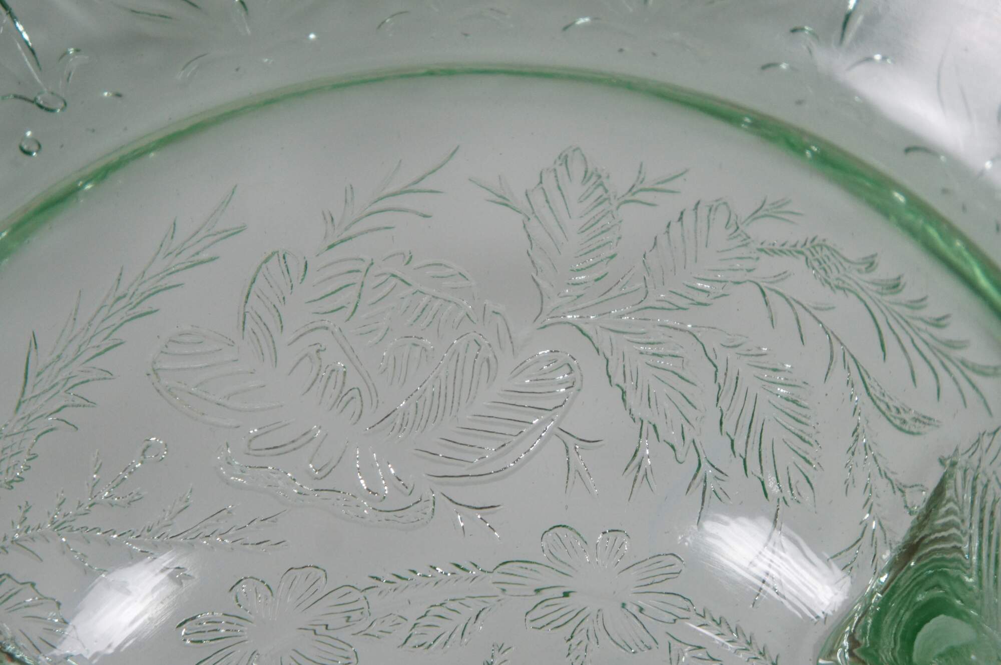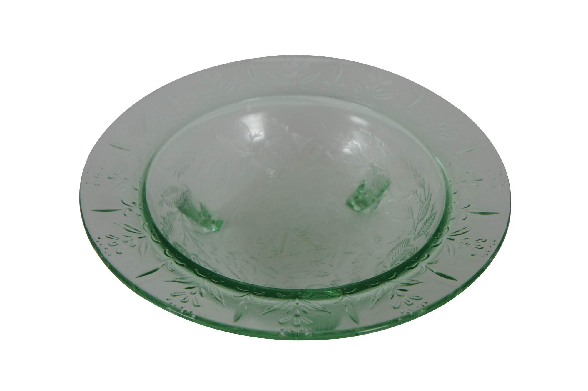 Circa 1930’s pressed uranium glass centerpiece bowl, transparent in color with a grass green tinge. Decorated throughout with a floral and foliate design and three fluted feet. Attributed to Federal Glass. Glows green in blacklight.