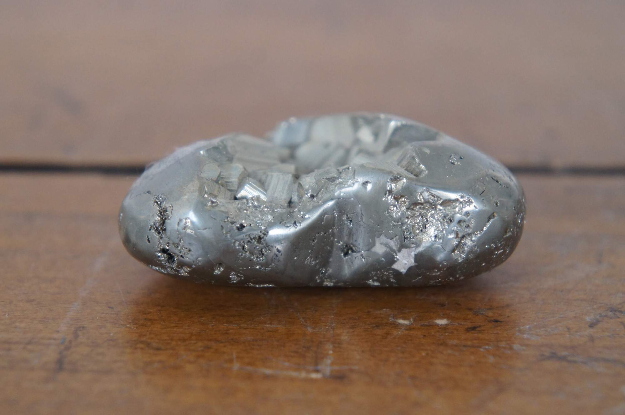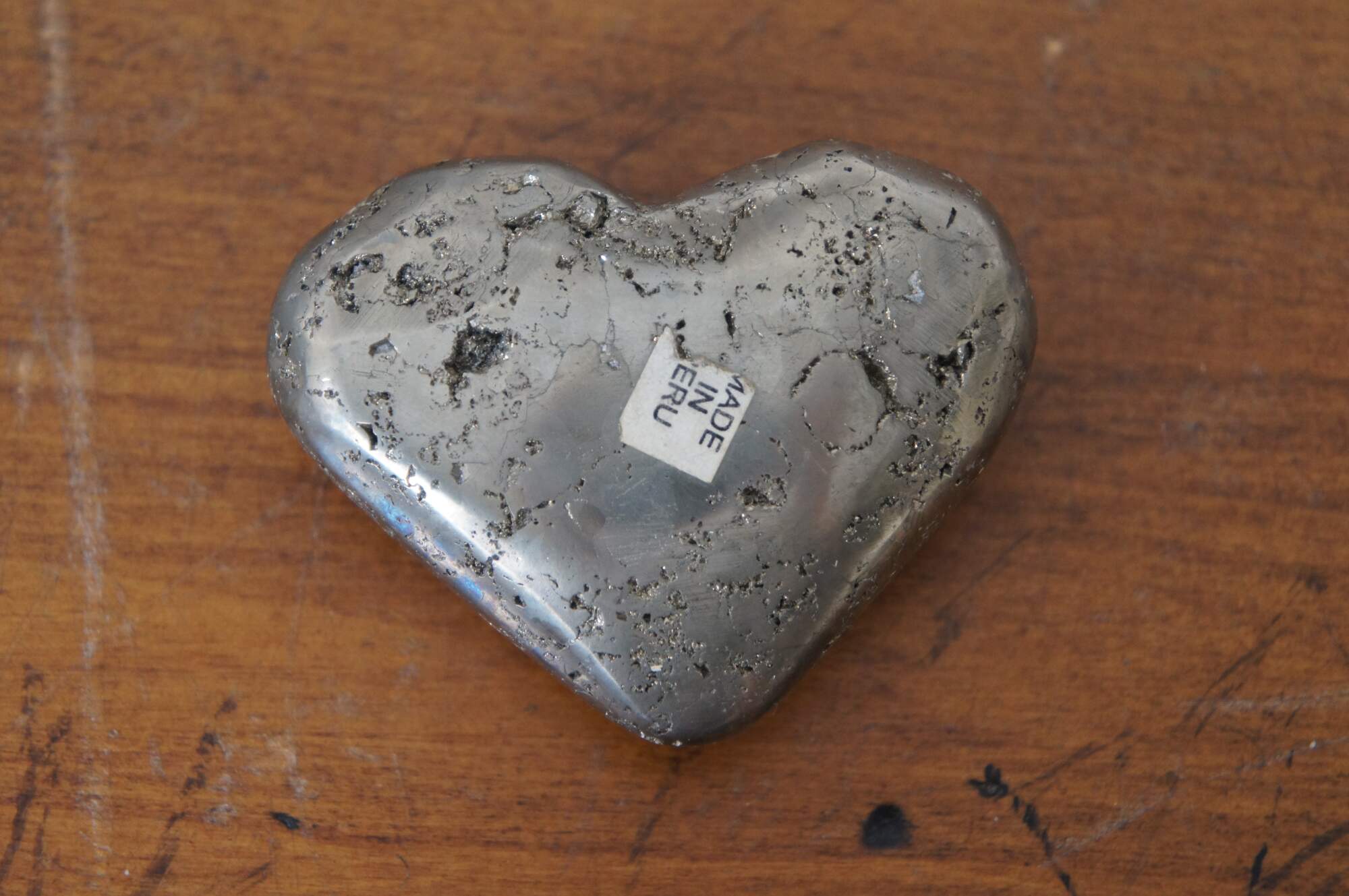 Vintage silver pyrite (aka Fool’s Gold) paperweight / hand cooler / healing stone, carved and polished in the shape of a heart with the center open to reveal the crystallization of the ore. Made in Peru with love.