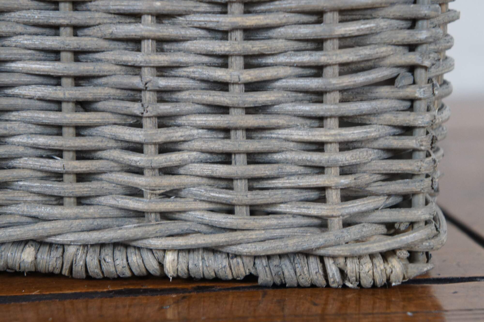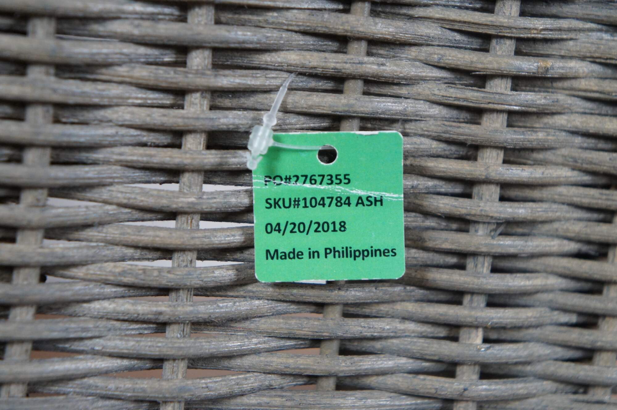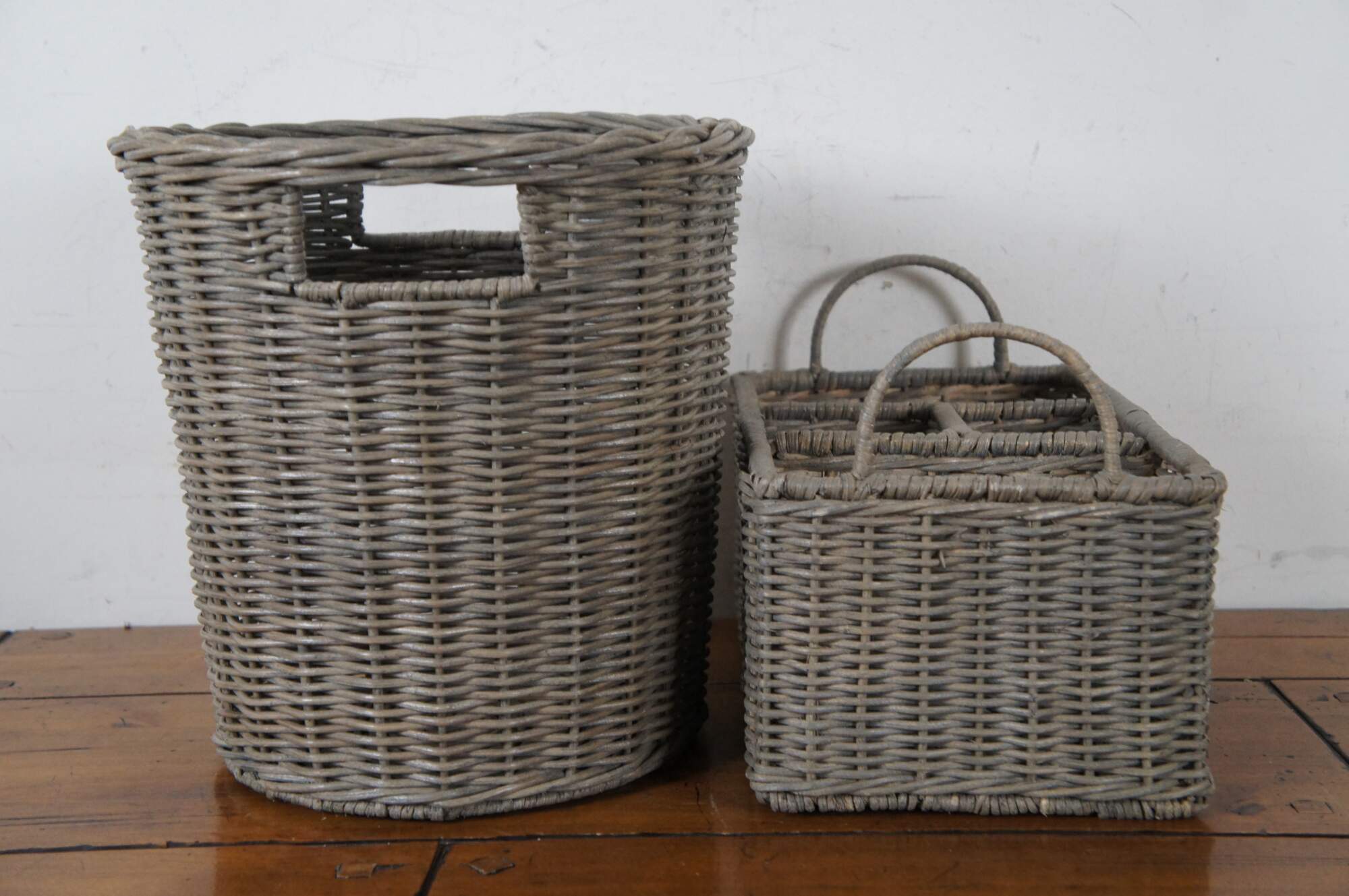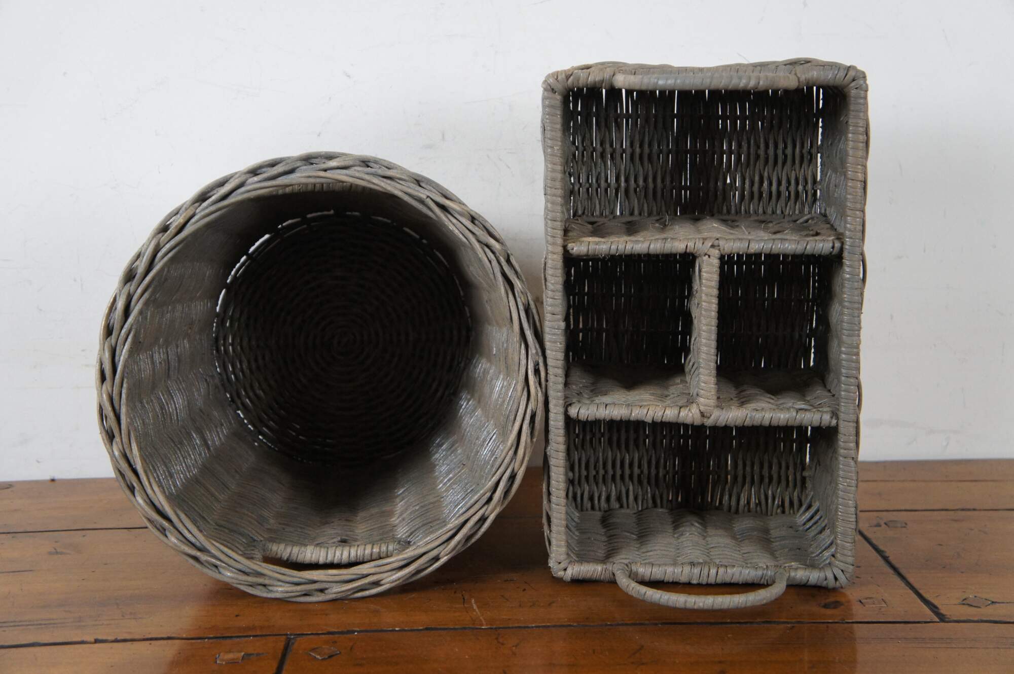 Both are woven from natural rattan with gray Ash finish. Waste basket / trash can is cylindrical with two cut out handles. Caddy / organizer is rectangular with two raised handles and four divided sections. Original Prices $99.00 / $89.00.
