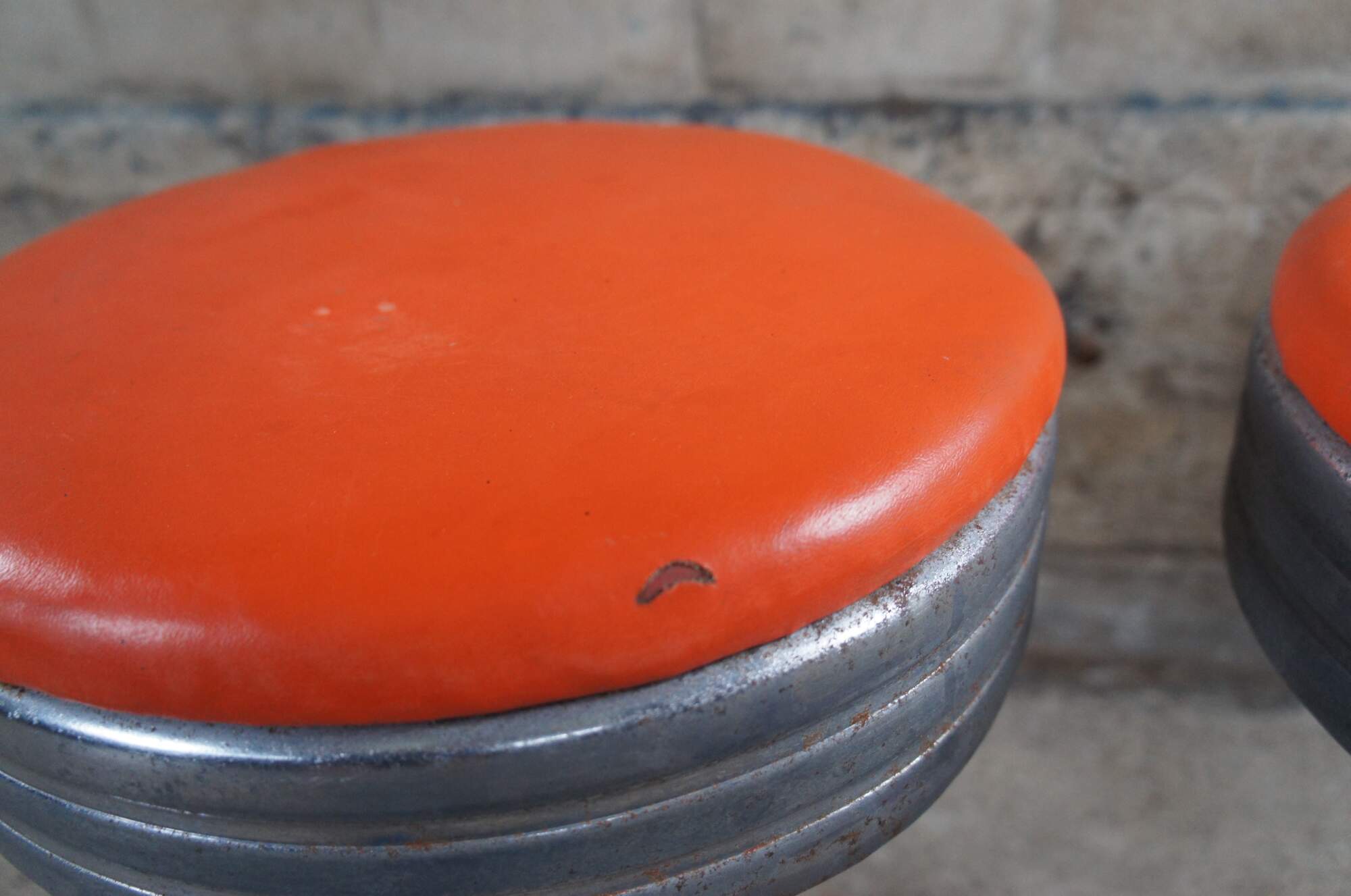 Pair of Late Art Deco Retro Soda / Fountain stools. Made from chrome with a cast iron base and orange seat. Each stool swivels.