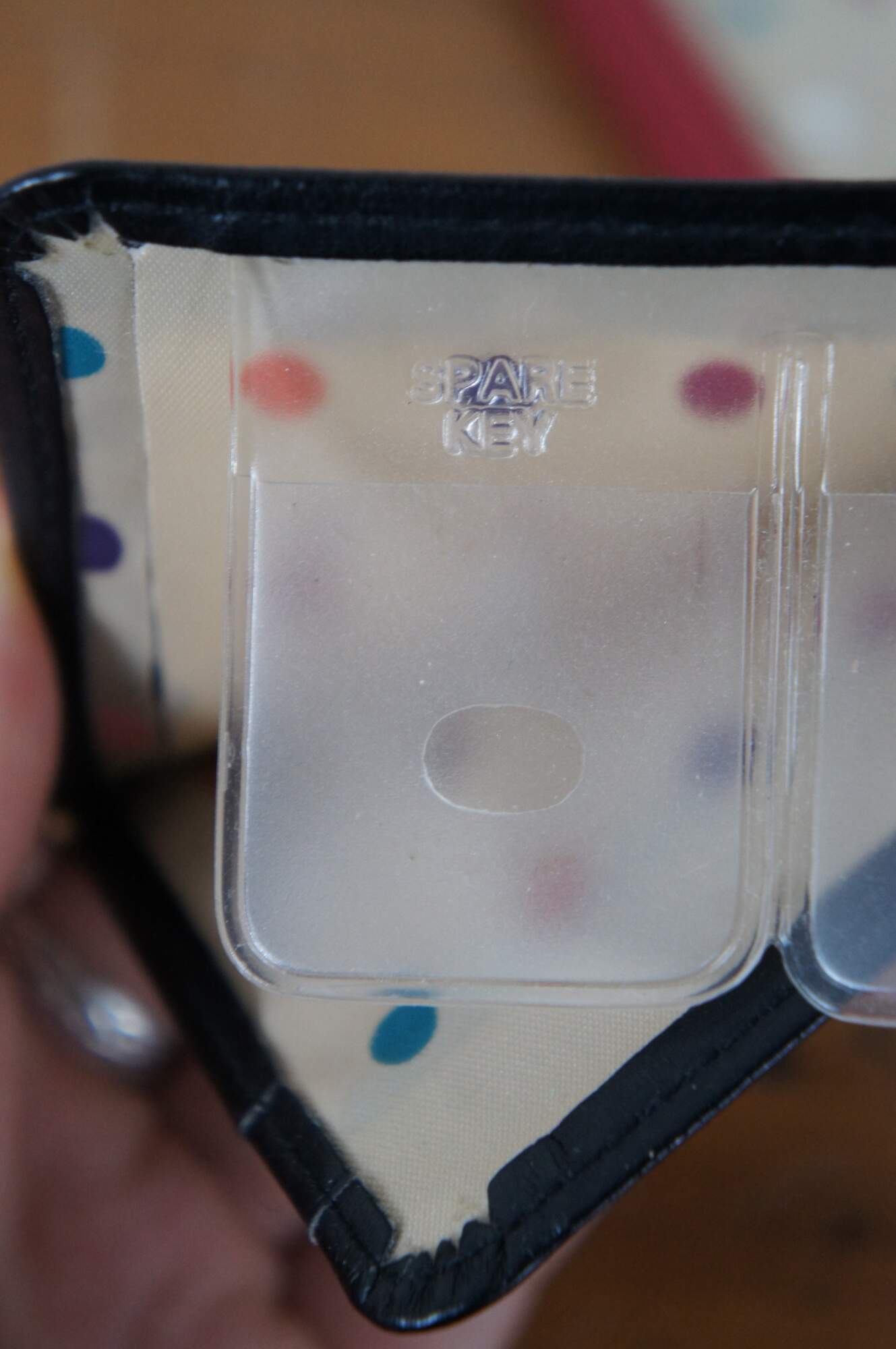 Pair of Buxton ID / business card / credit card holders / wallets, one red and one black with beige and multi-color polka dot interiors. Features 2 credit card slots, one clear-front ID slot, and center compartment with two plastic tab pockets labeled Spare Key and Spare Coins.
