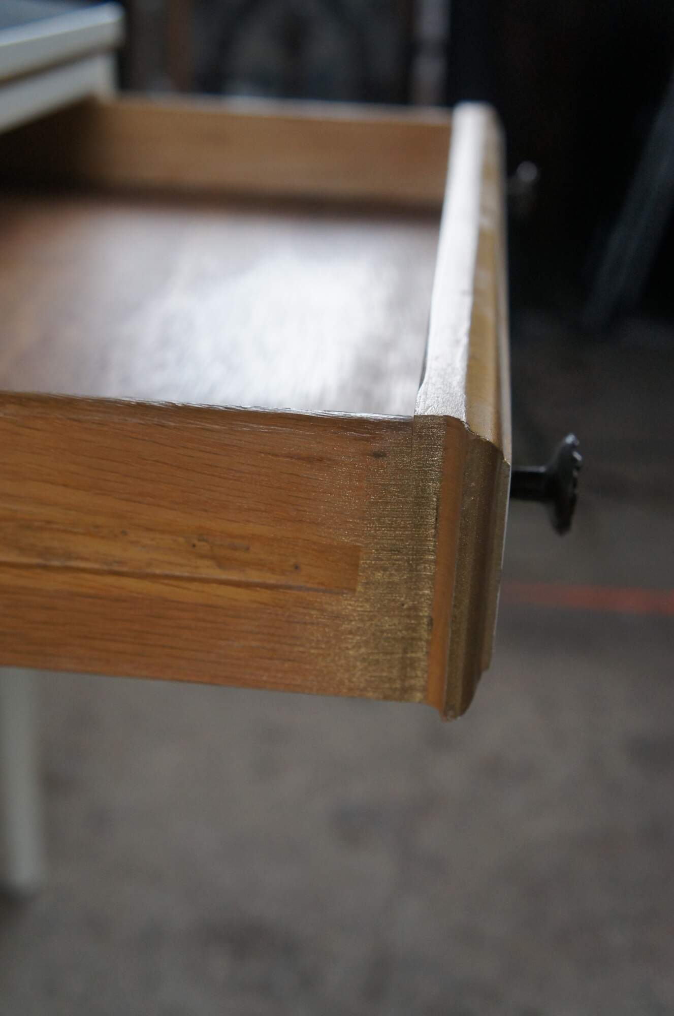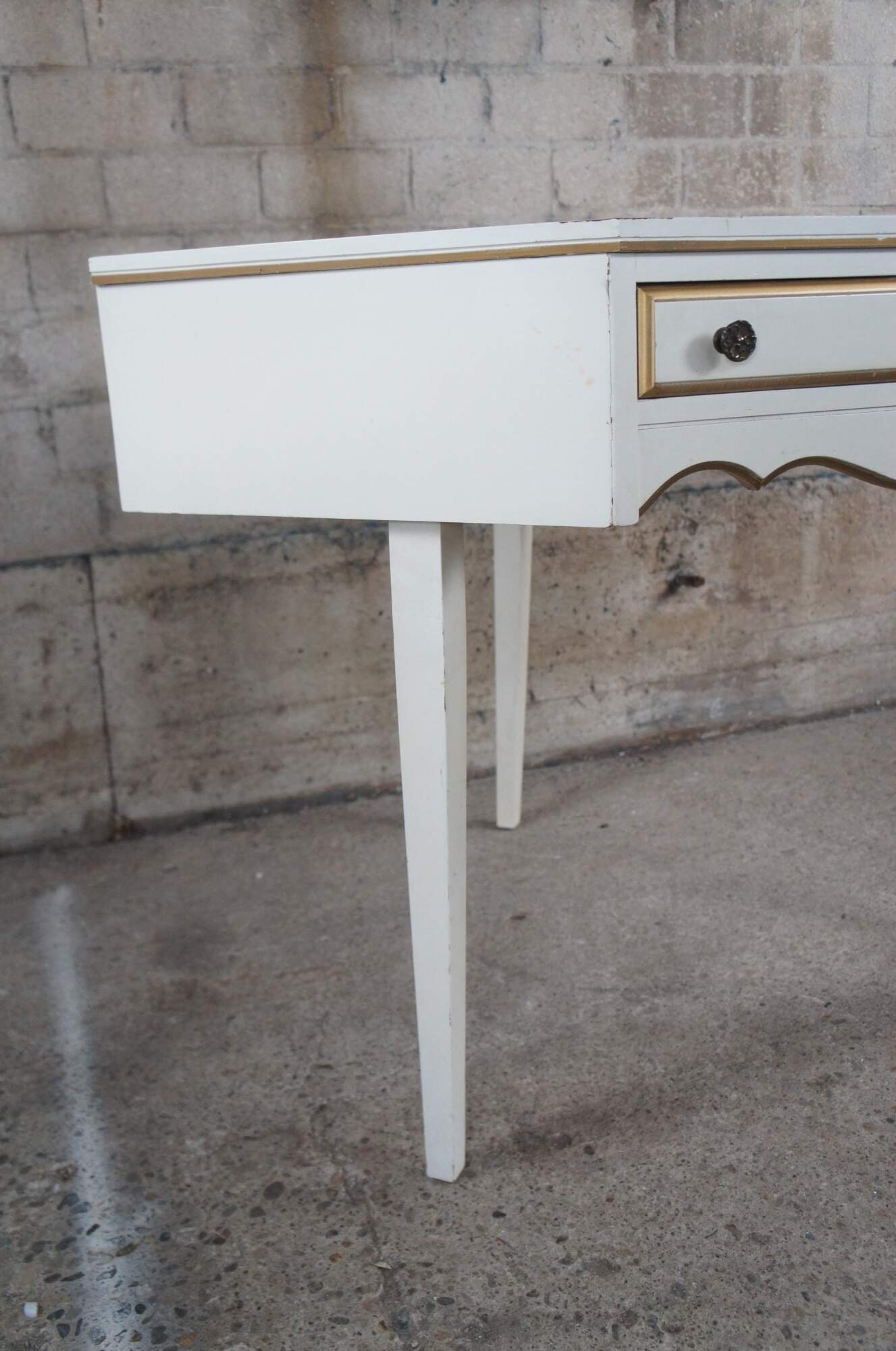 Intriguing French Provincial Corner desk or side table, circa 1970s. Features a central dovetailed drawer and work surface Supported by square tapered legs. Believed to be Kindel Furniture out of Grand rapids, Mi