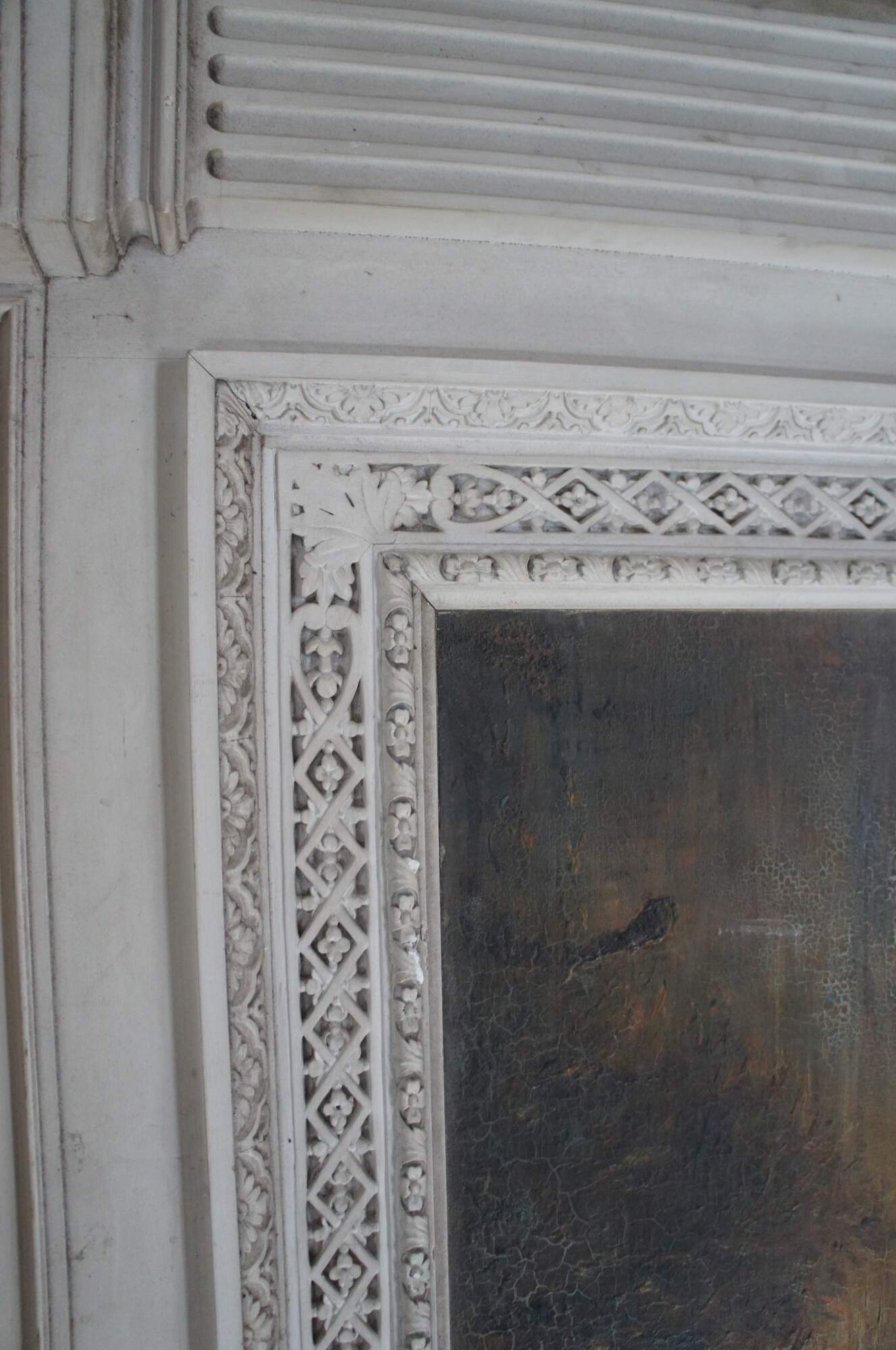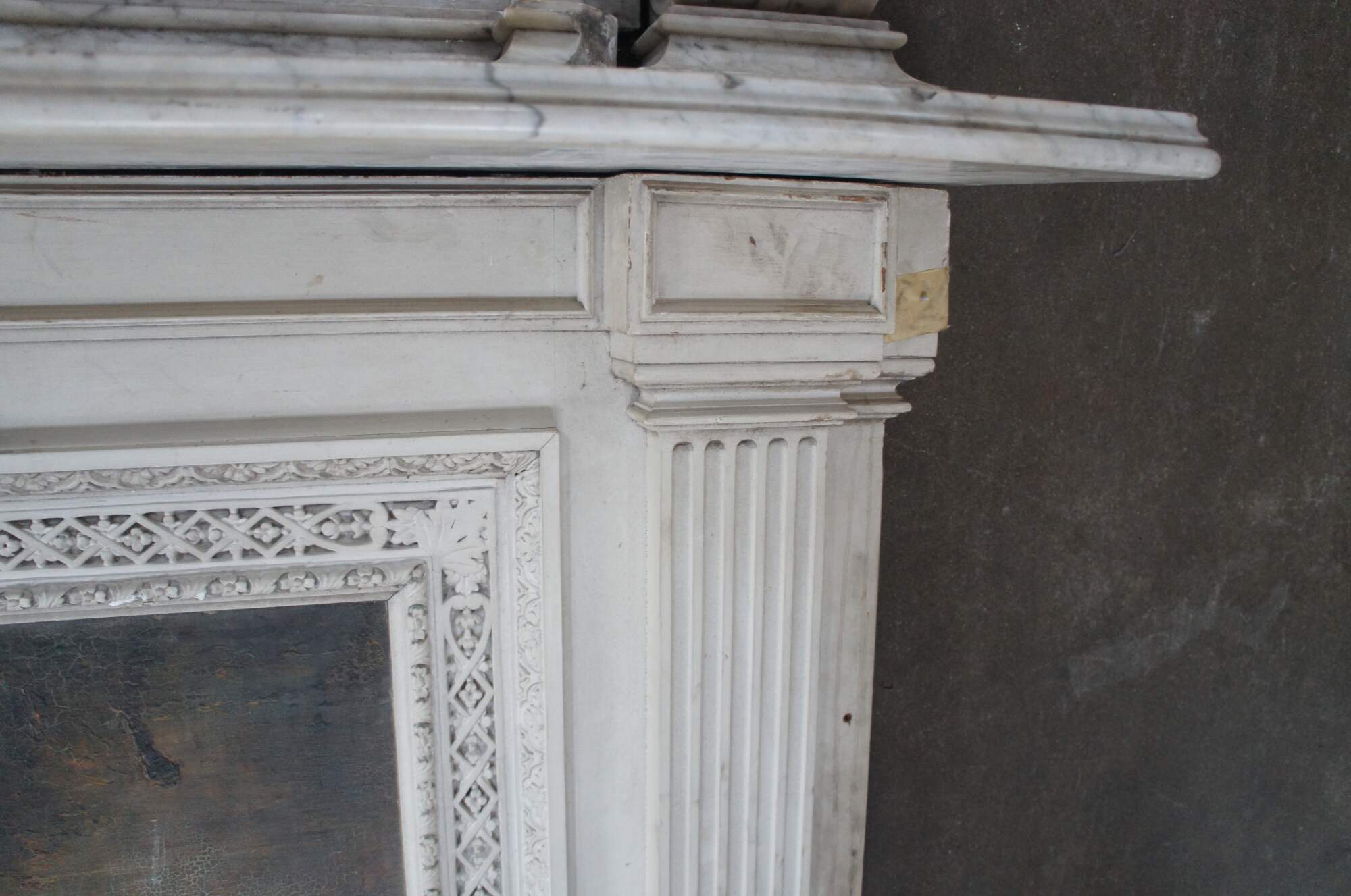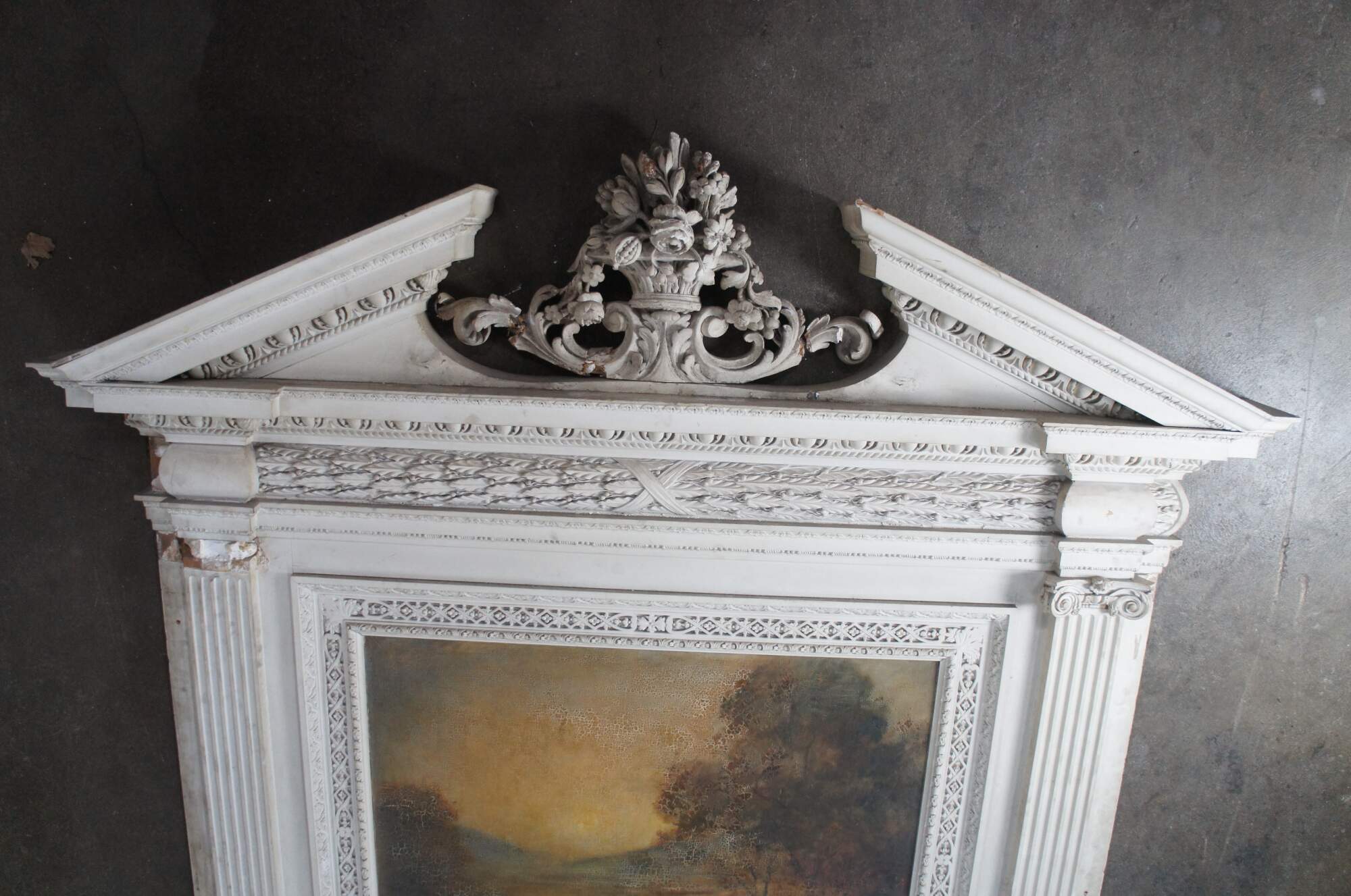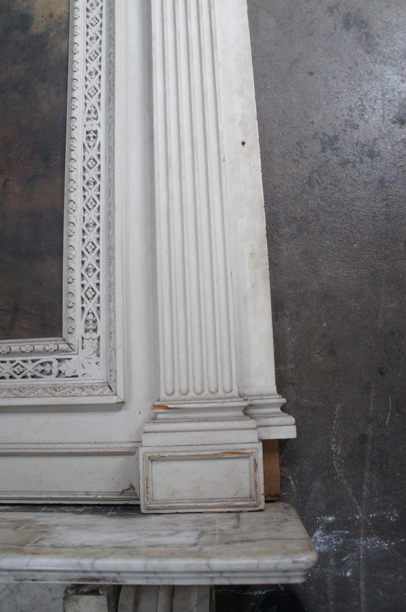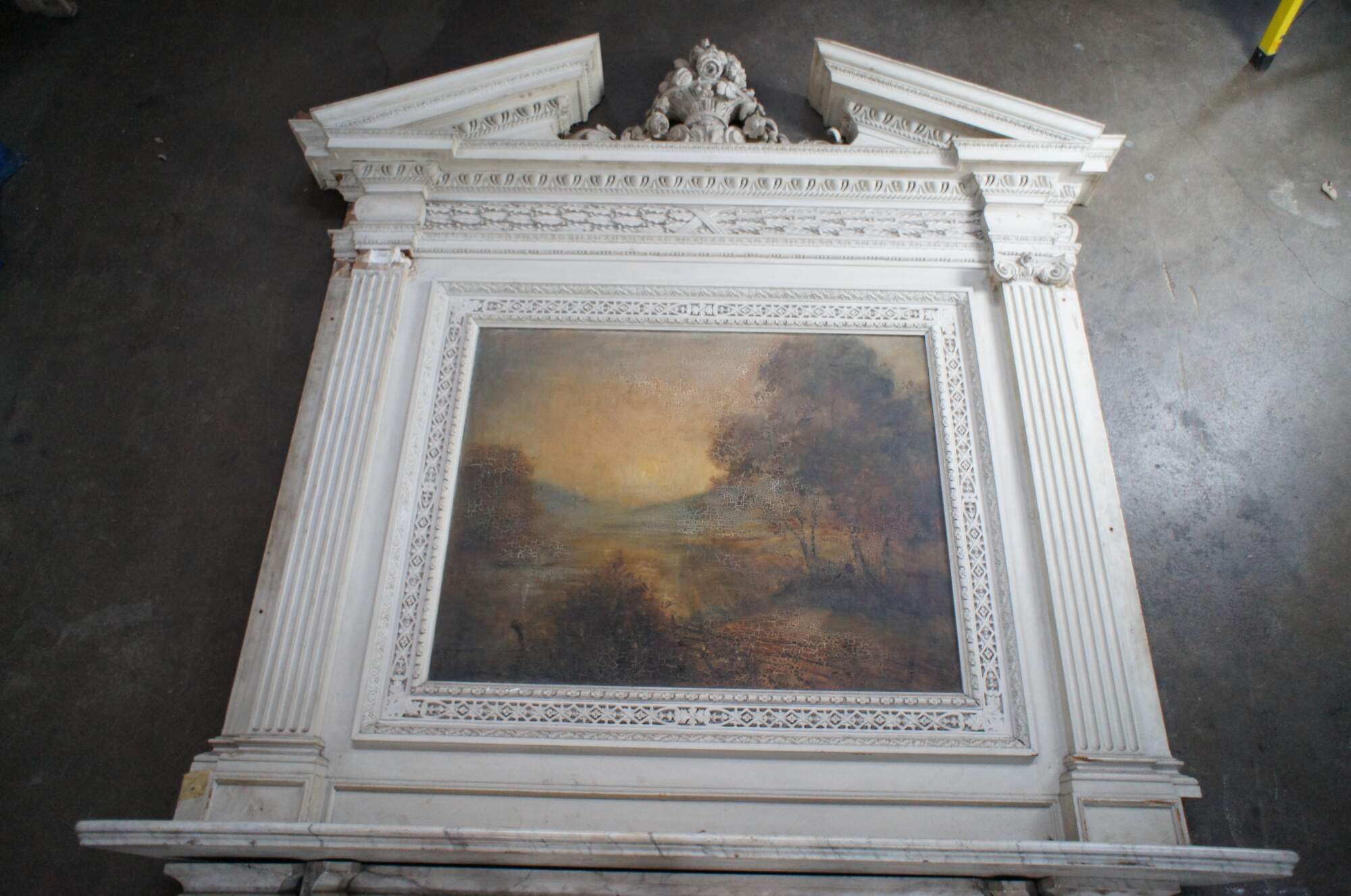 A very large and impressive fireplace mantel with Neoclassical and Grecian styling that features an impressive carved over mantel with open pediment design and ornate flower urn with acanthus accents. Features fluted columns, egg and dart molding, a sheath of wheat with ribbon, and carved reticulated flowers framing the 19th century impressionist landscape oil painting. The fireplace mantel and surround are made from Carrera marble mantel and paneling surround the fireplace