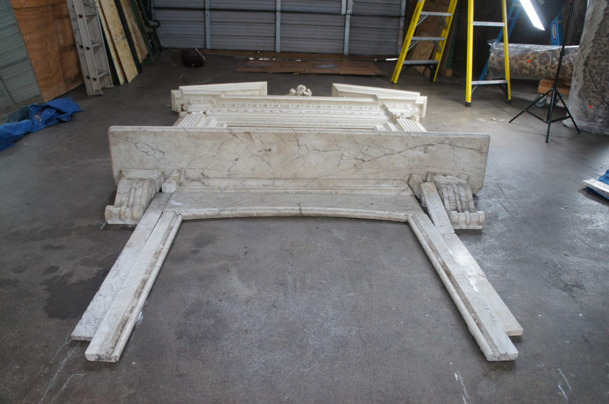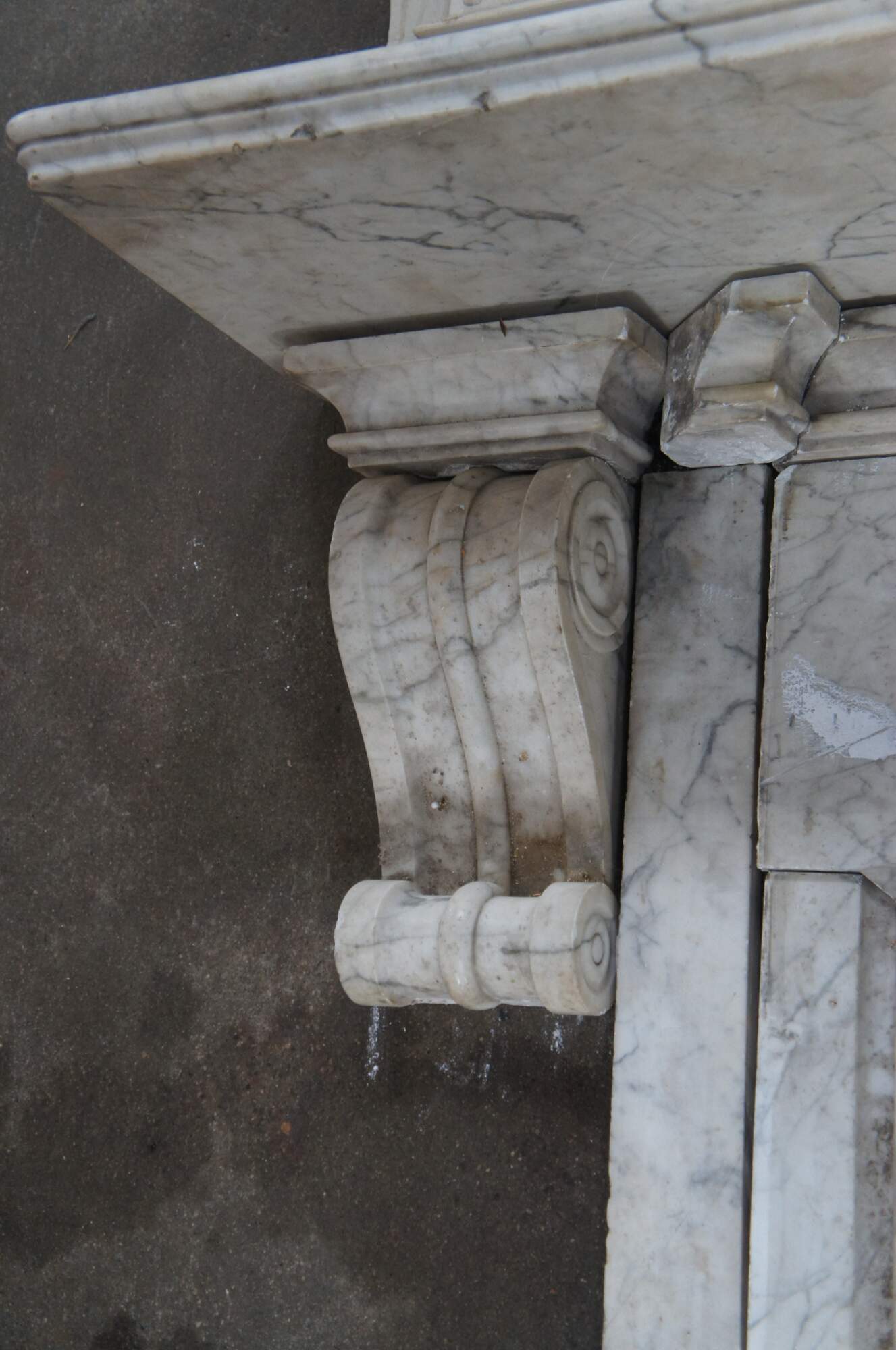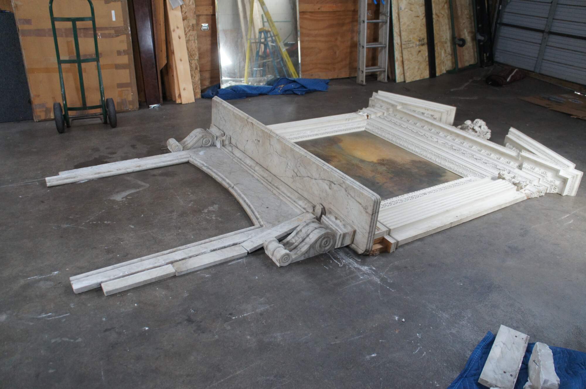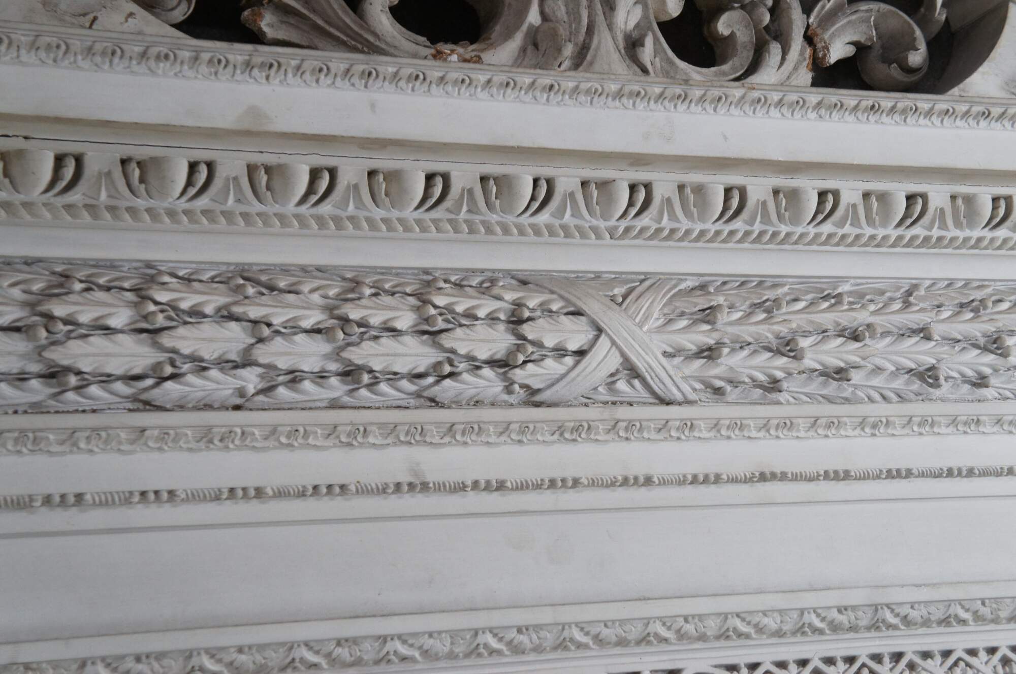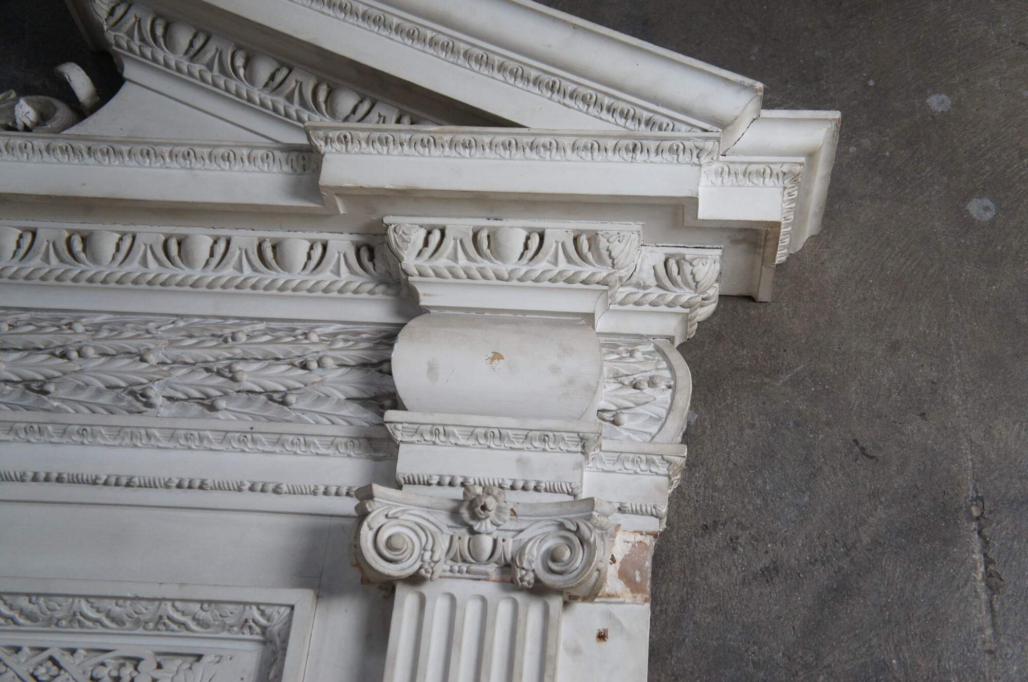A very large and impressive fireplace mantel with Neoclassical and Grecian styling that features an impressive carved over mantel with open pediment design and ornate flower urn with acanthus accents. Features fluted columns, egg and dart molding, a sheath of wheat with ribbon, and carved reticulated flowers framing the 19th century impressionist landscape oil painting. The fireplace mantel and surround are made from Carrera marble mantel and paneling surround the fireplace