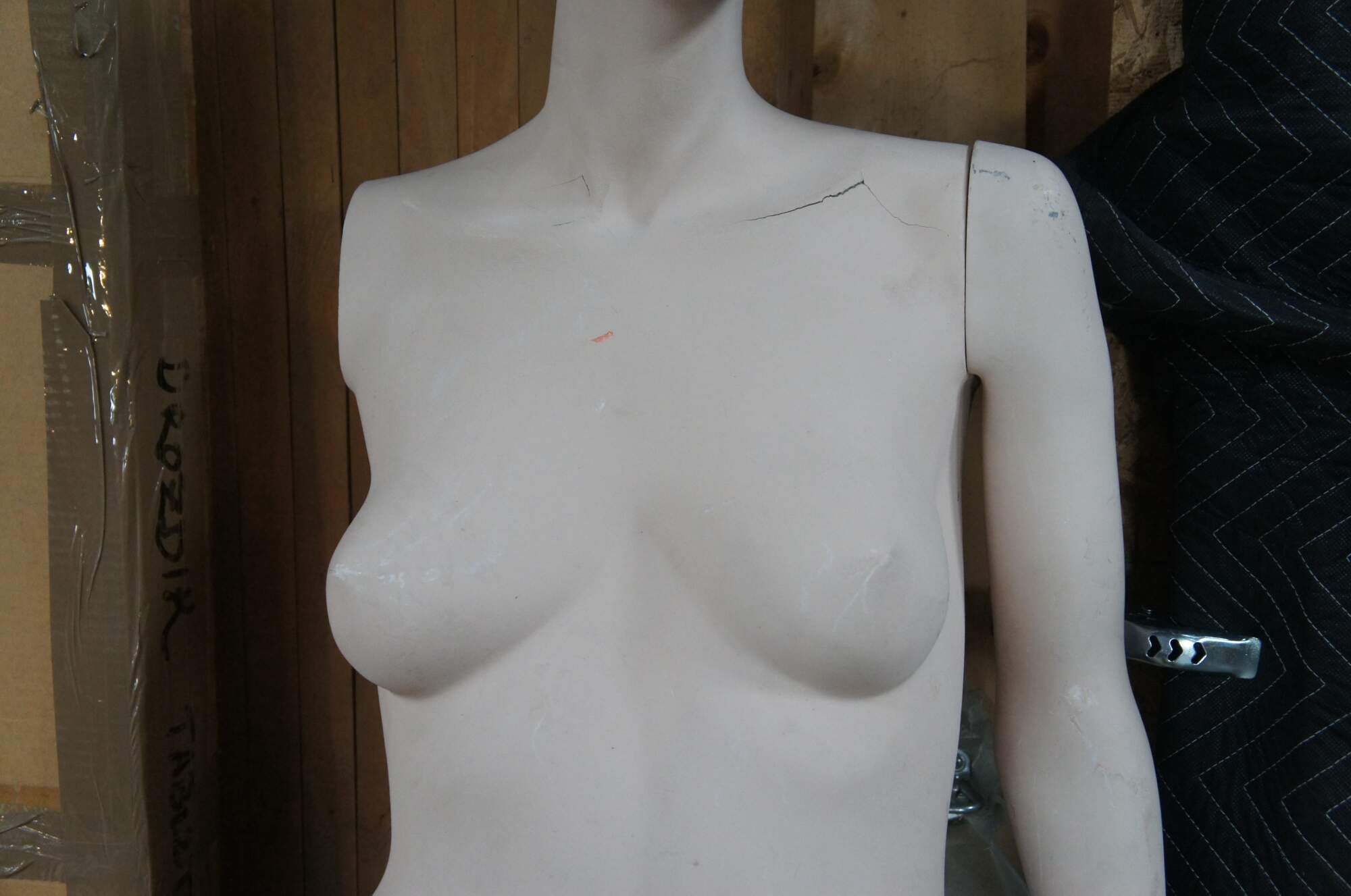 Fair condition, wear and distressing, missing arm, hole in leg, splitting, no base.