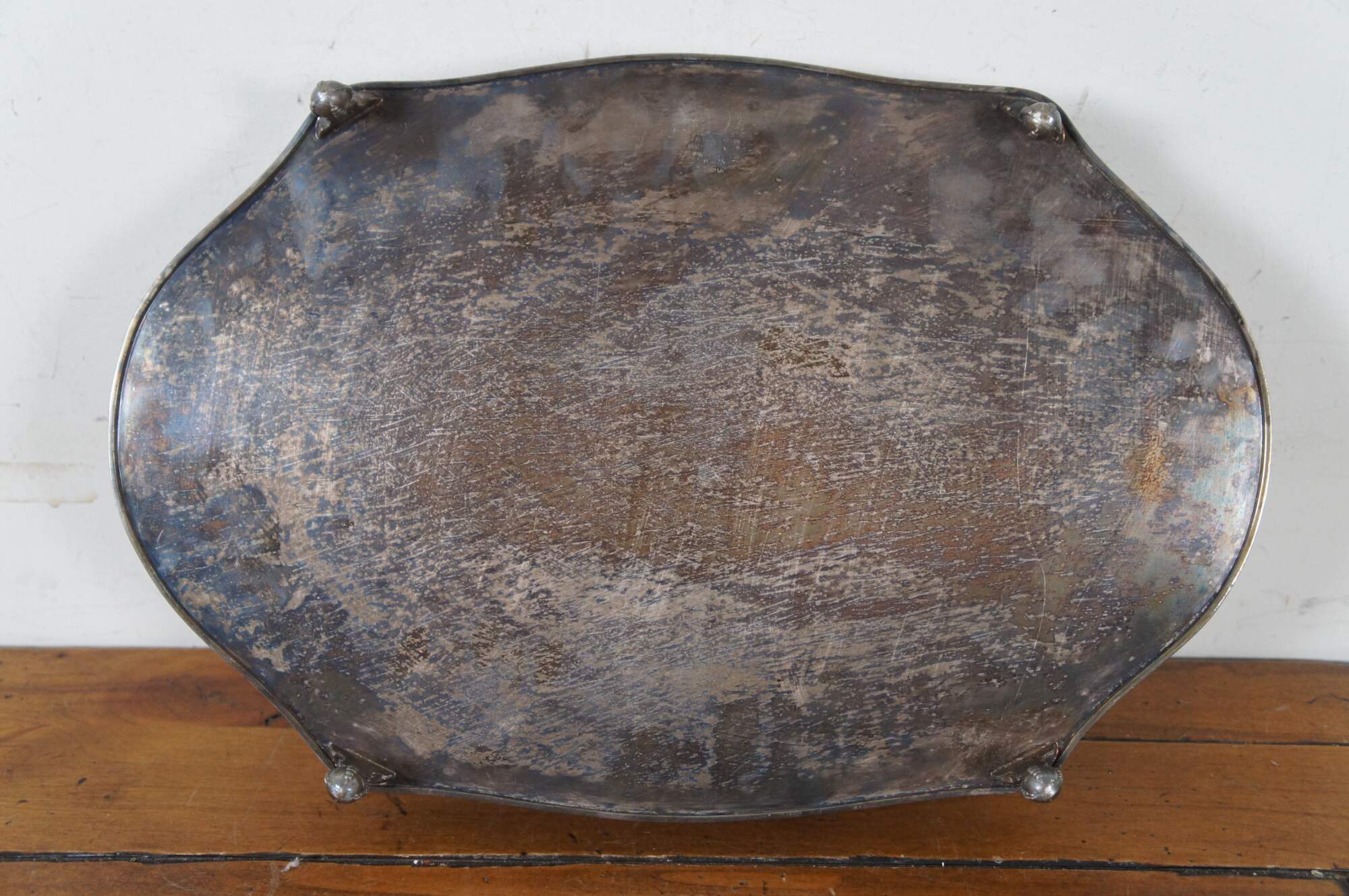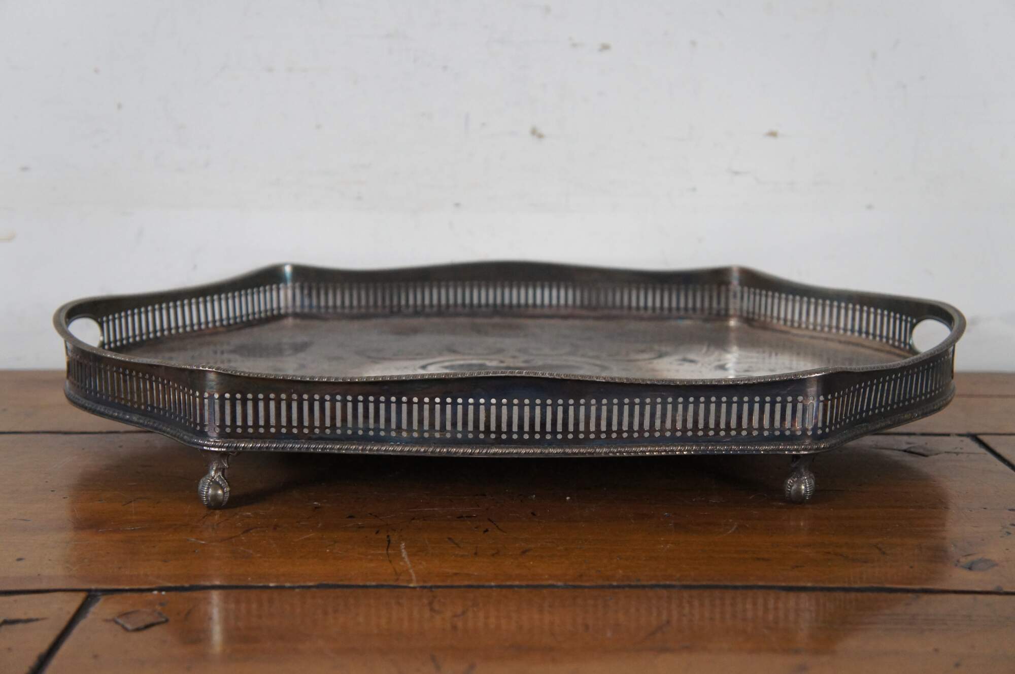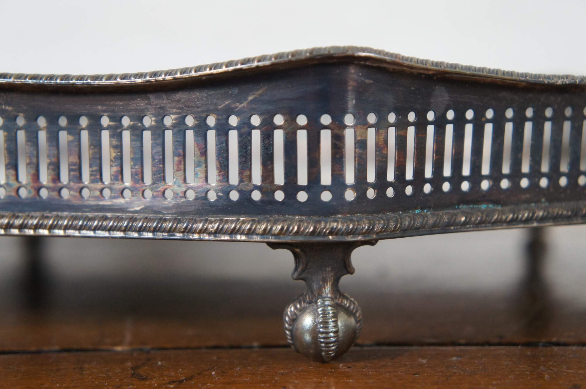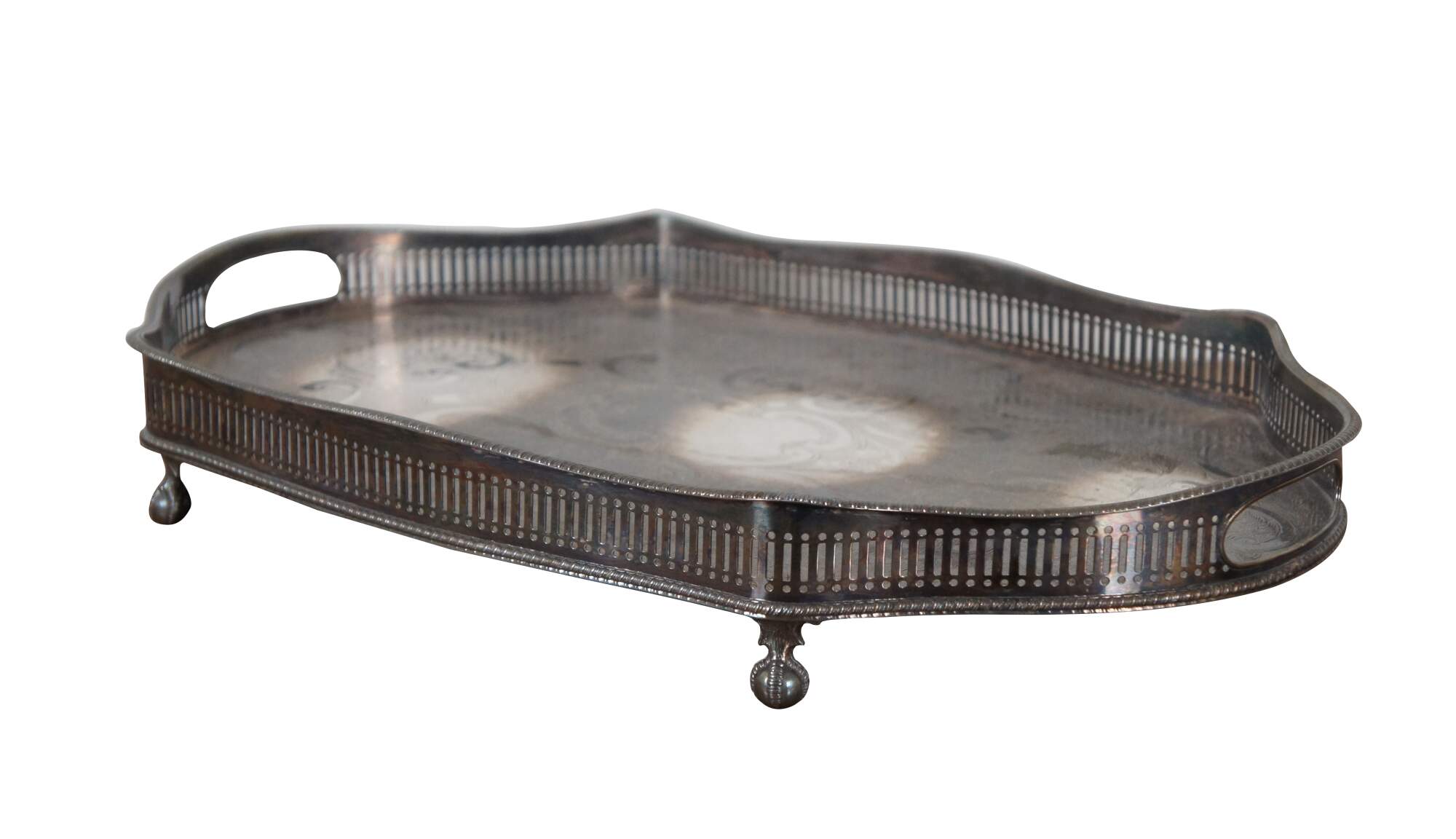 Vintage Reed & Barton silver plate on copper, number 402, serving / bar / vanity tray. Rounded rectangular / oblong form with scalloped sides, raised pierced reticulated gallery edge with handles on either end and rope twist trim, four ball and claw feet and surface etched with scallops and florals. Made in Sheffield, England.