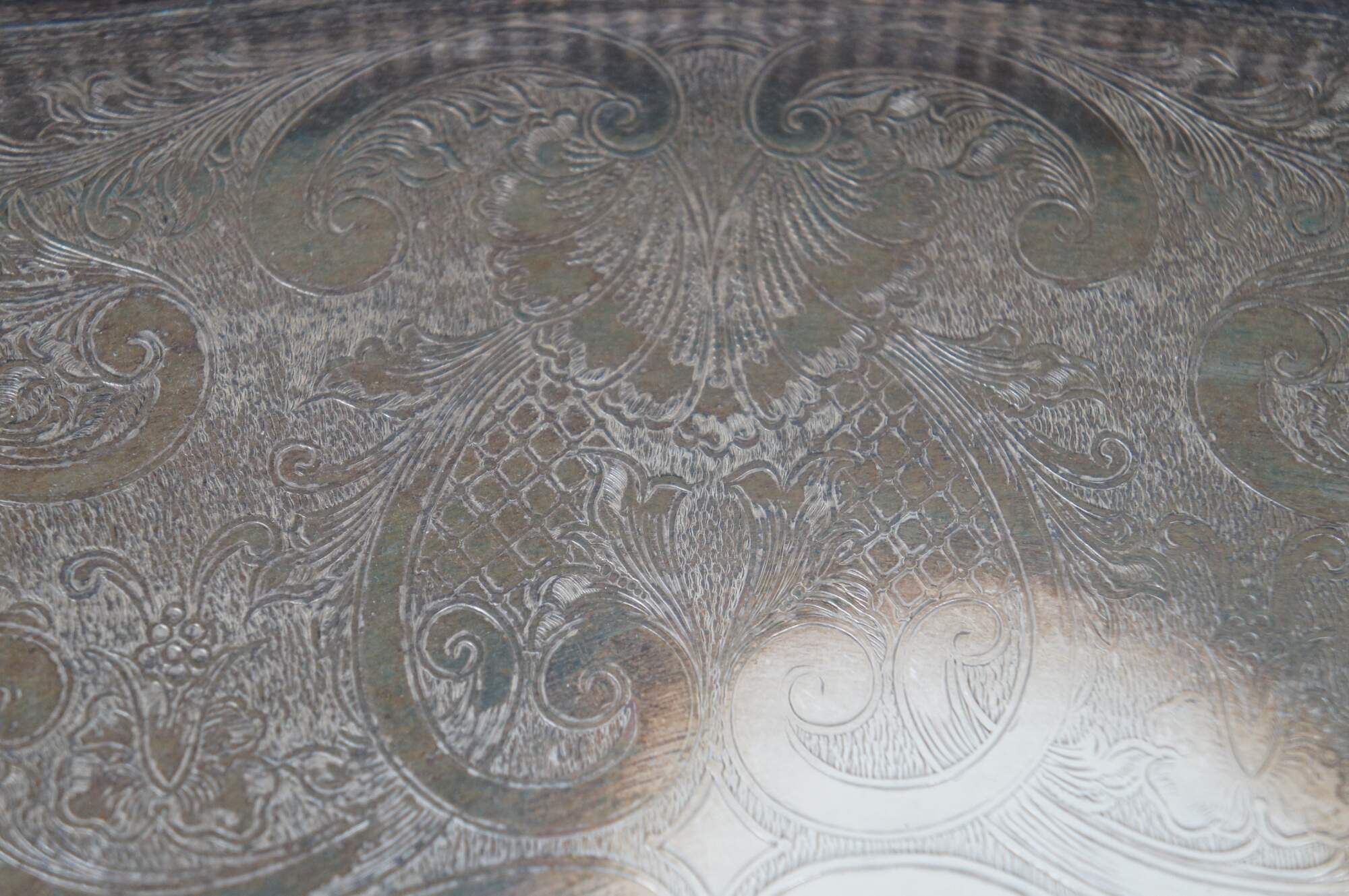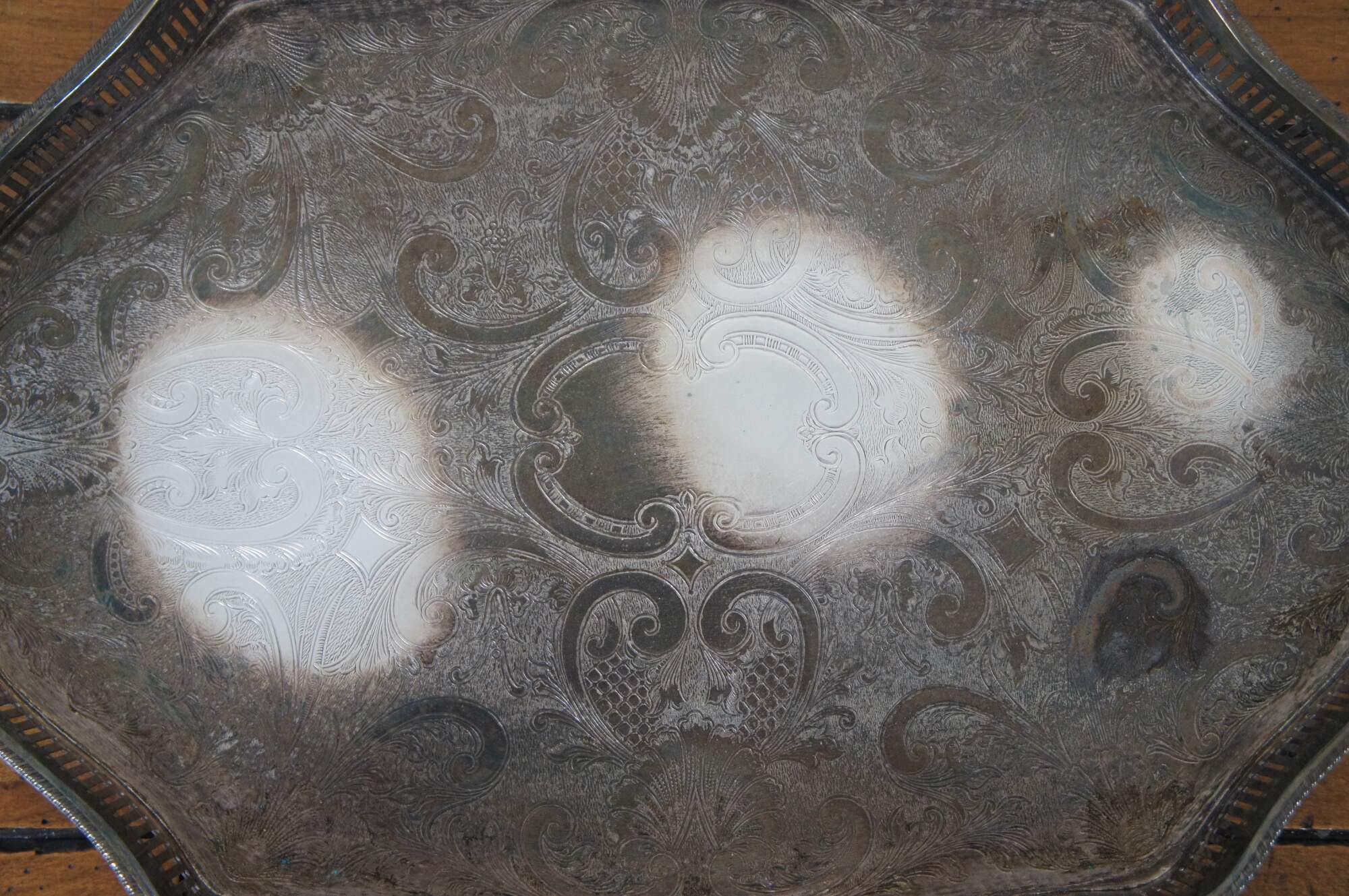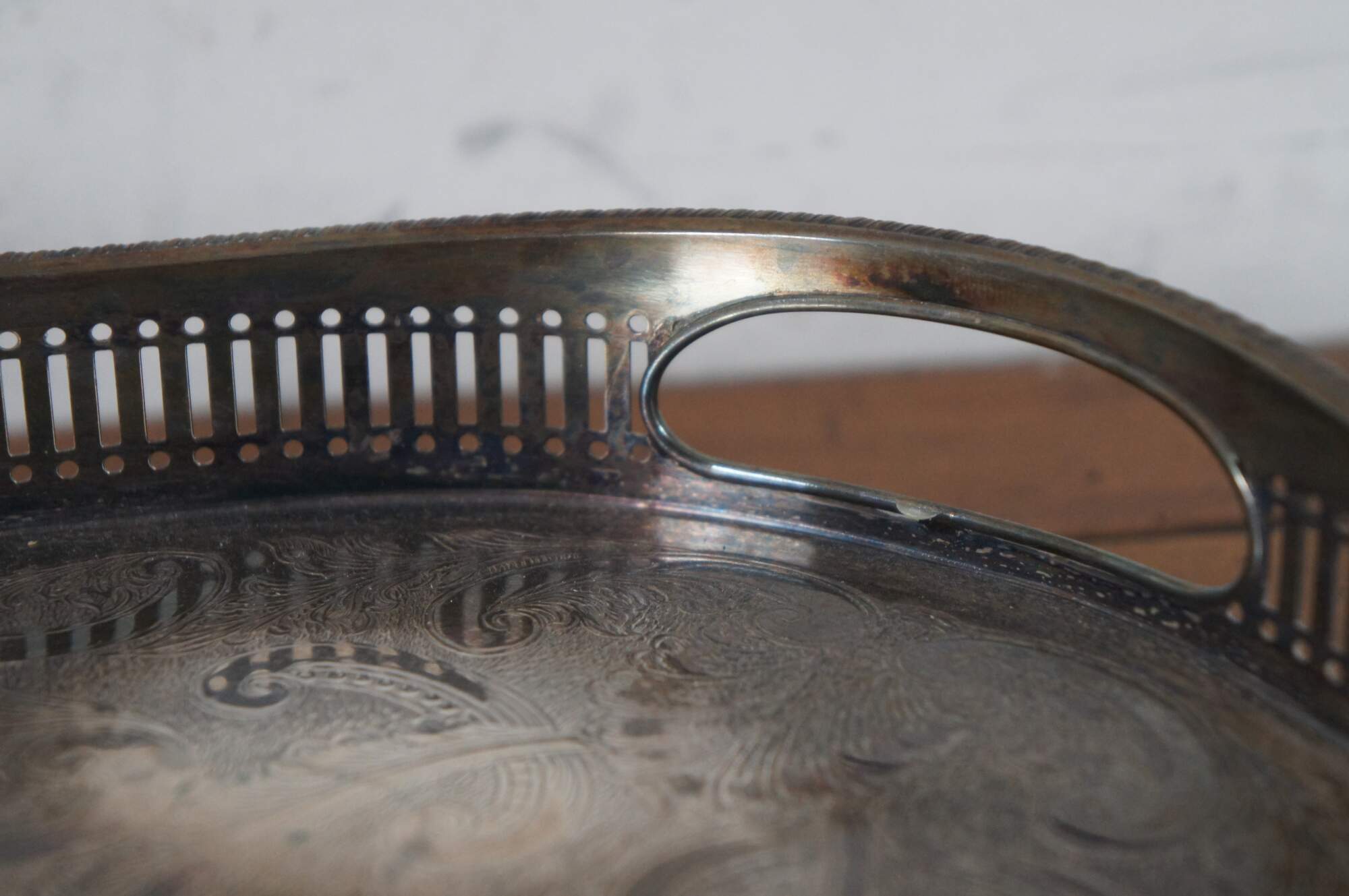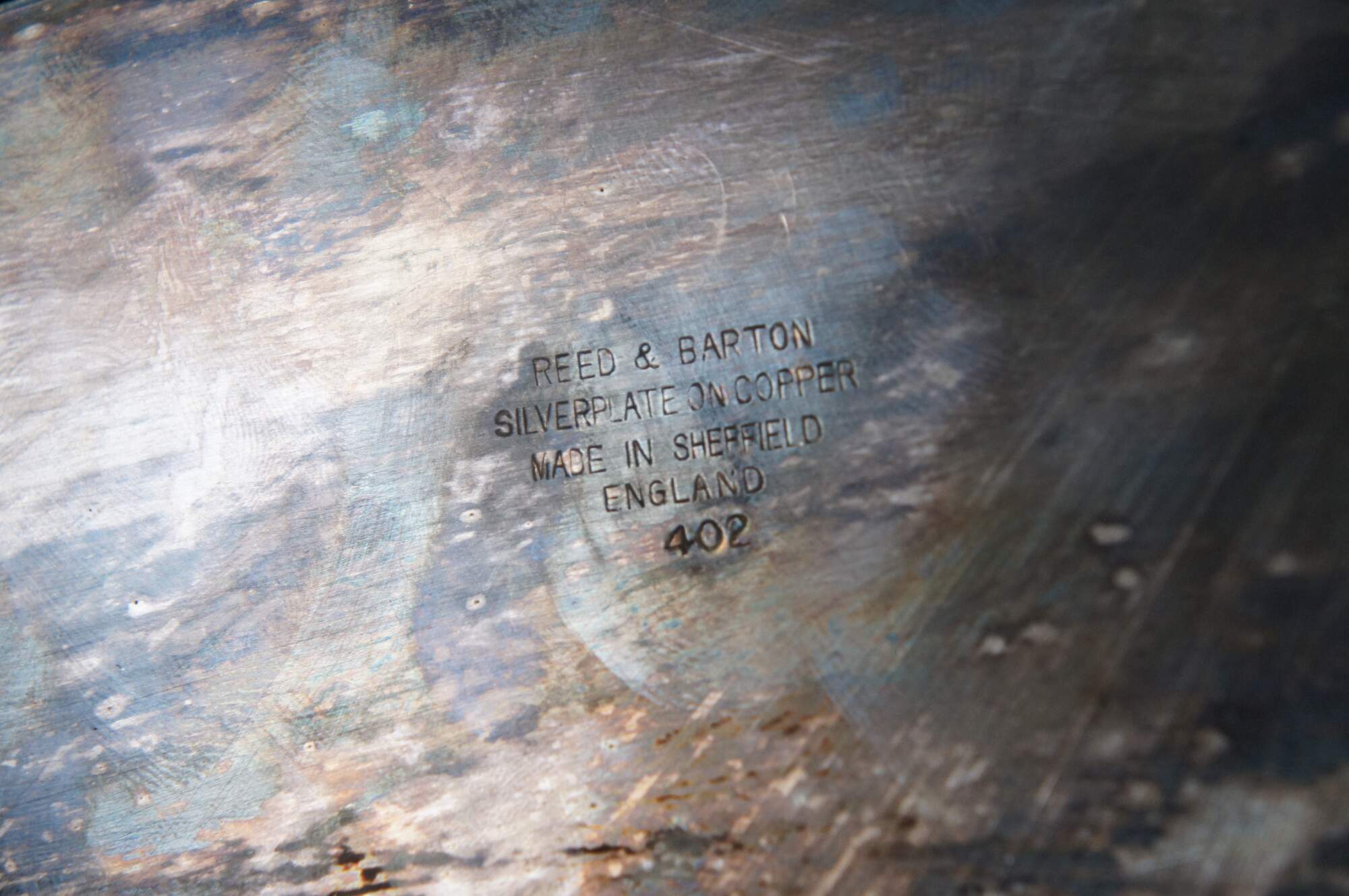 Vintage Reed & Barton silver plate on copper, number 402, serving / bar / vanity tray. Rounded rectangular / oblong form with scalloped sides, raised pierced reticulated gallery edge with handles on either end and rope twist trim, four ball and claw feet and surface etched with scallops and florals. Made in Sheffield, England.