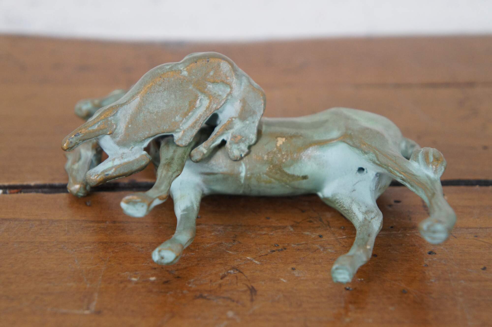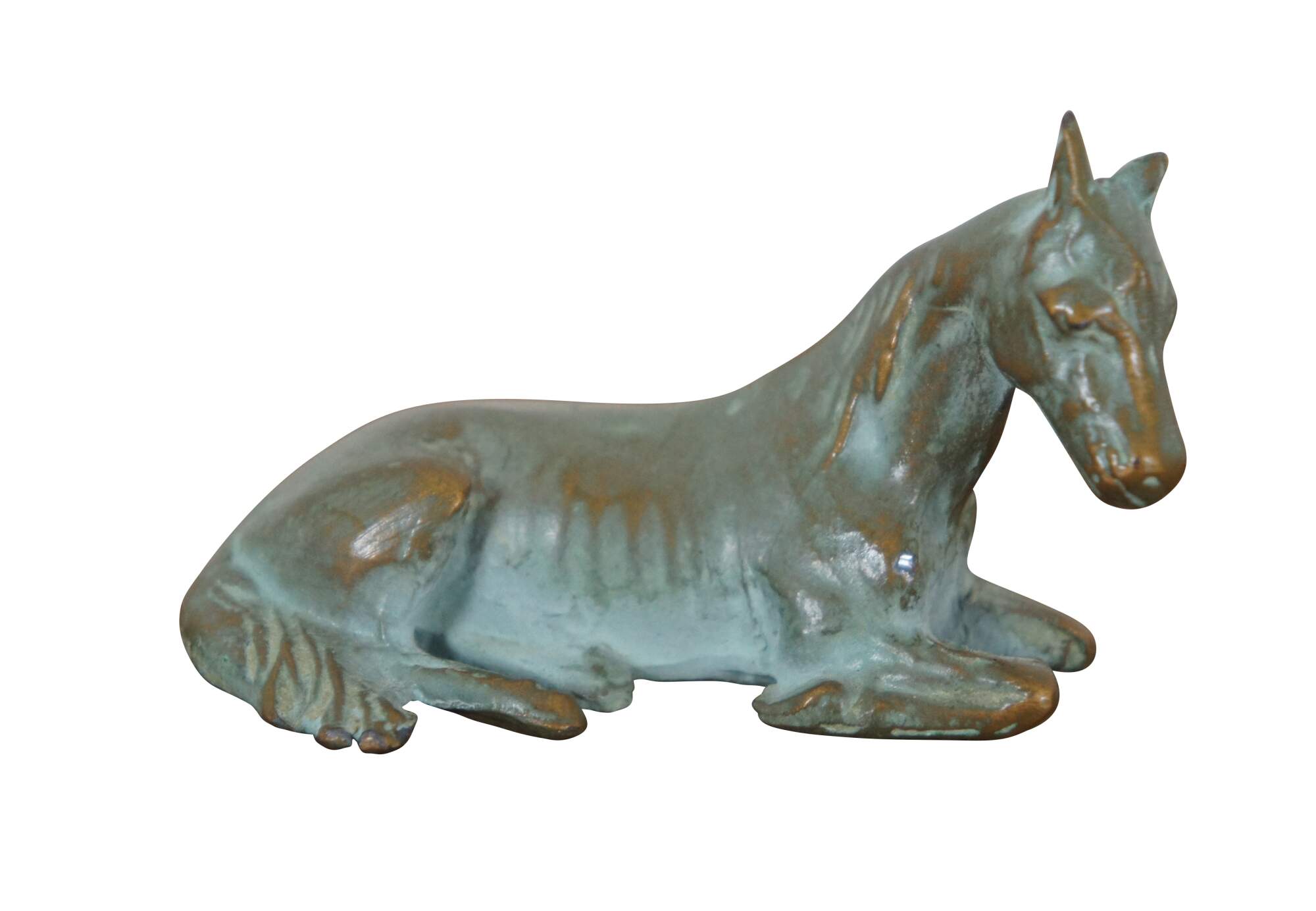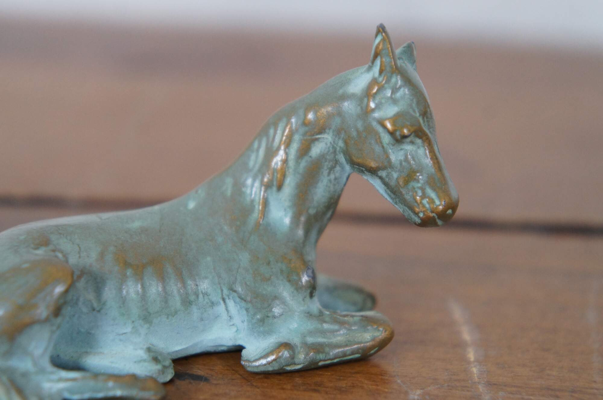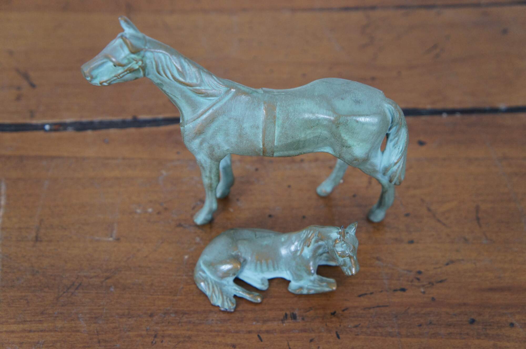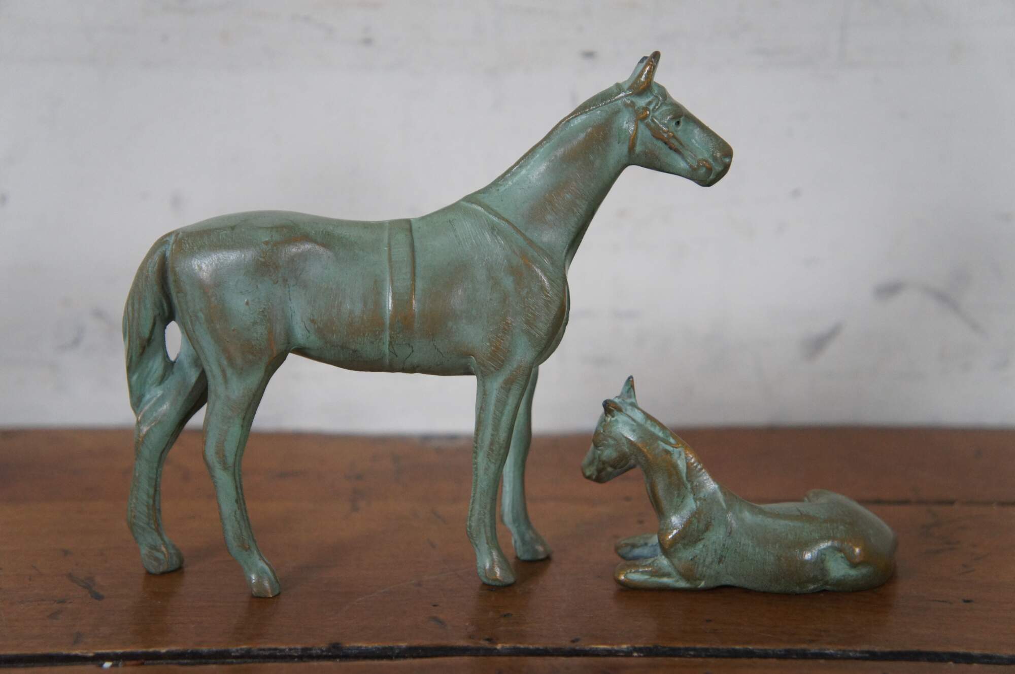 Vintage pair of two patinated brass equestrian horse sculptures / figurines / paperweights. Made of brass with added patina, featuring a mother and her baby foal.