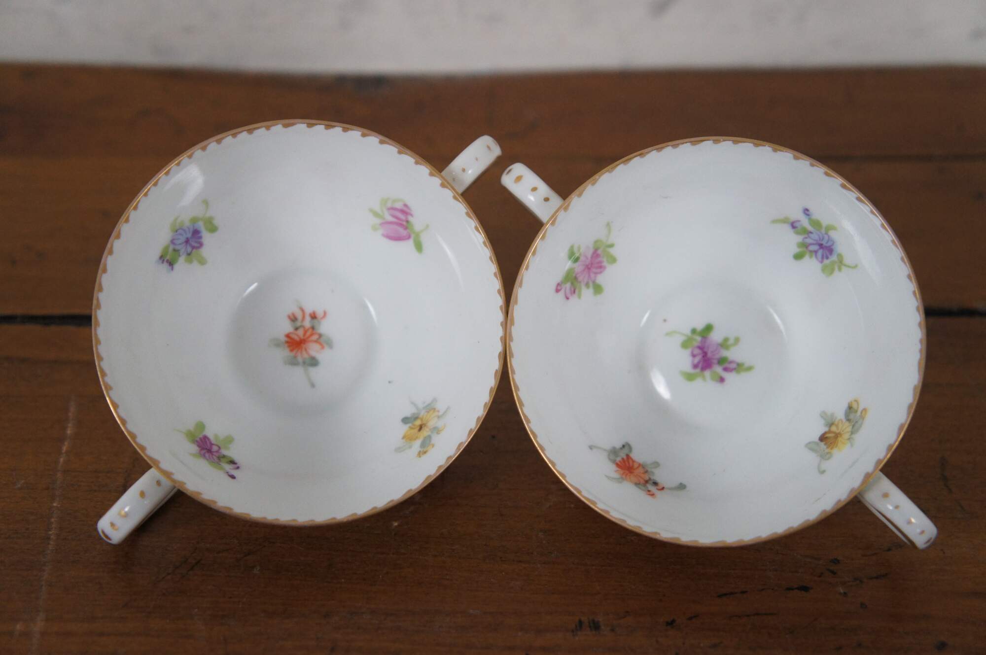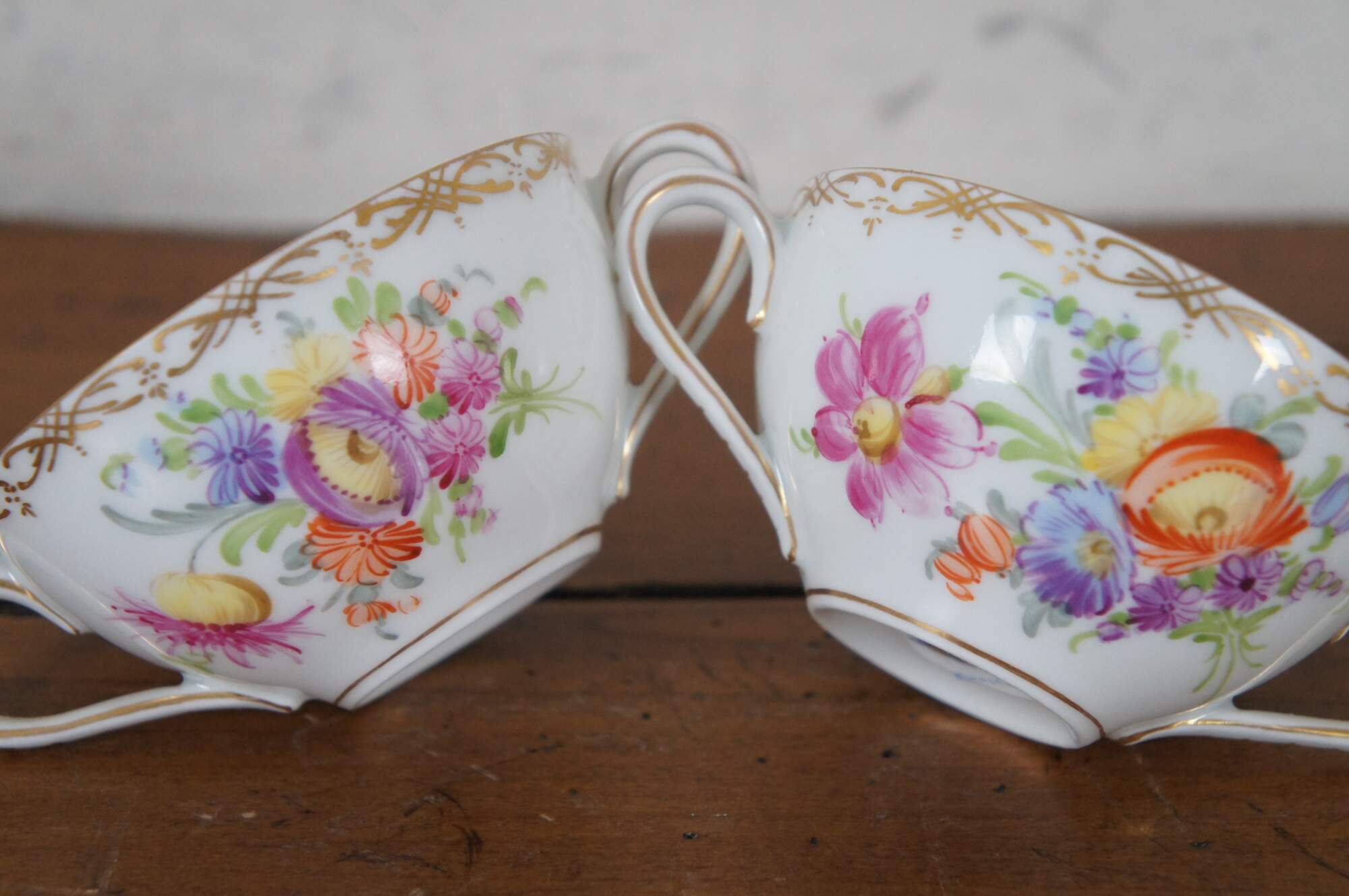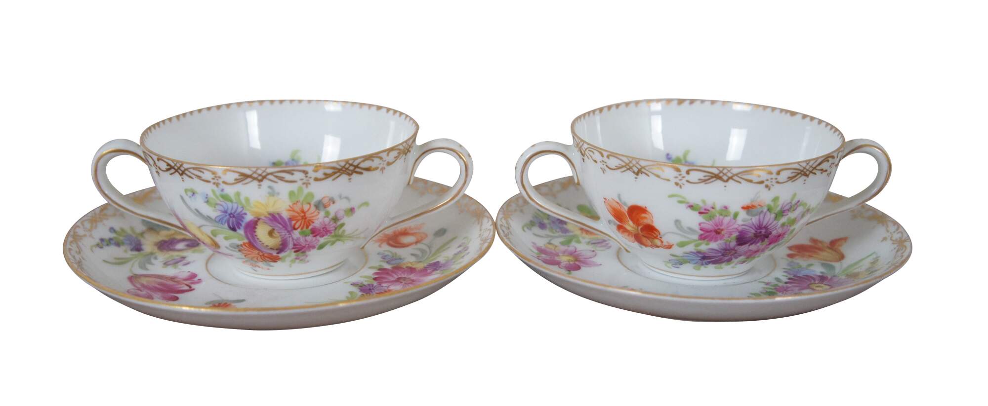 Antique Dresden Franziska Hirsch porcelain pottery bouillon bowls / cups and saucers featuring a painted floral boquet of flowers with gold accents
