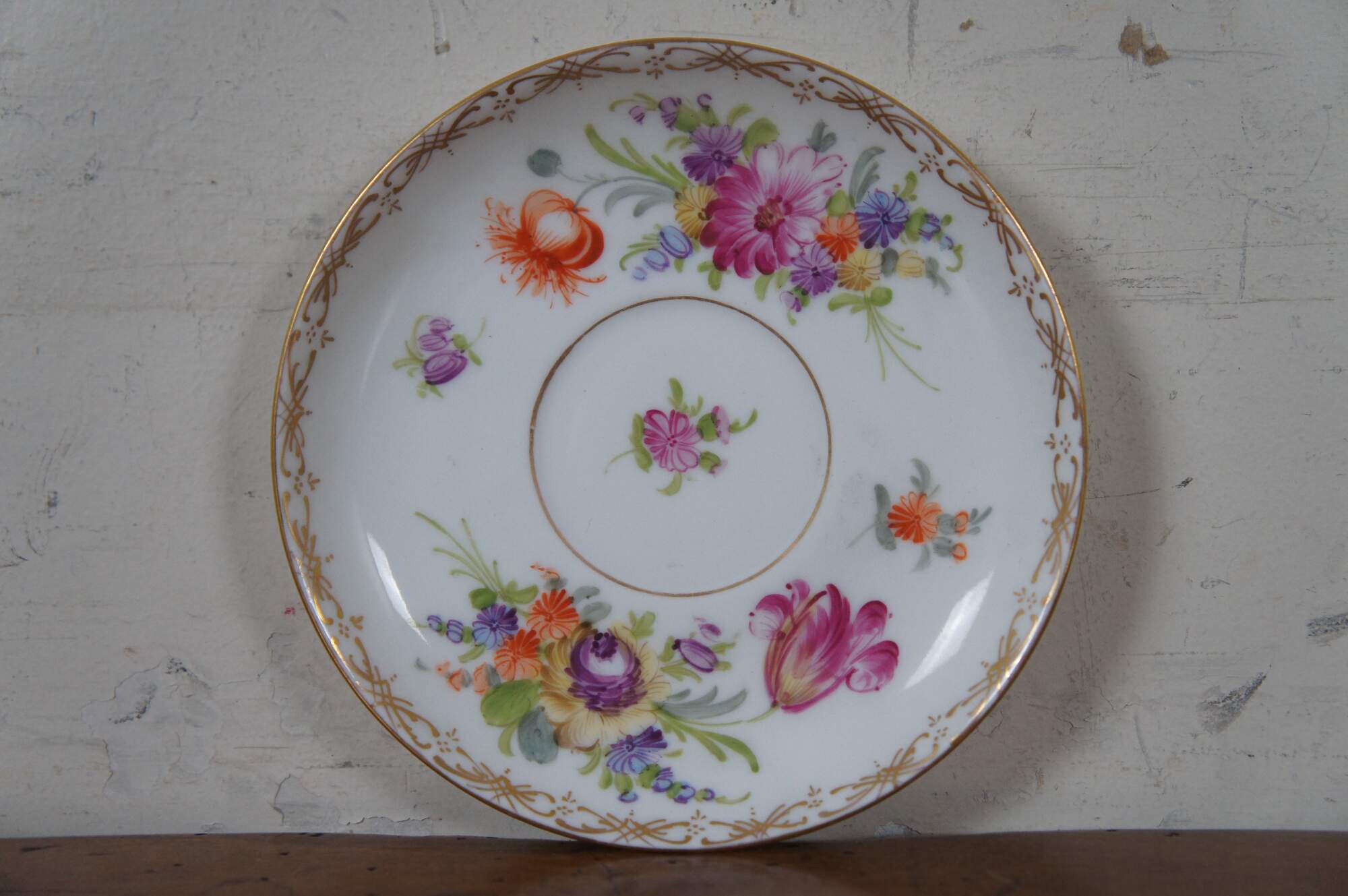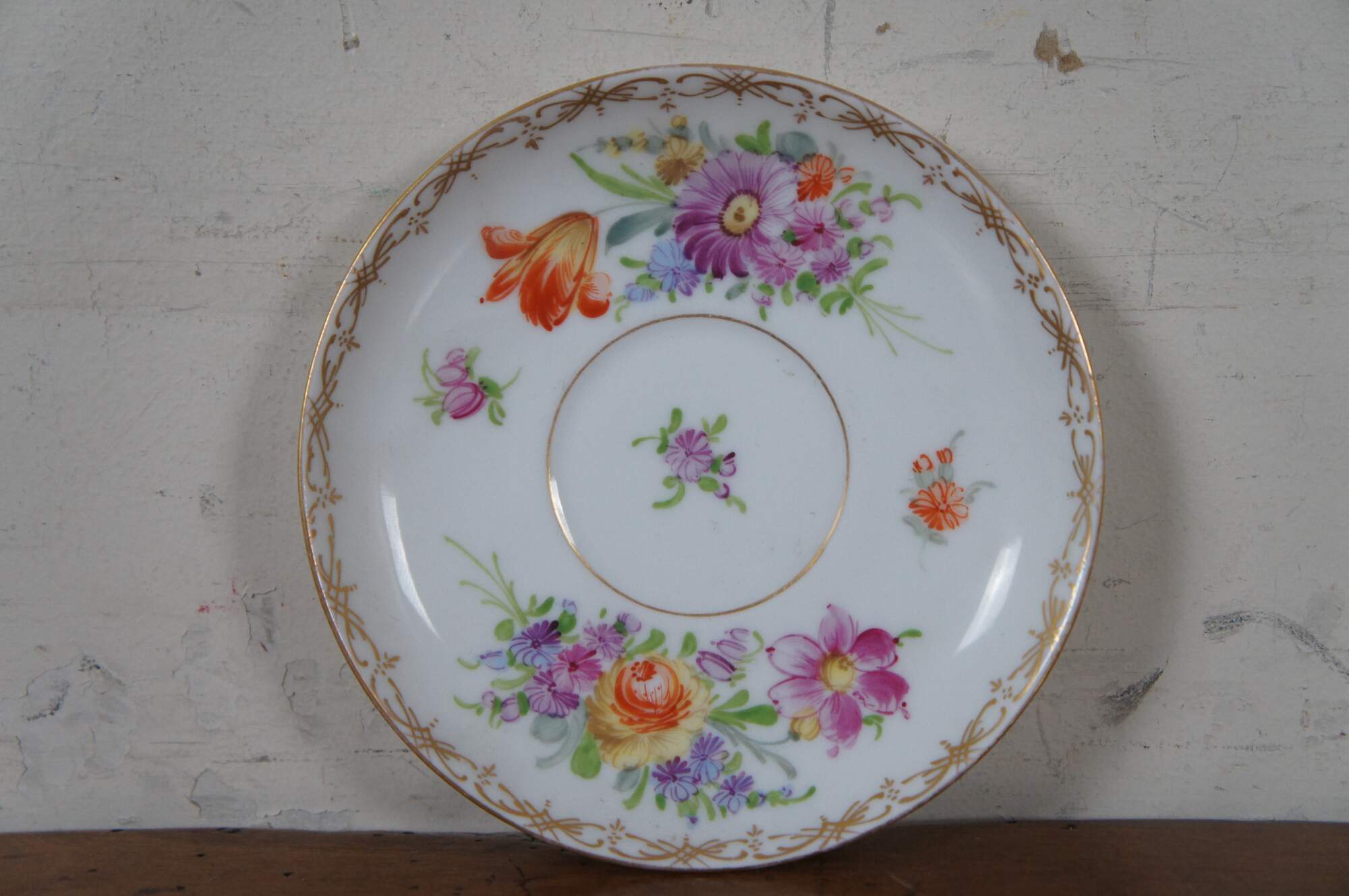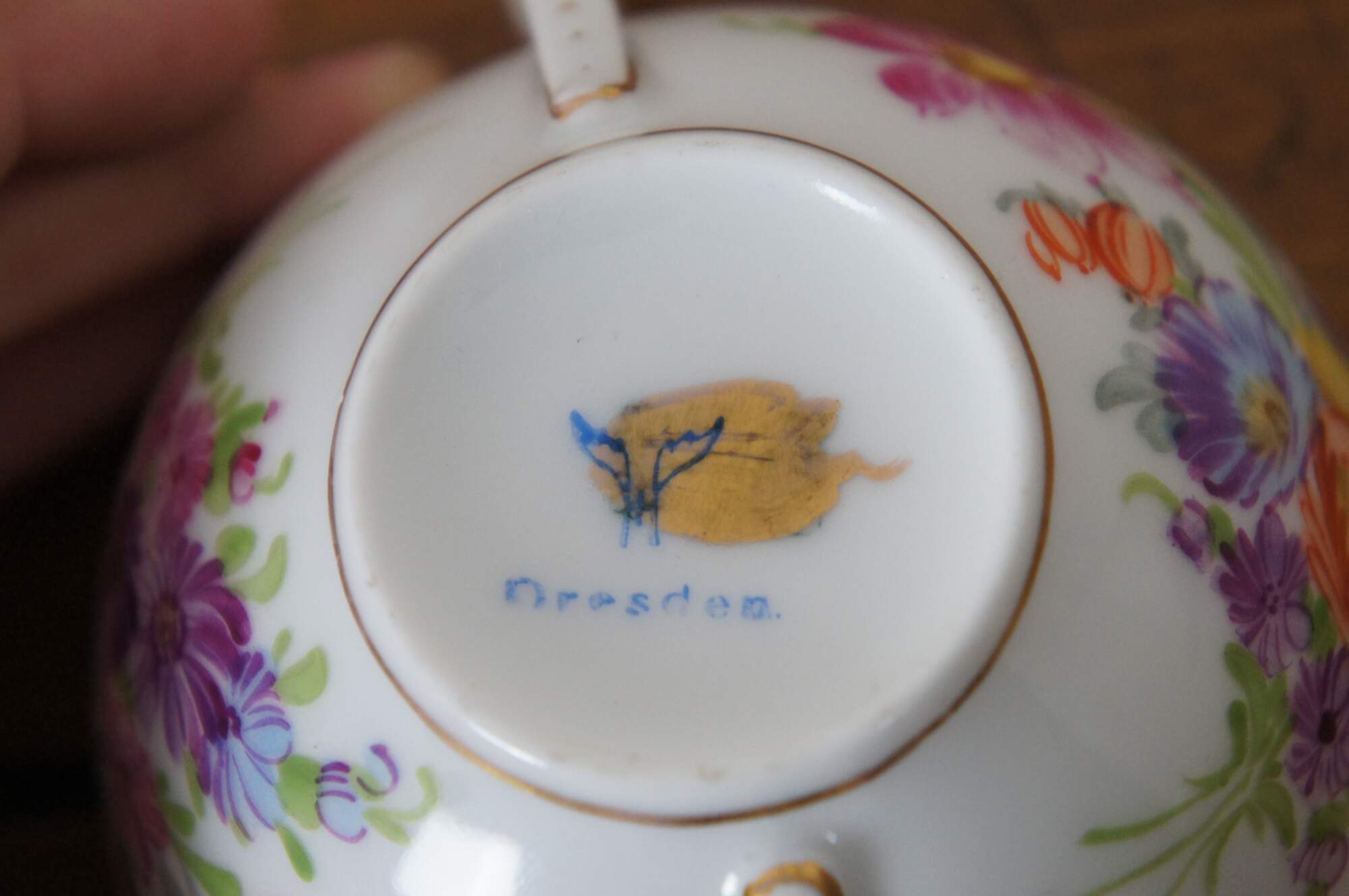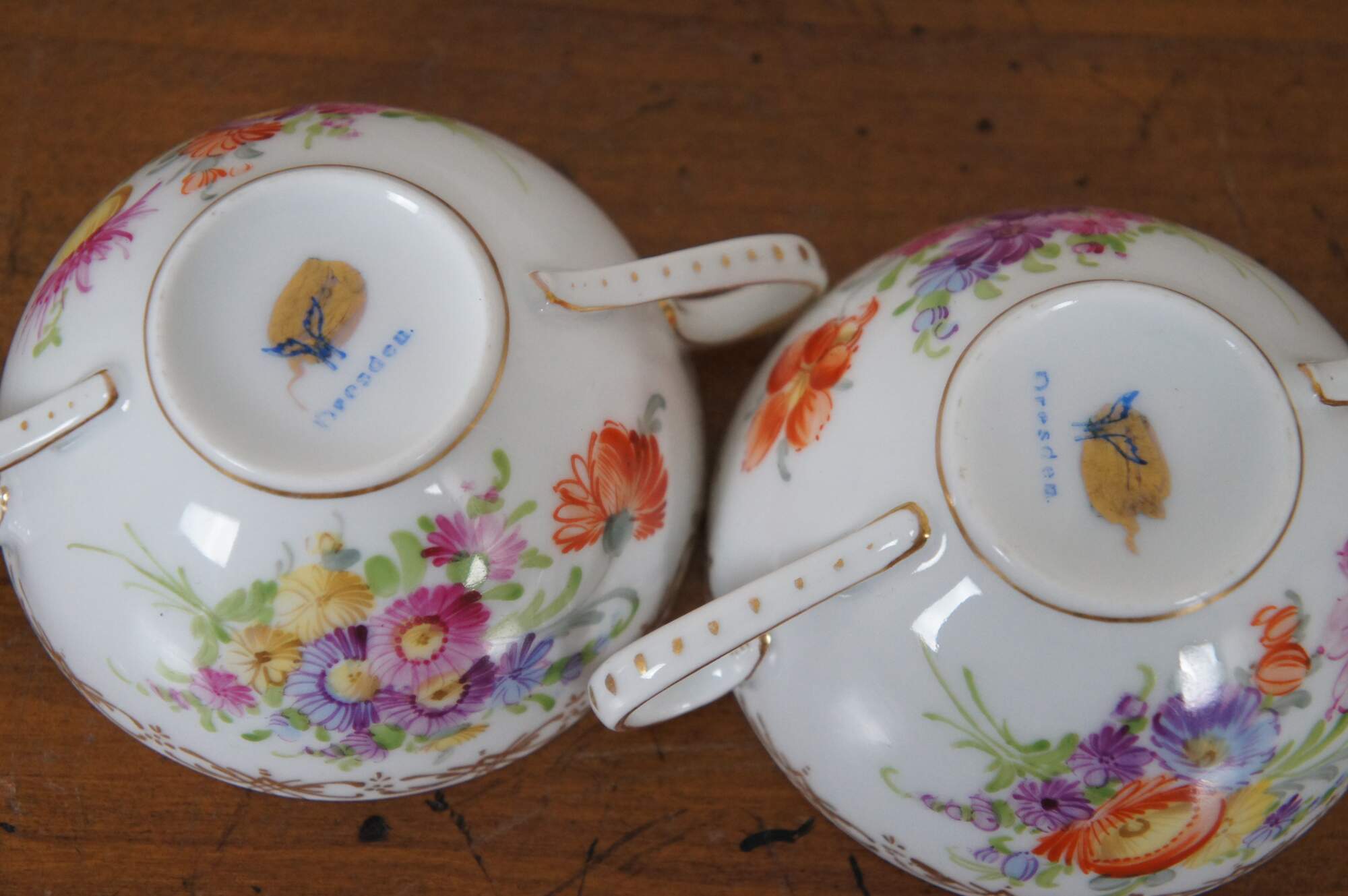 Antique Dresden Franziska Hirsch porcelain pottery bouillon bowls / cups and saucers featuring a painted floral boquet of flowers with gold accents