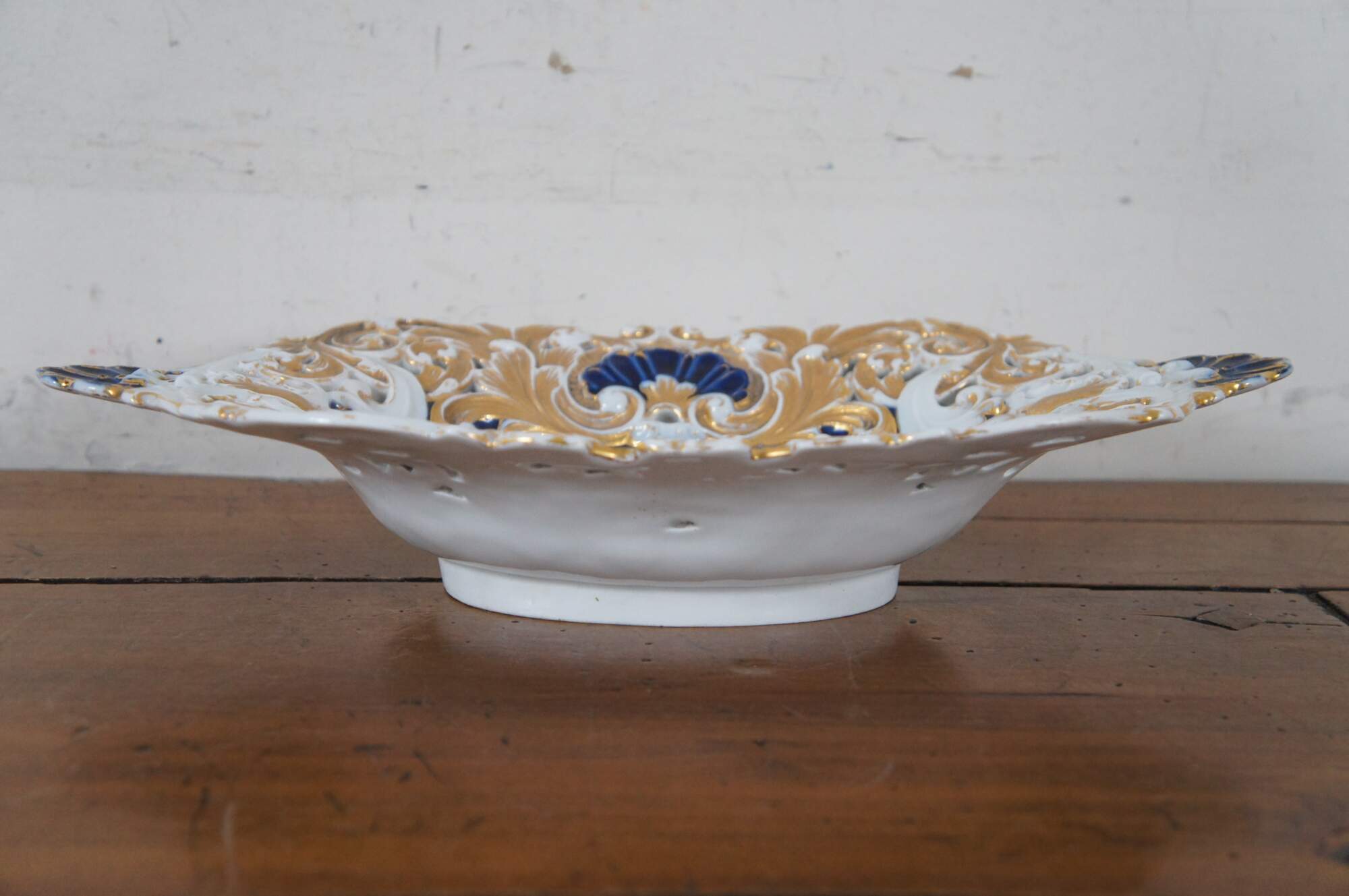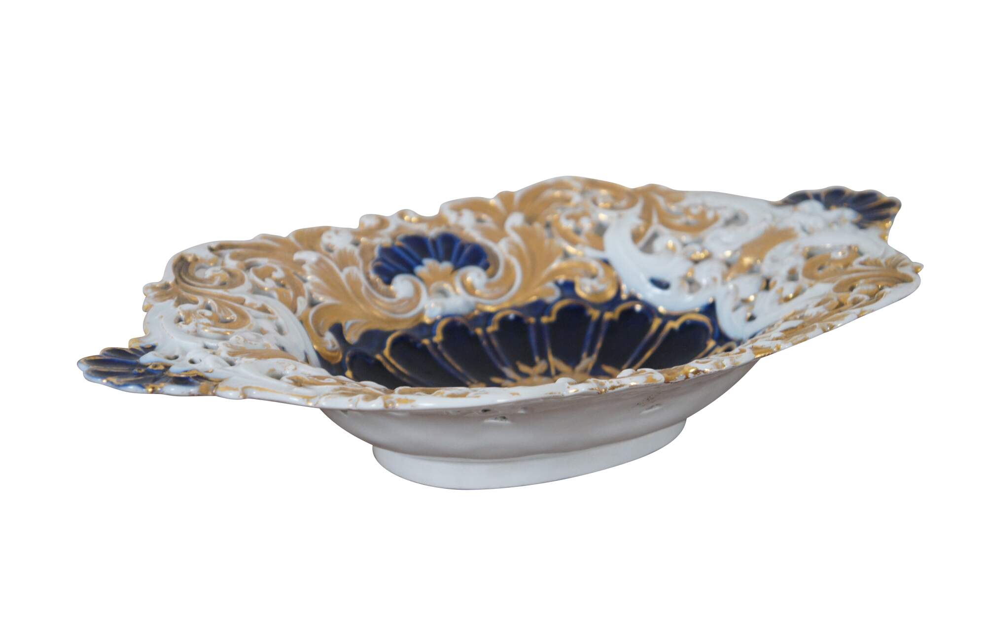 Antique German Meissen porcelain footed cabinet plate / centerpiece bowl / serving platter / compote featuring scalloped oval form with low relief reticulated design of gold gilt roses and acanthus leaves with cobalt blue shell handles and footed base. 1815 to 1860 crossed swords mark.