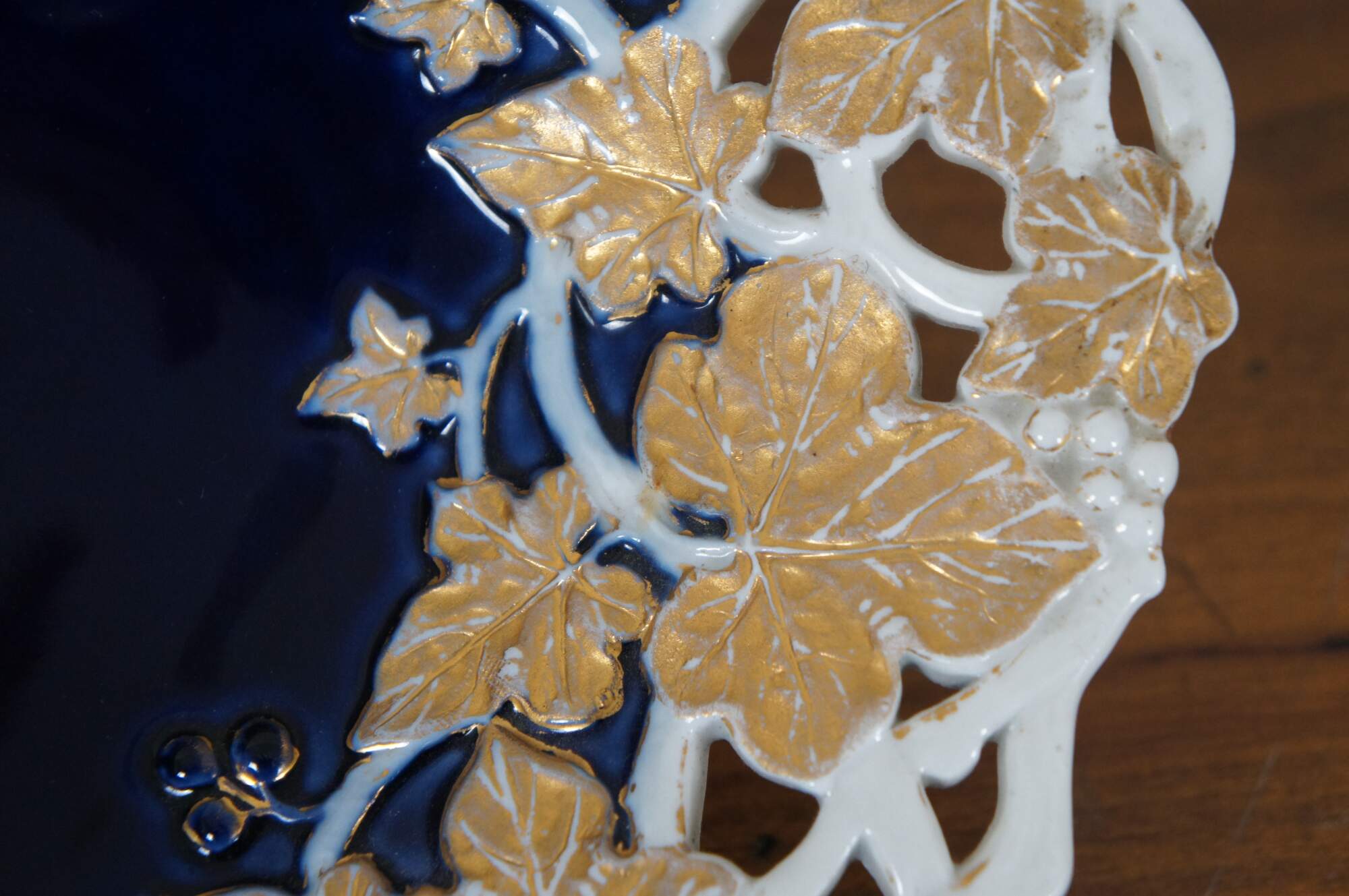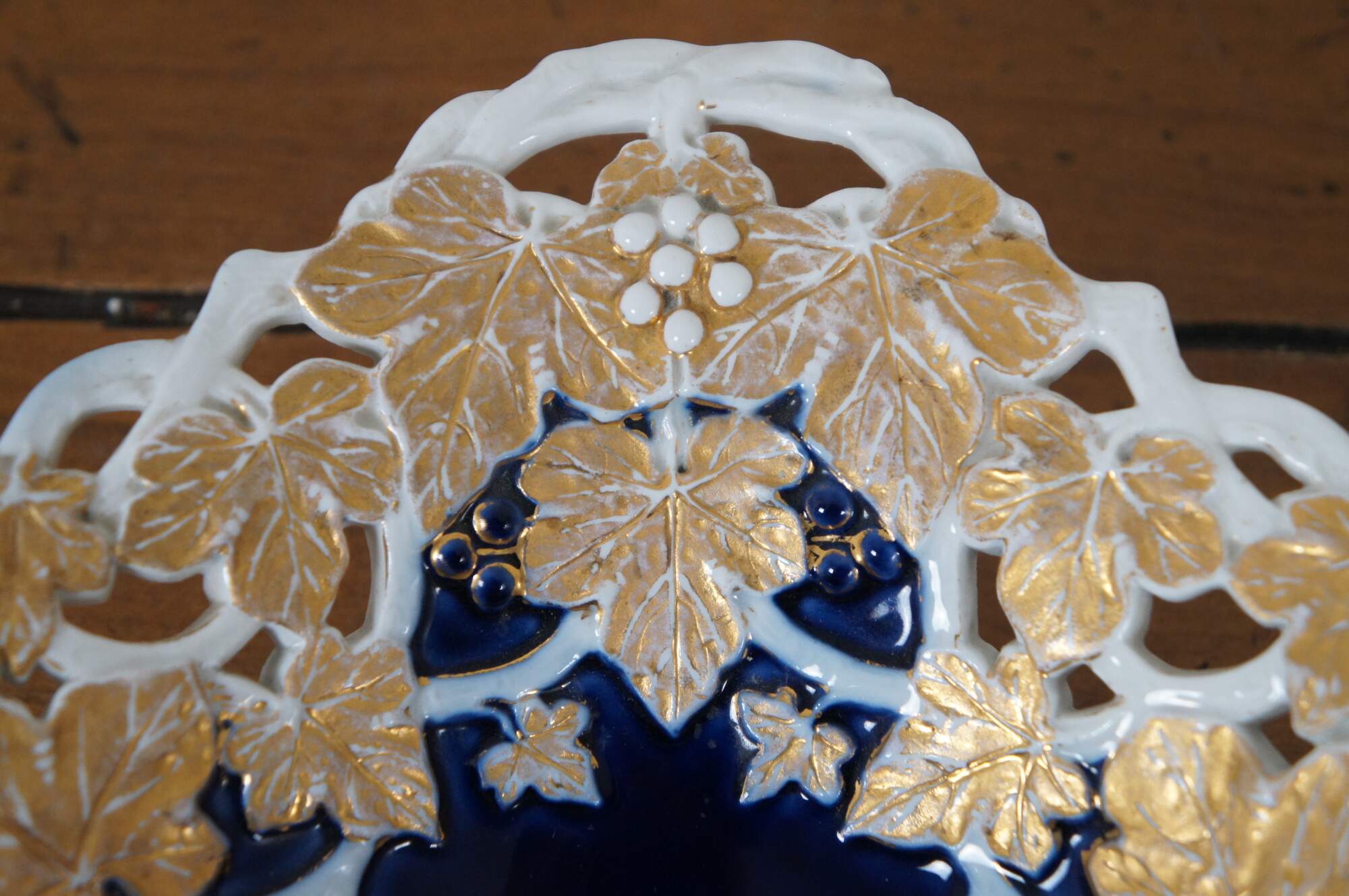 Antique German Dresden Meissen porcelain footed cabinet plate / centerpiece bowl / serving platter / compote featuring scalloped oval form with low relief reticulated design of gold gilt grapevines, grapes and leaves with cobalt blue center and footed base. 1815 to 1860 crossed swords mark.