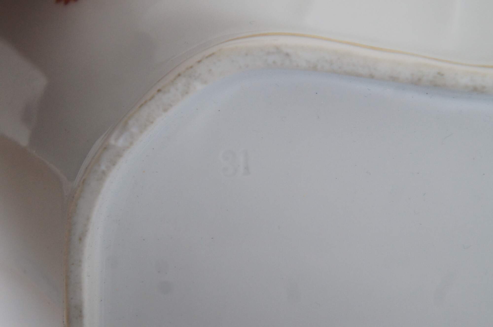 Antique German Dresden porcelain serving bowl or compote featuring square form with serpentine ruffled edge design, gold trim, flowers and insects (butterflies, ladybugs, moths).
