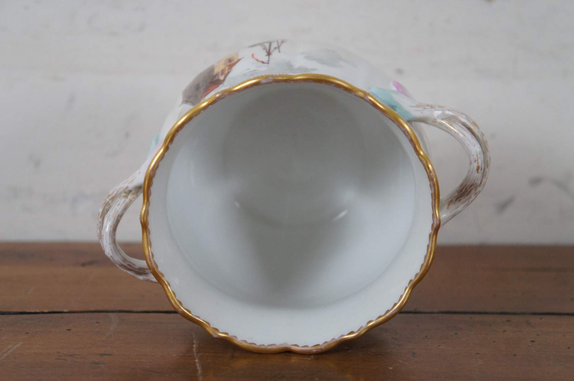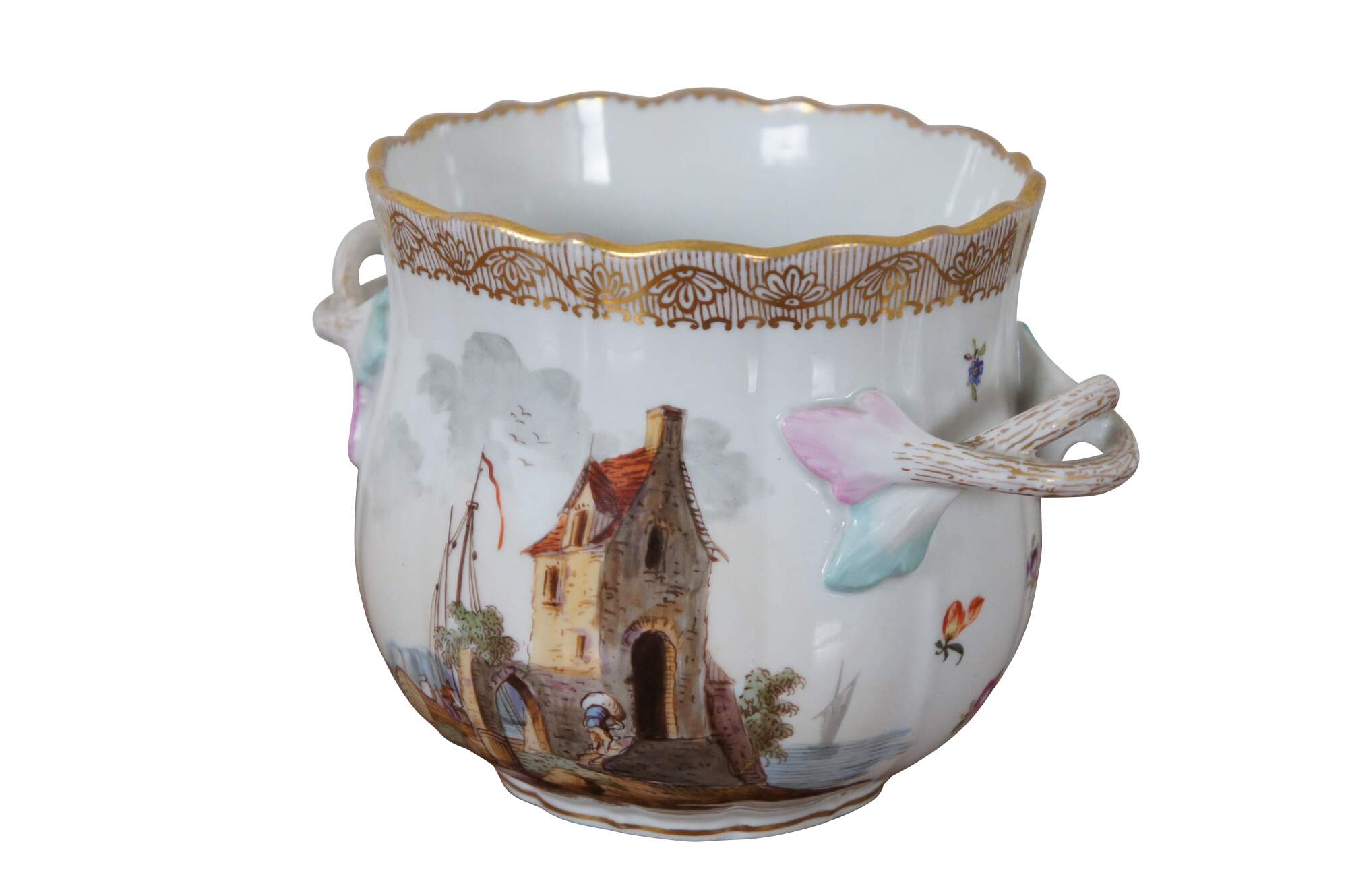 Antique German Dresden porcelain cachepot, jardiniere, planter or vase featuring serpentine edge with handles, and nautical island castle scene with men unloading supplies from boats.