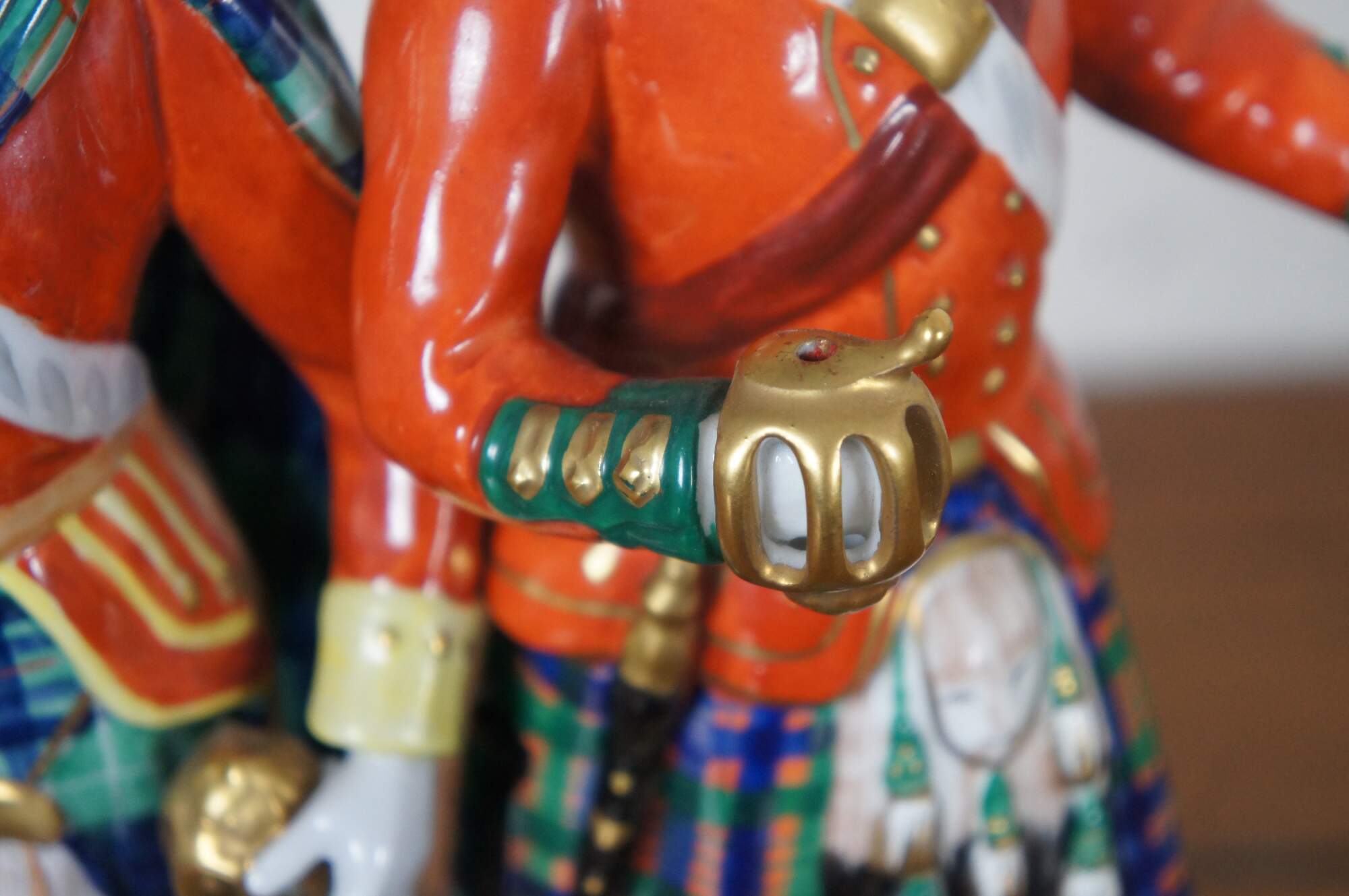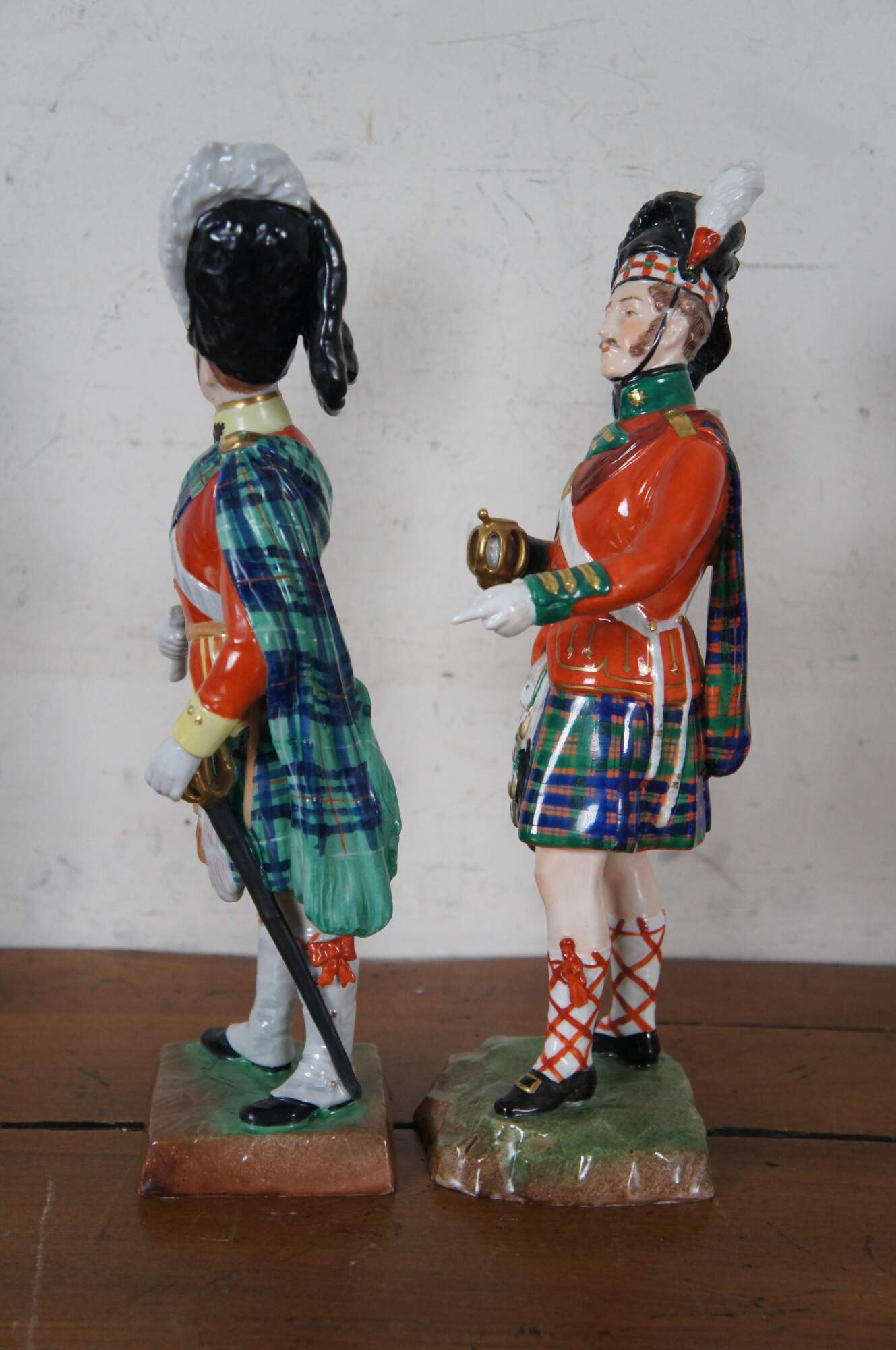 Two antique Carl Thieme German Dresden porcelain polychrome figurines featuring soldiers in Scottish attire.