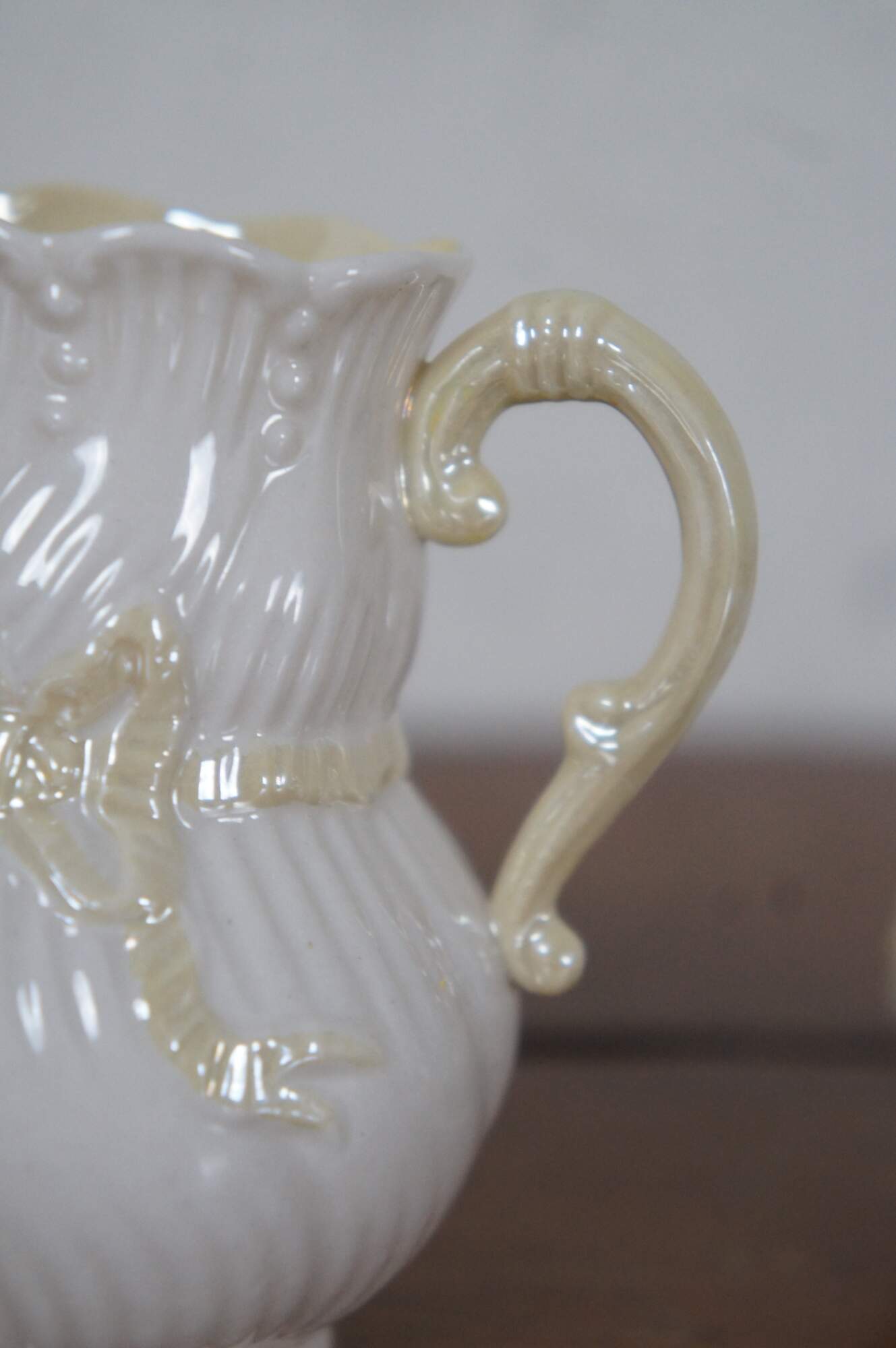 Vintage Belleek Irish porcelain creamer pitcher and suger bowl featuring a Neoclassical ribbon and bow deisgn, circa, 1940s - 1950s.