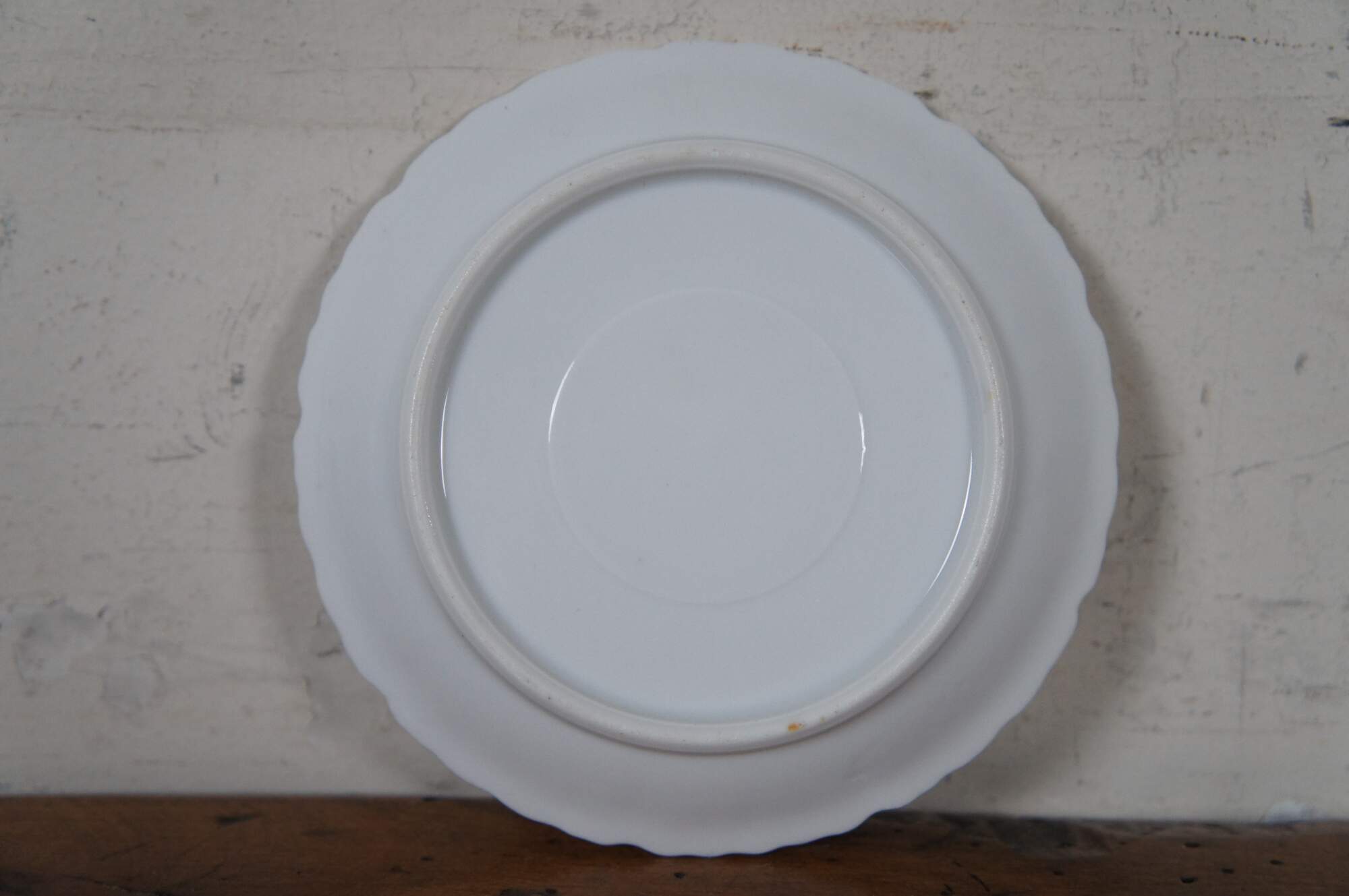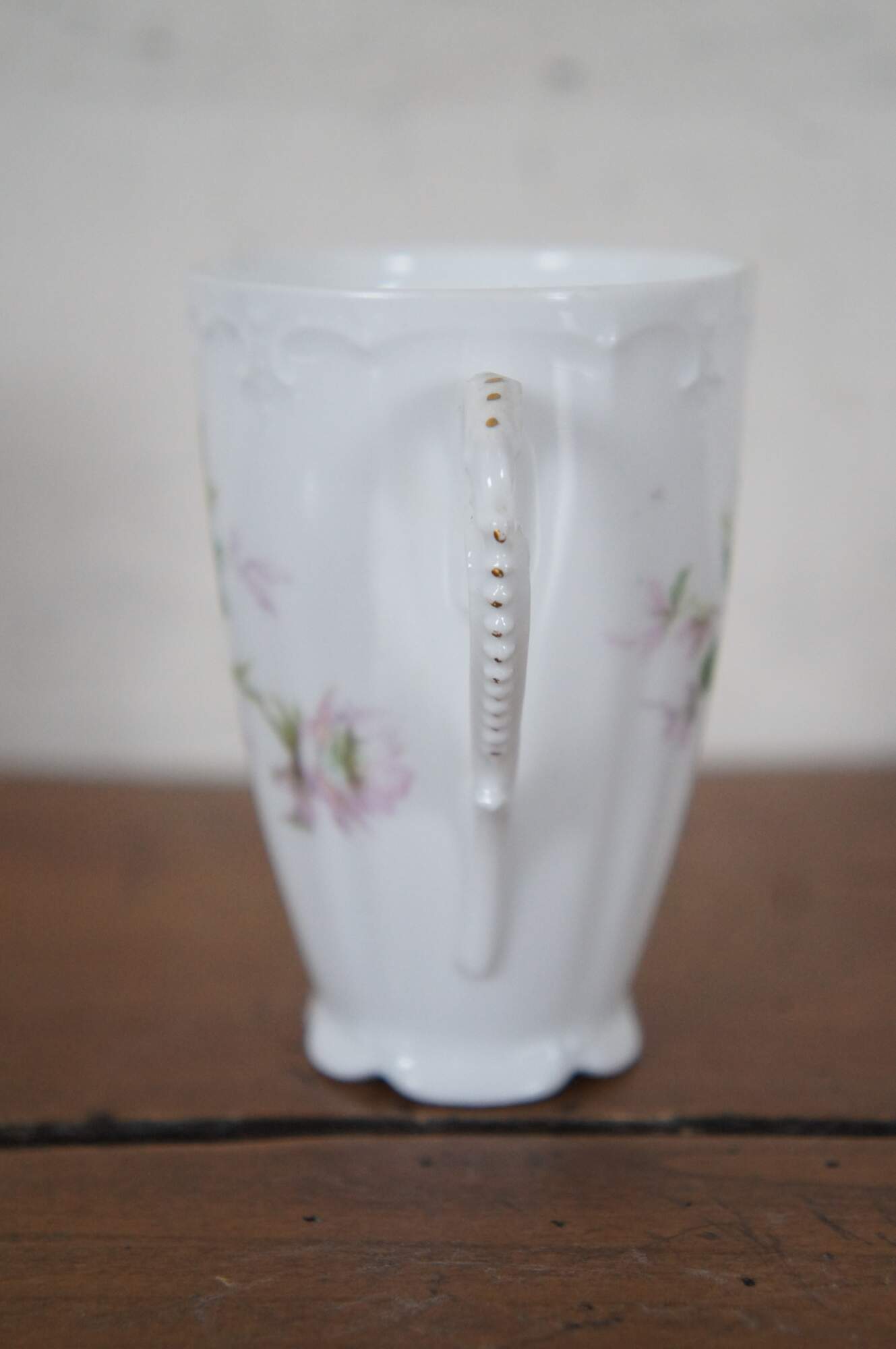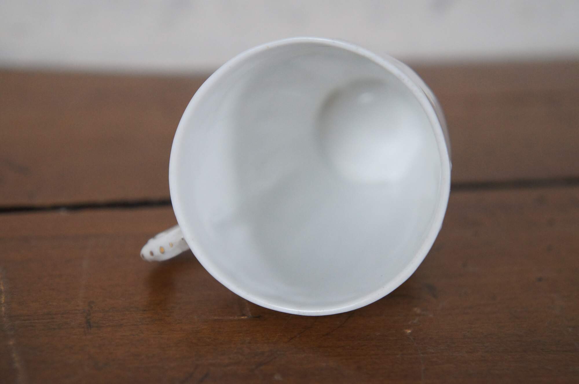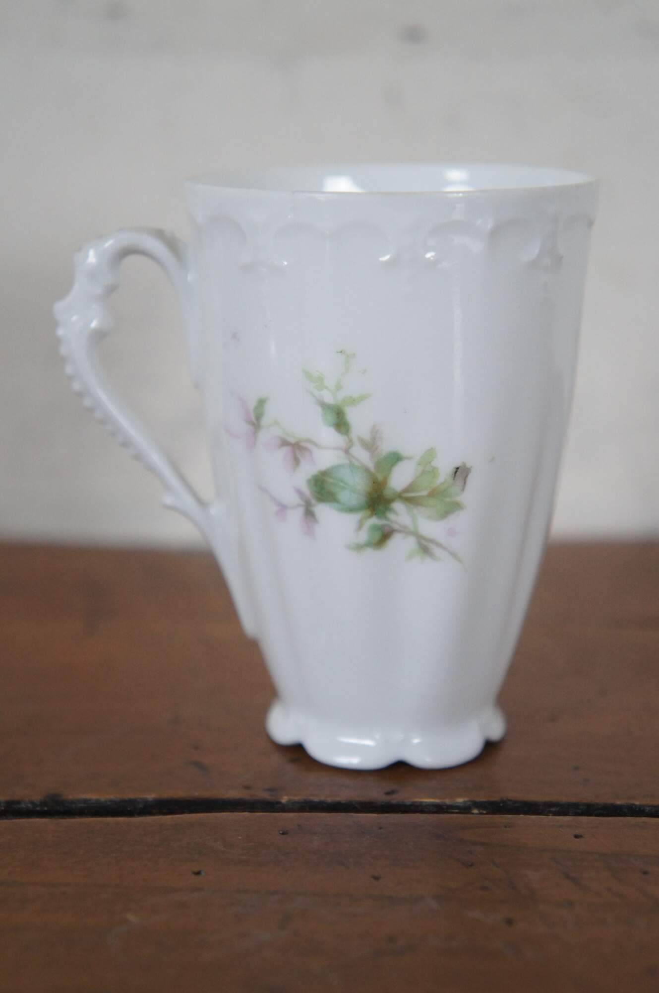 Vintage porcelain demitasse tea or coffee cup and saucer featuring a purple and green floral theme.