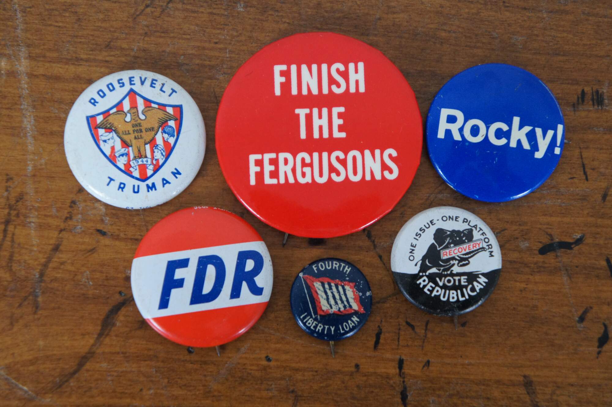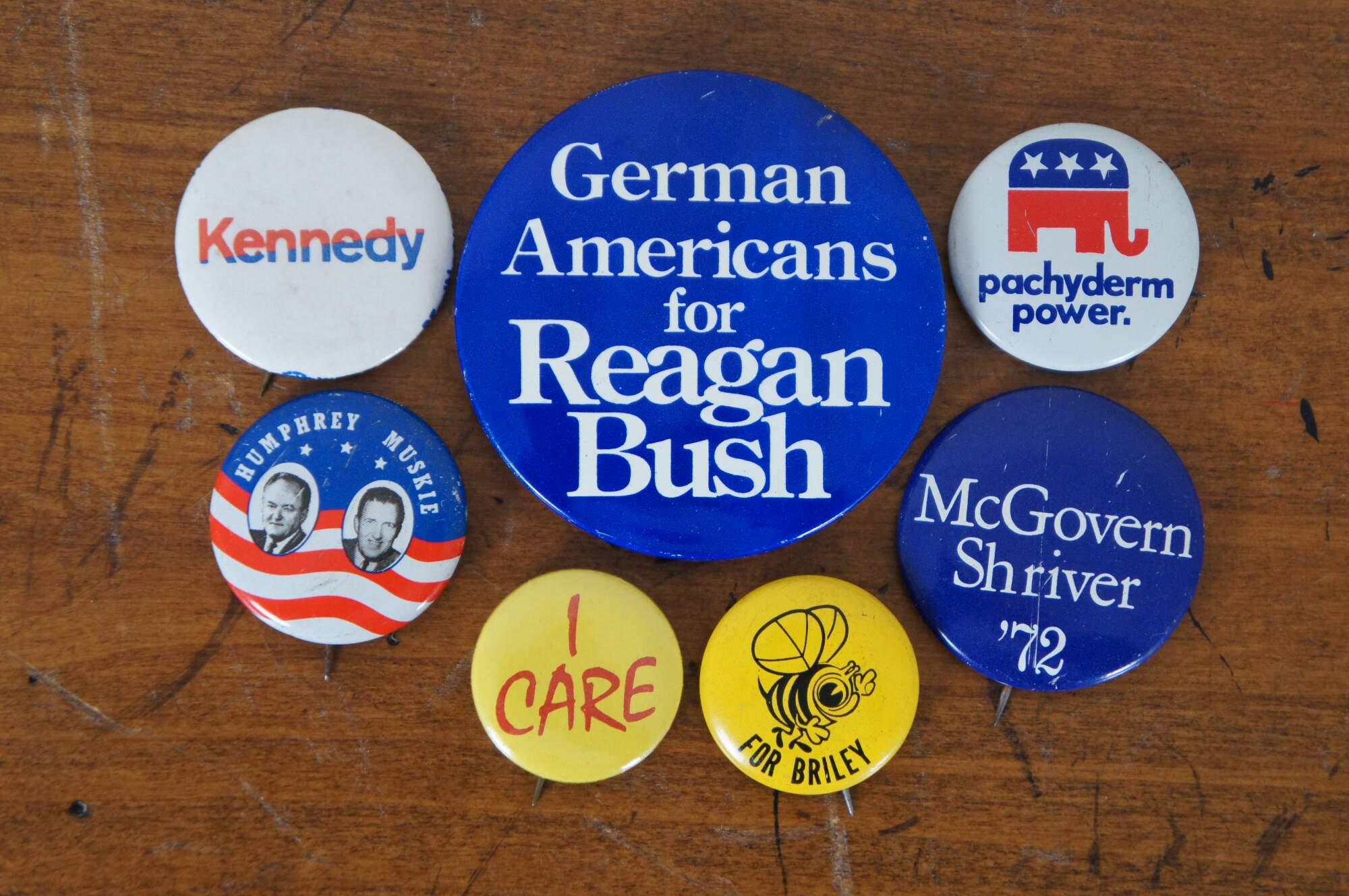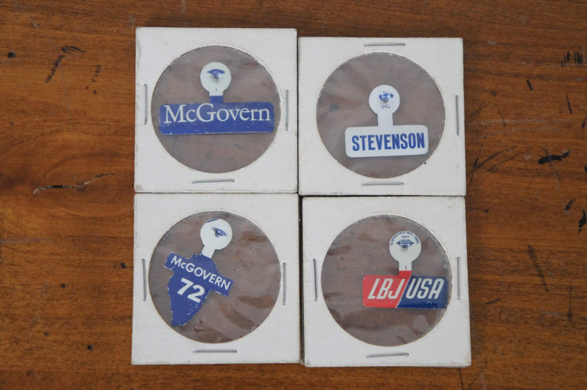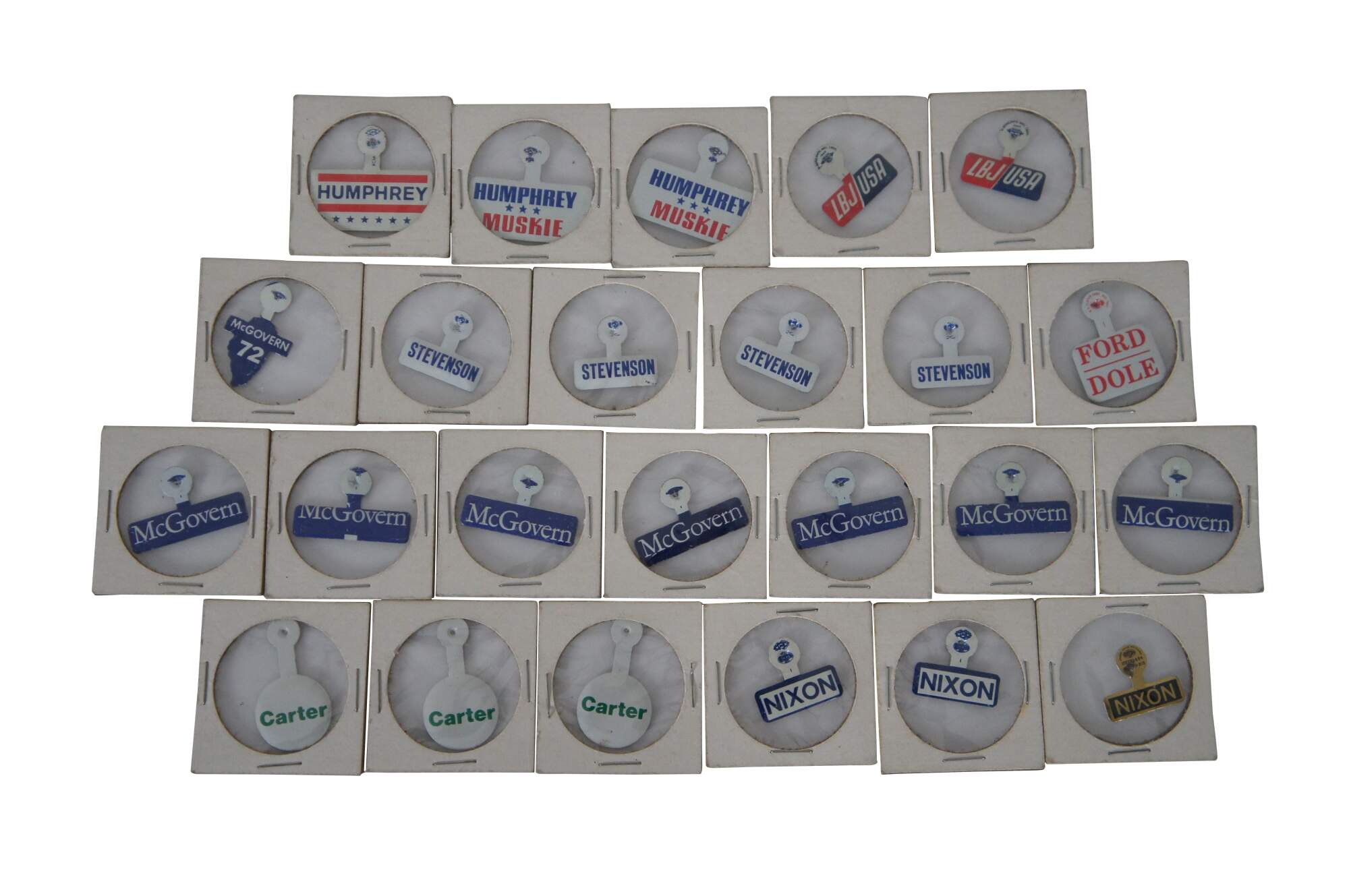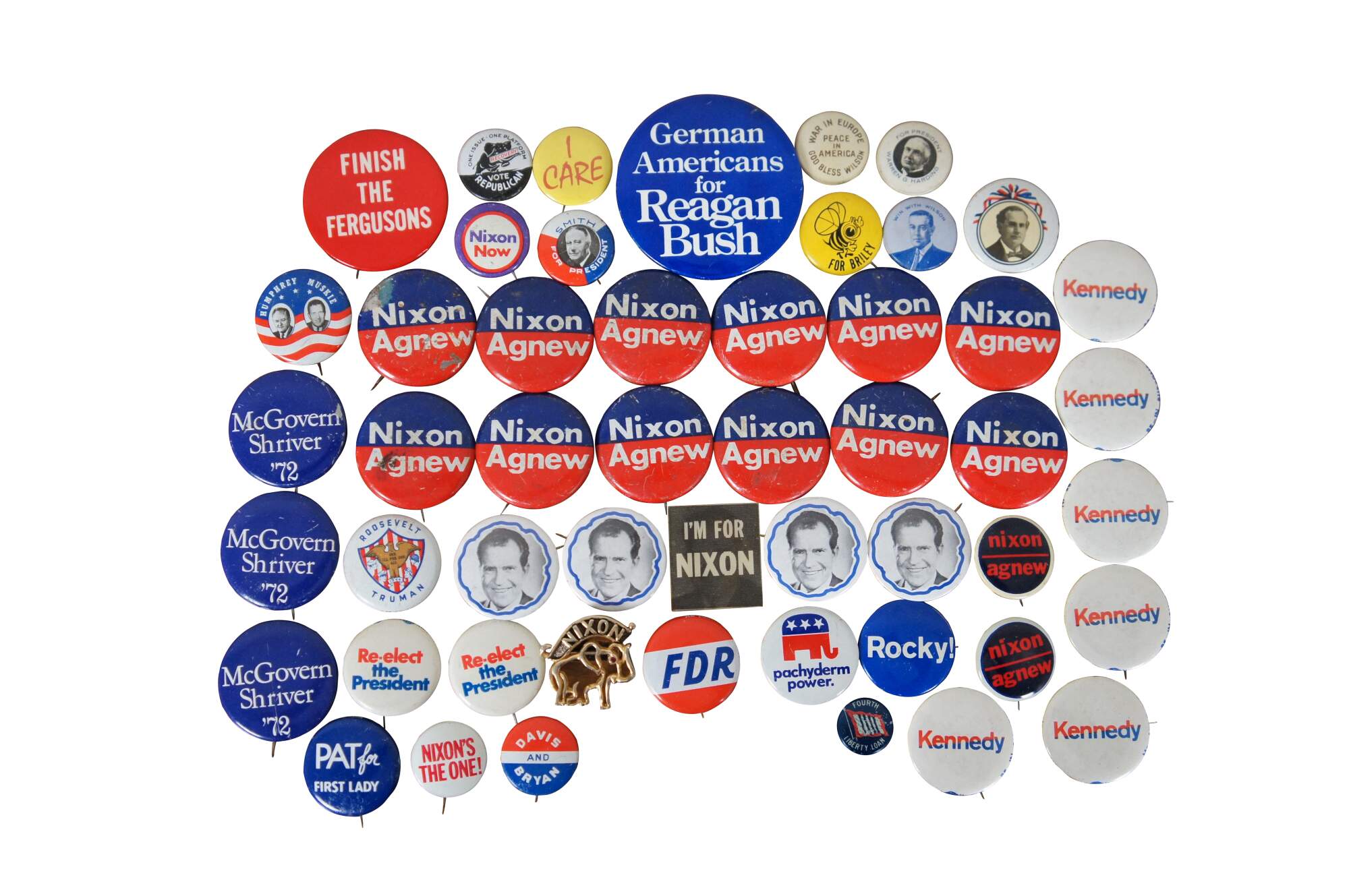 Buttons Included: Bryan (1900), Wilson (1912), Wilson (1916), Fourth Liberty Loan (1918), Harding (1920), Davis/Bryan (1924), Smith (1928), Vote Republican (Hoover 1932), FDR (Roosevelt 1936), Roosevelt/Truman (1944), 4 Stevenson Fold Over (1956) Pat Nixon (1960), 2 LBJ Fold Over (1964), 14 Nixon/Agnew / Nixon’s the One / I’m for Nixon Holographic / 4 Nixon Face / Nixon Gold Elephant by Sears / 3 Nixon Fold Over (1968), Humphrey/Muskie / 2 Humphrey/Muskie Fold Over / Humphrey Fold Over (1968), 6 Kennedy (1968), 3 McGovern/Shriver / 8 McGovern Fold Over (1972), 2 Re-elect / Nixon Now (Nixon 1972), 3 Carter Fold Over (1976), Ford/Dole Fold Over (1976), Reagan/Bush (1984)