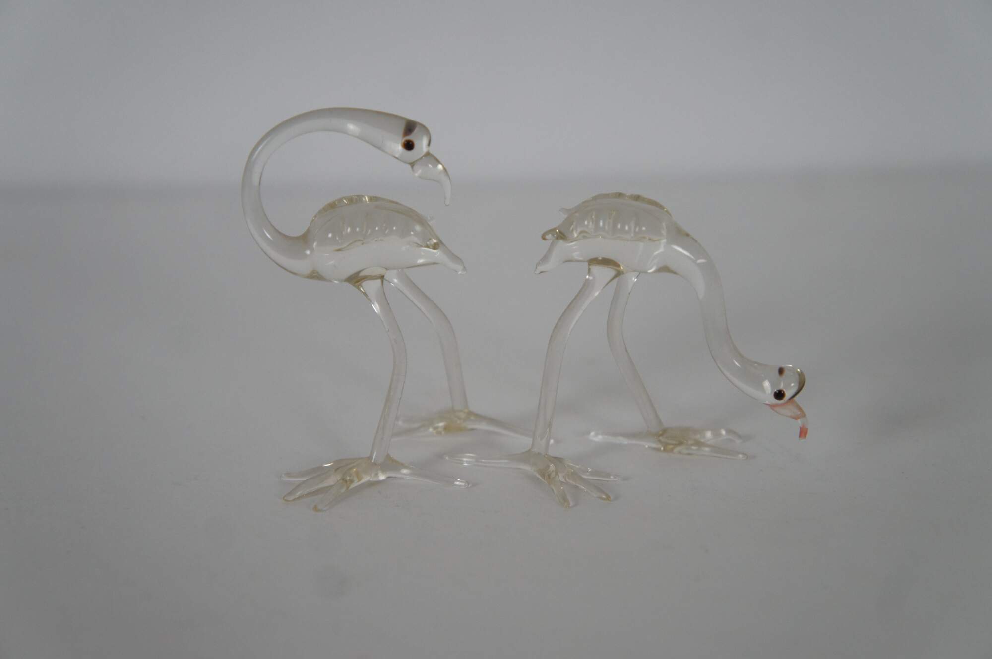Seven vintage hand blown animals. Made of clear art glass featuring six birds (stork, flamingo) and one howling dog or wolf. Murano or German.