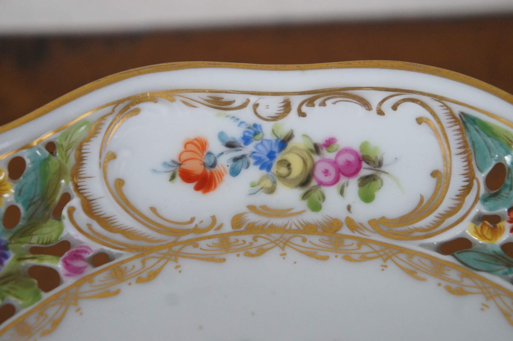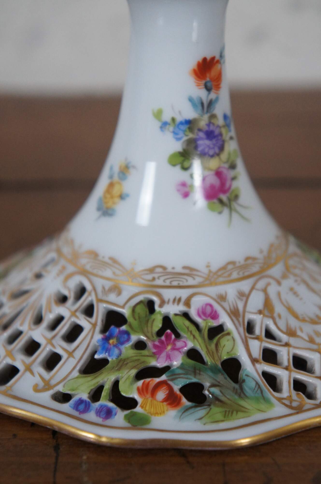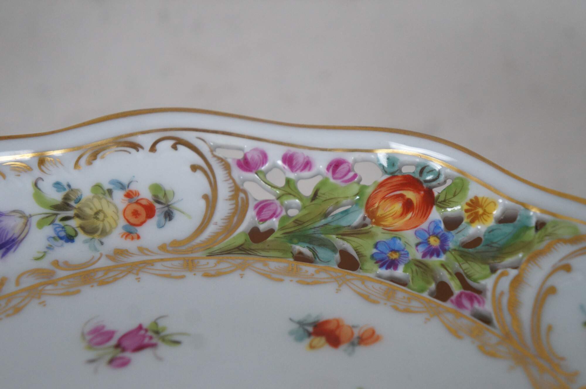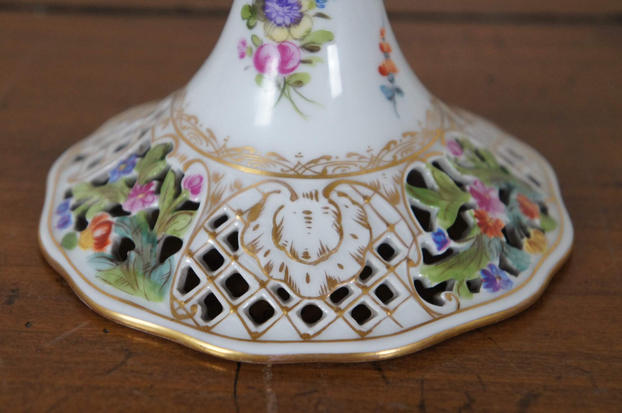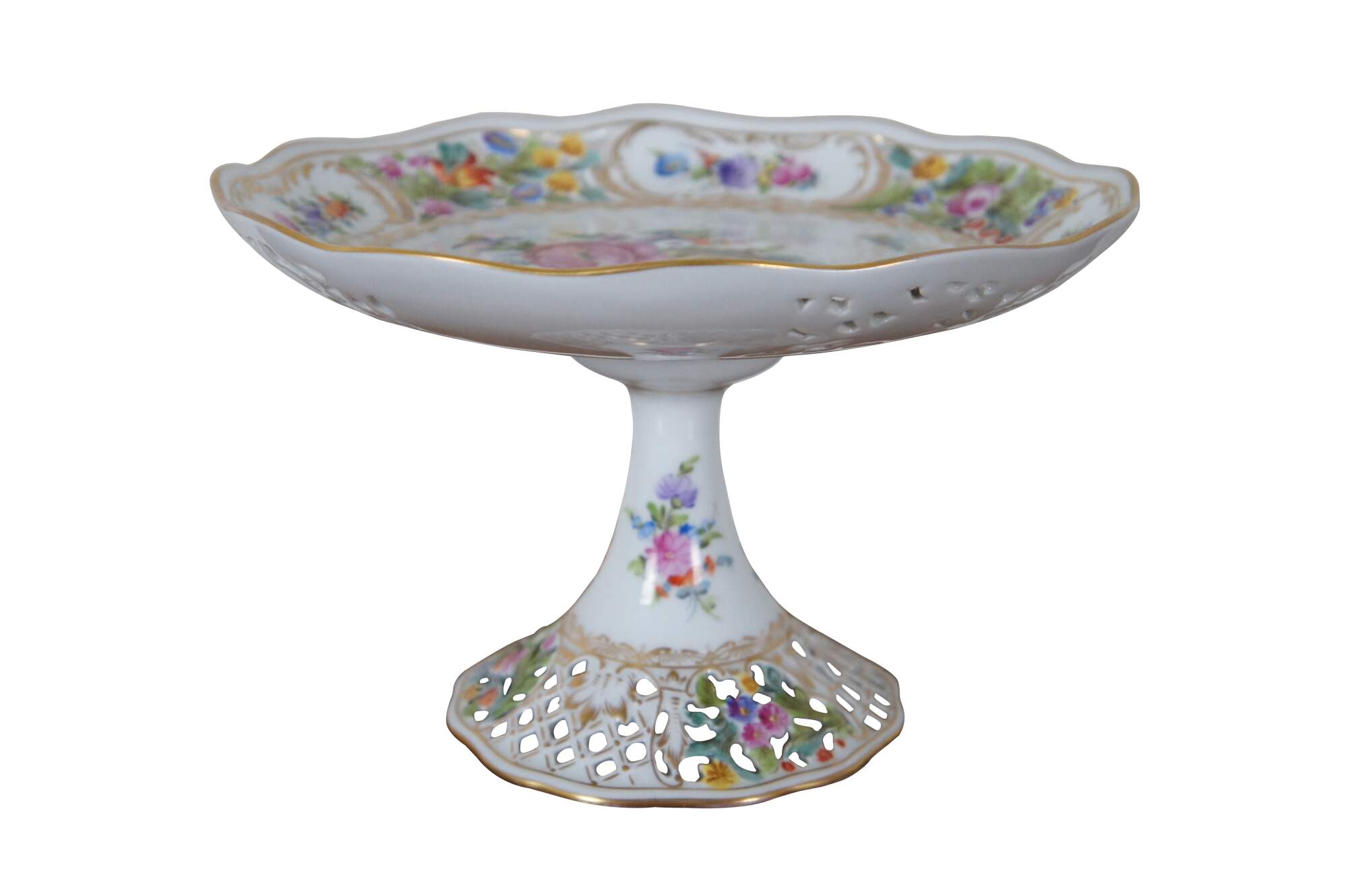 Antique Carl Thieme German Dresden centerpiece serving compote. Made of porcelain featuring footed pedestal base and reticulated / pierced scalloped shallow bowl or cake plate with floral design. Circa 1902-1920.