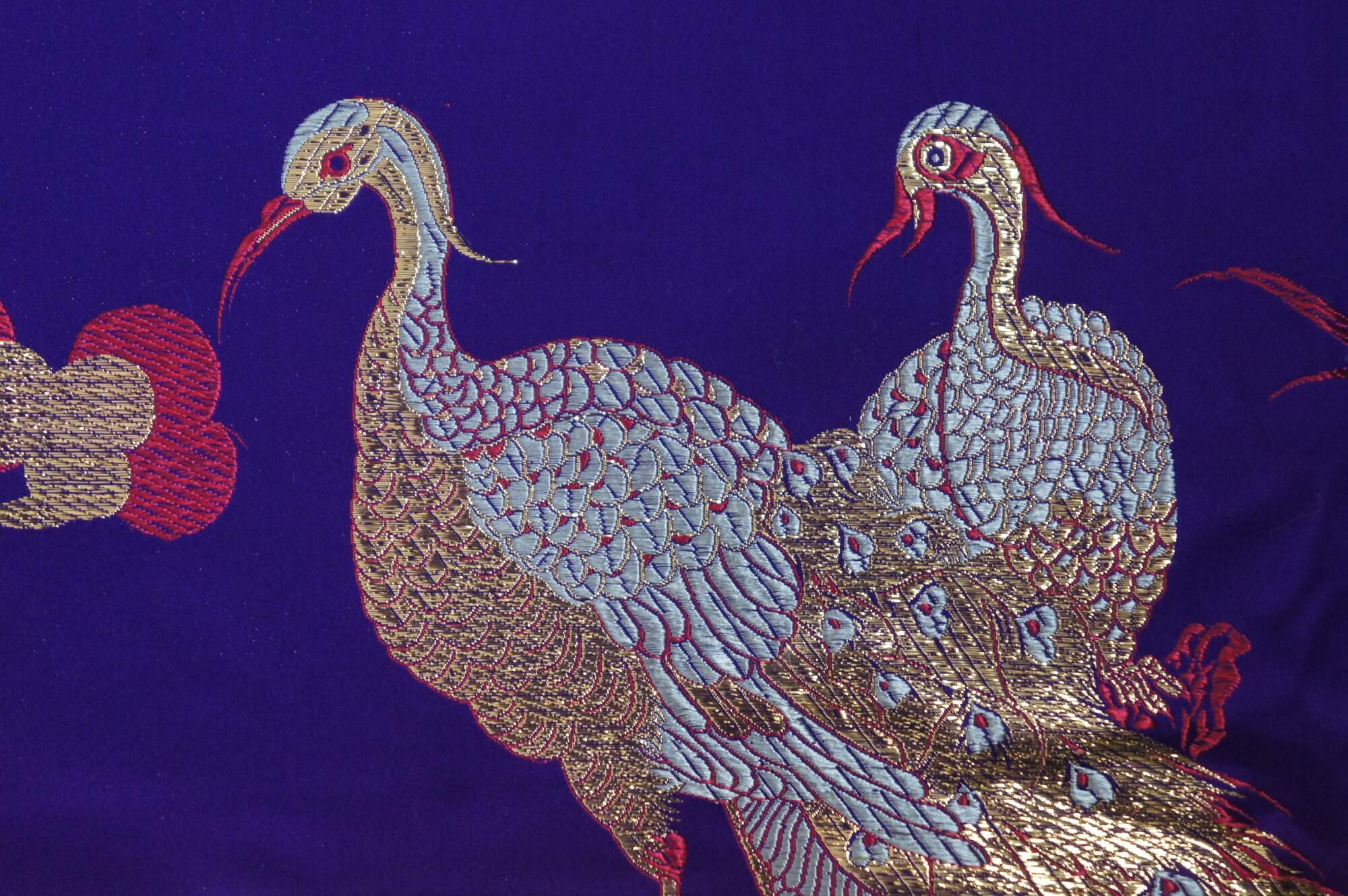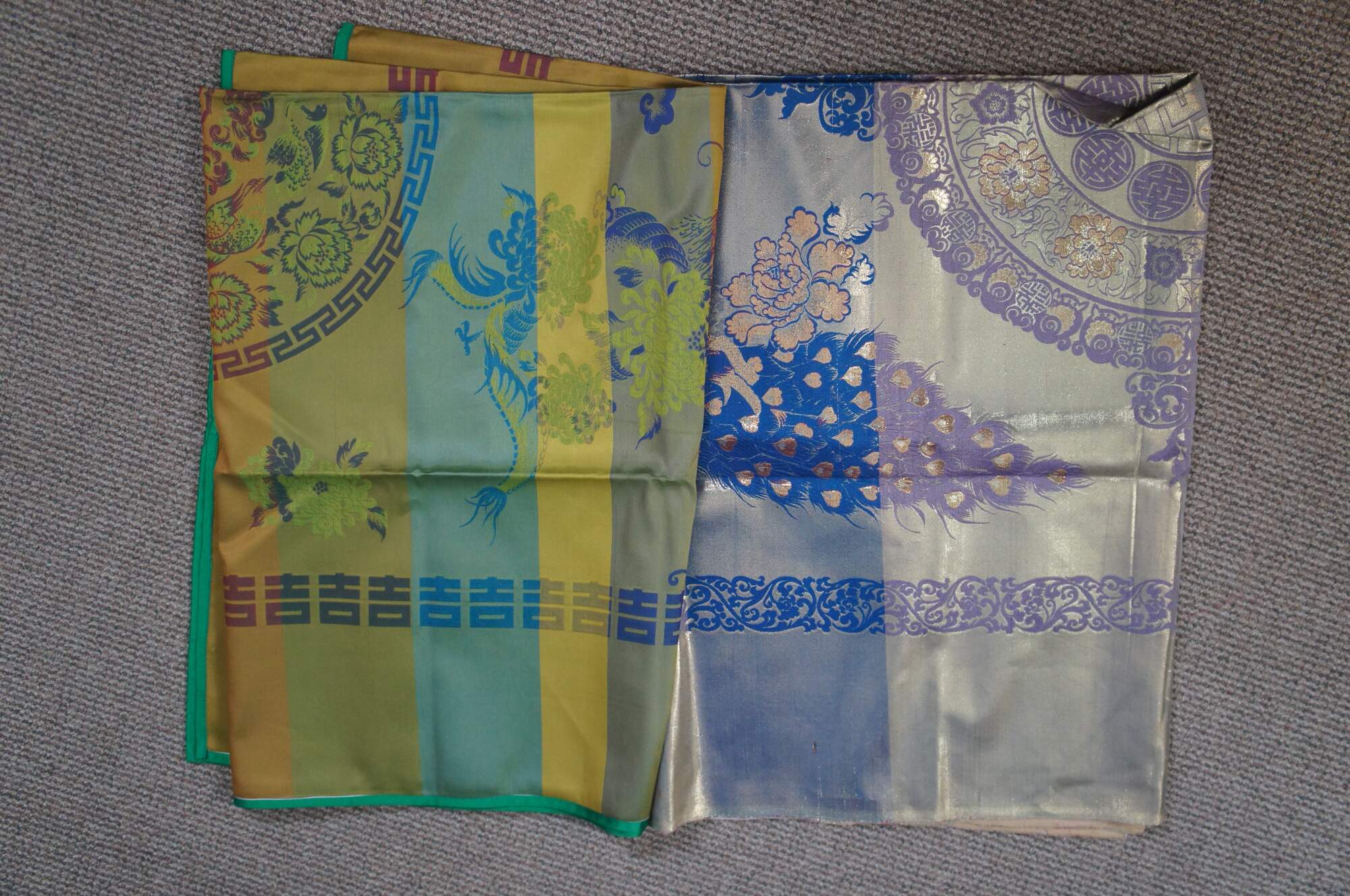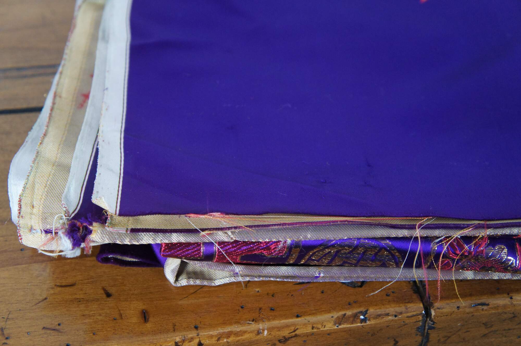 Two vintage Korean textile tapestries. Made of silk featuring metallic gold embroidery with medallions, peacocks and dragons. One purple, one green. Wall hanging. Tablecloth.