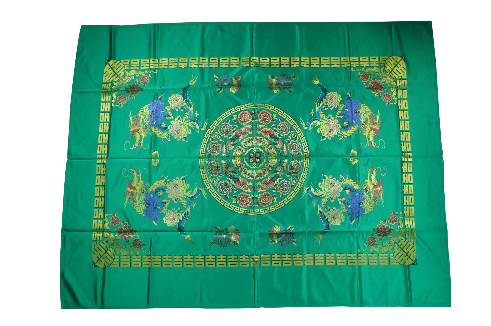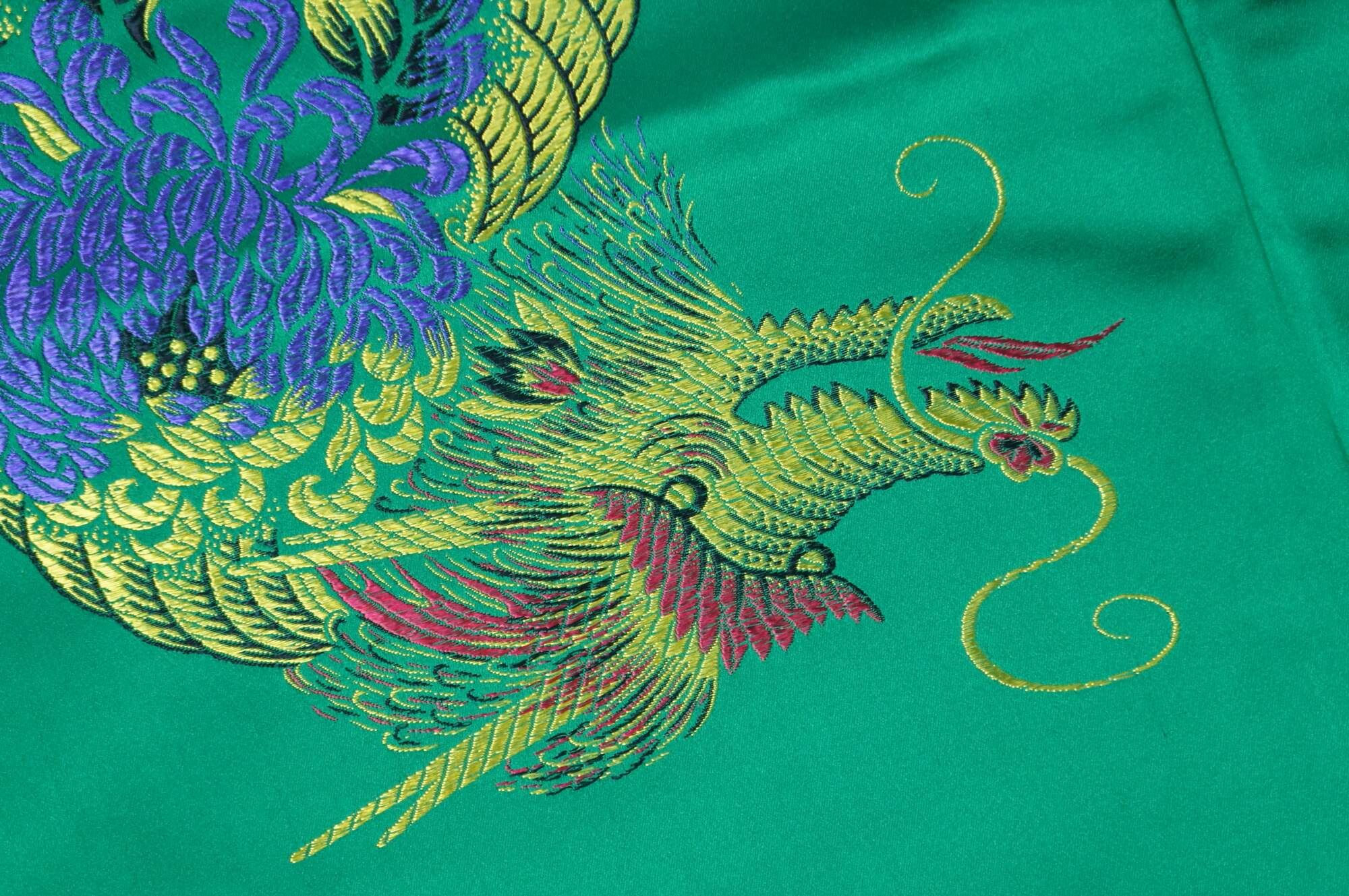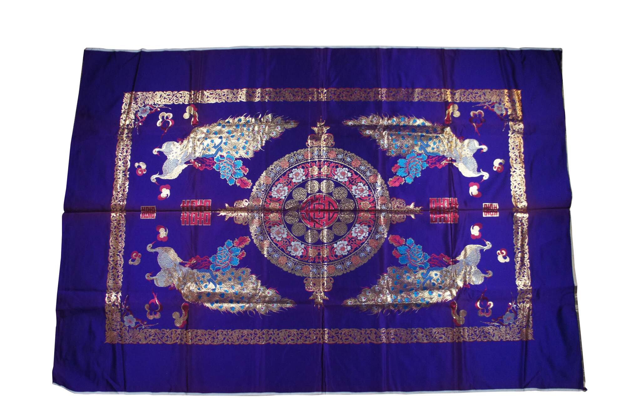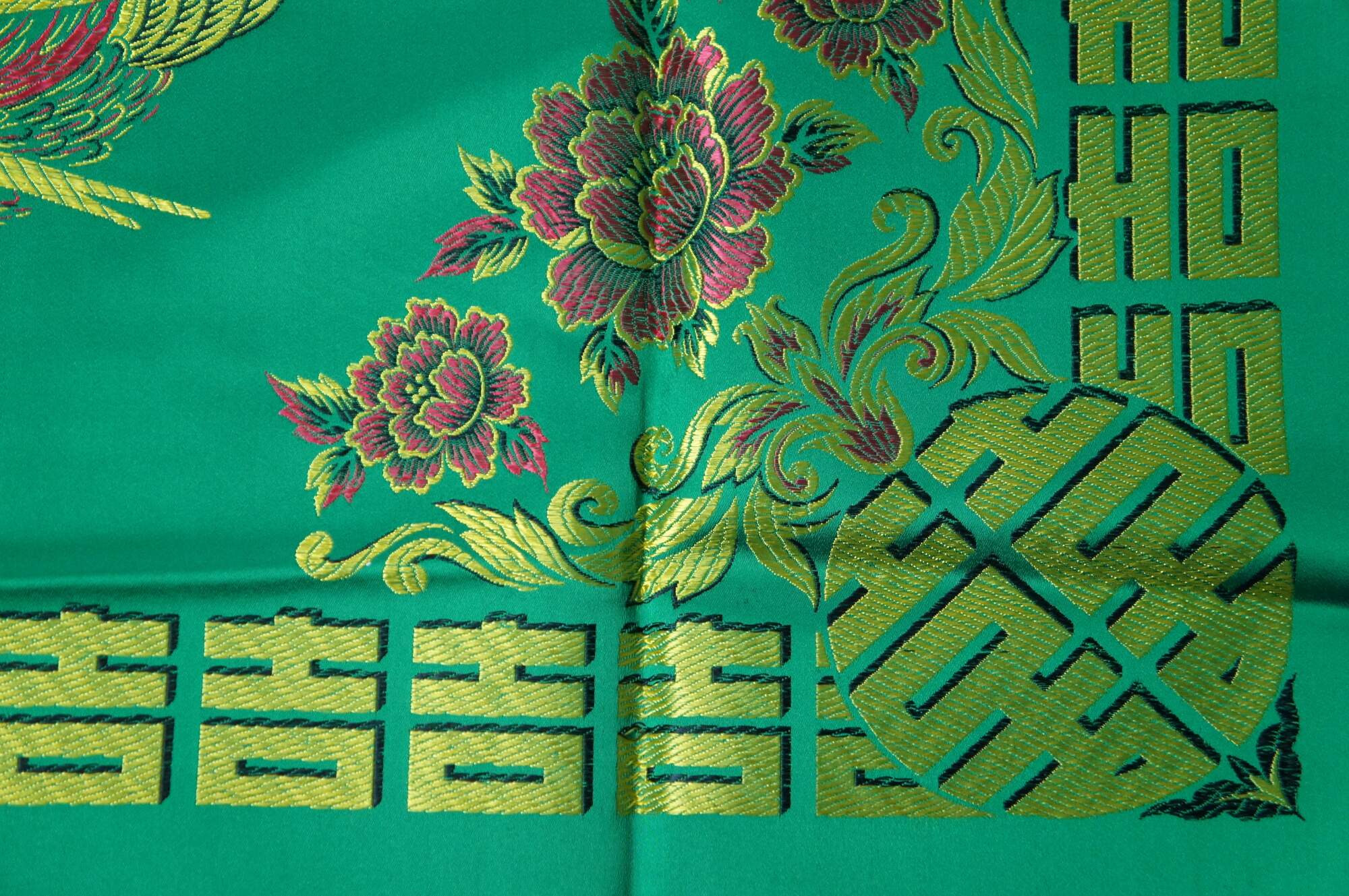 Two vintage Korean textile tapestries. Made of silk featuring metallic gold embroidery with medallions, peacocks and dragons. One purple, one green. Wall hanging. Tablecloth.