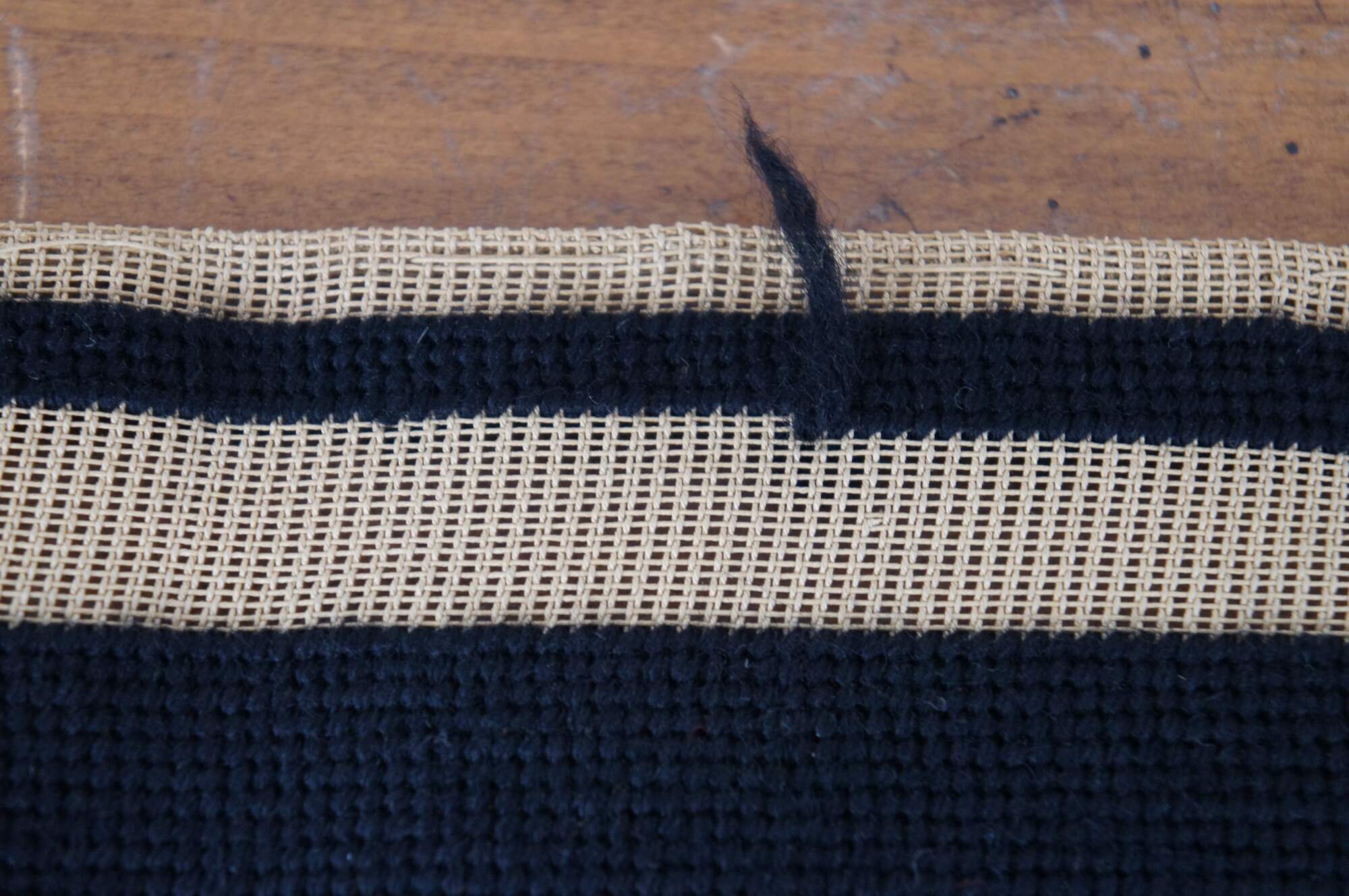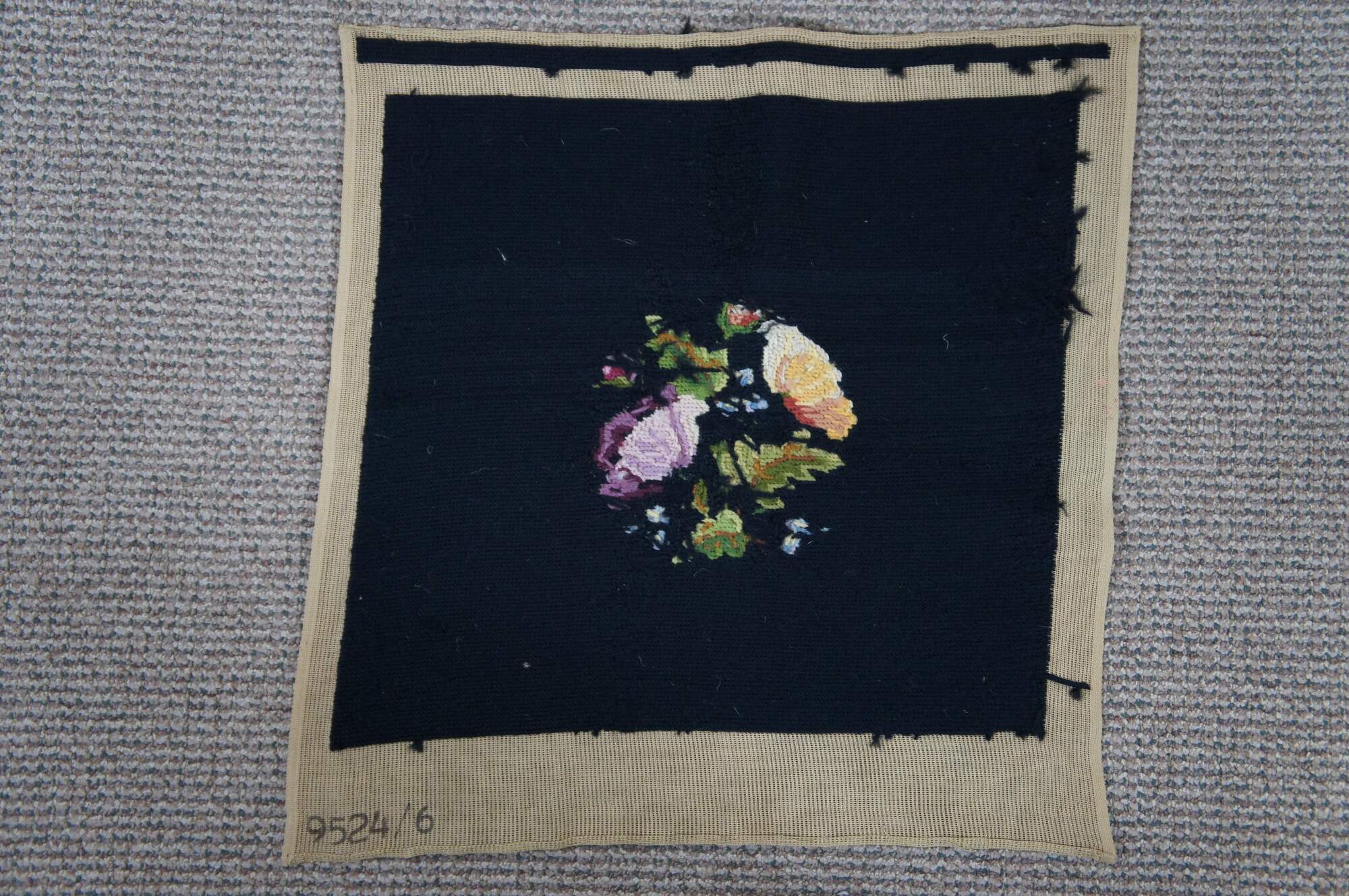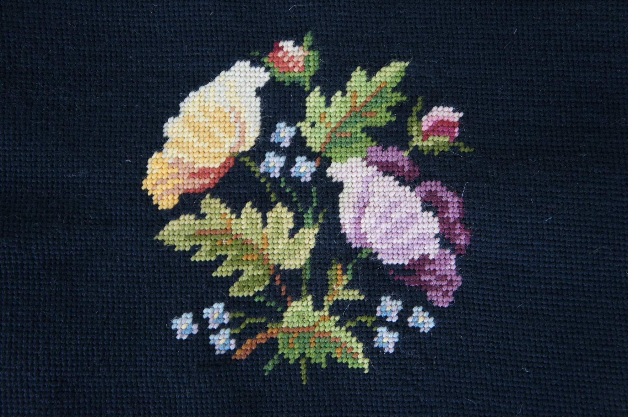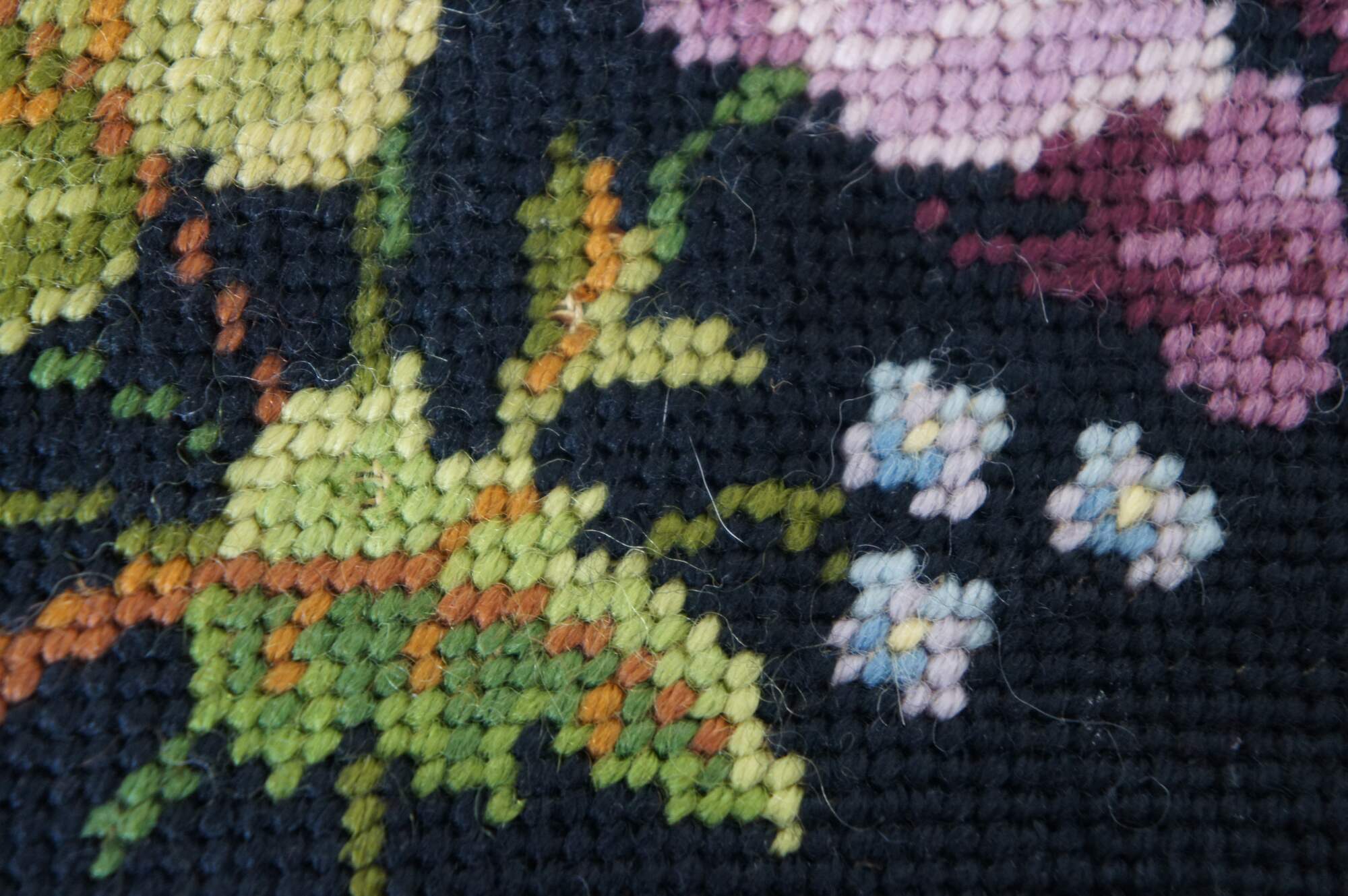 Vintage Bucilla needlepoint tapestry featuring floral motif in black with green, purple and yellow. Seat cover, pillow, foot stool, ottoman, chair, seat.