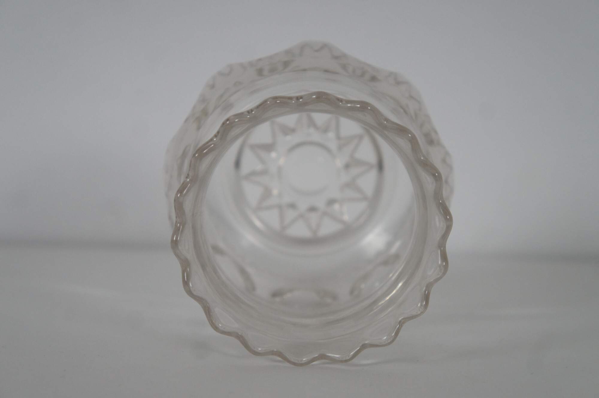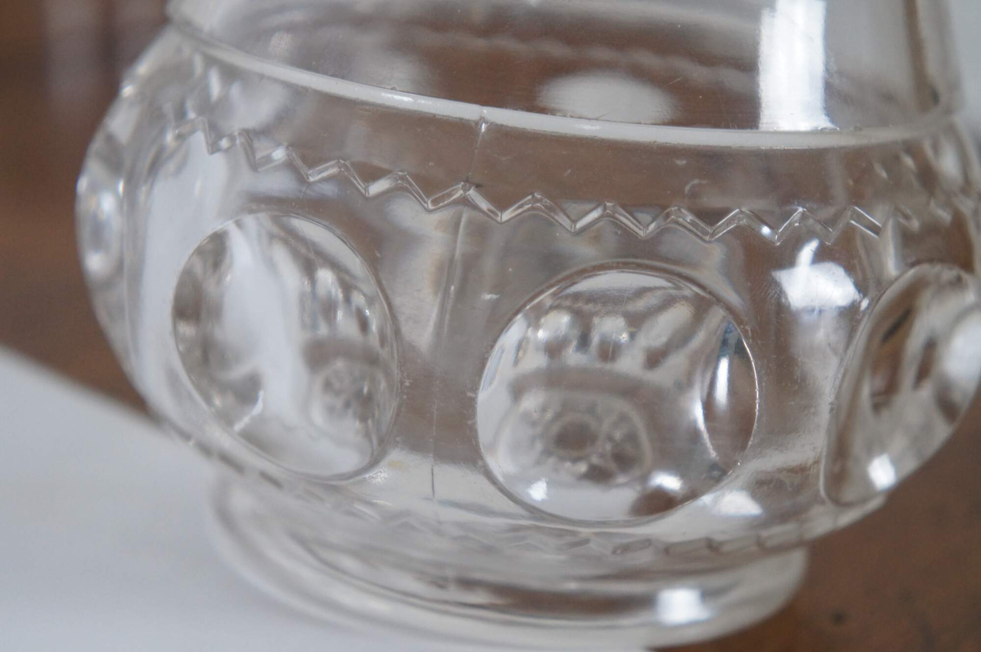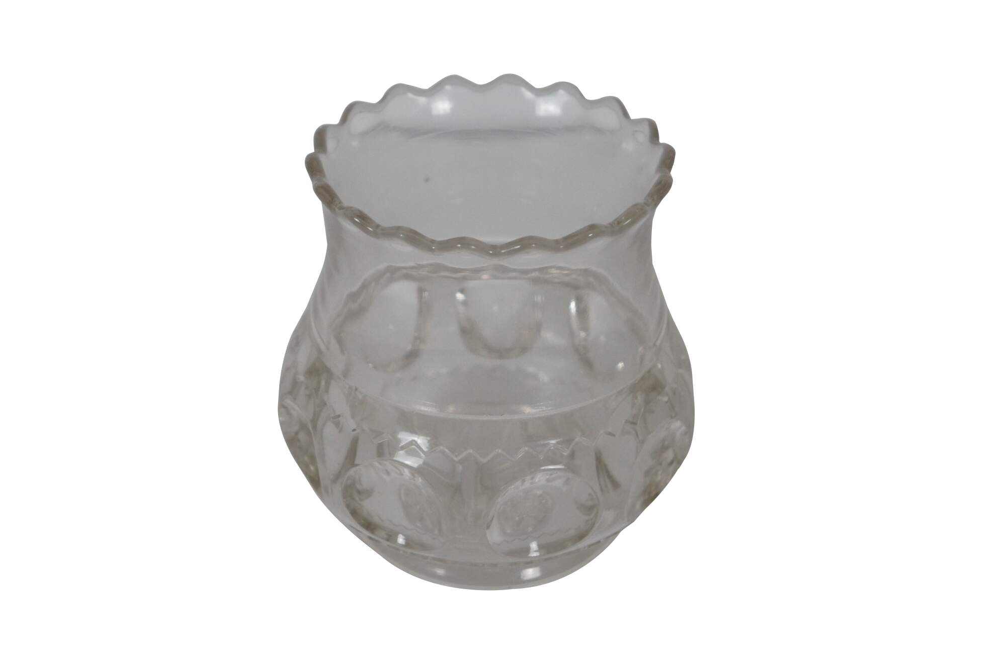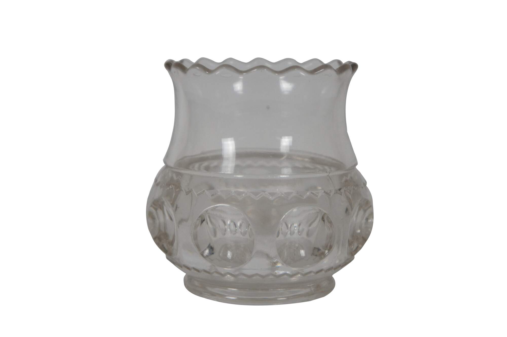 Antique Victorian EAPG kings crown pressed glass spooner vase or toothpick holder featuring thumbprint and sawtooth design.