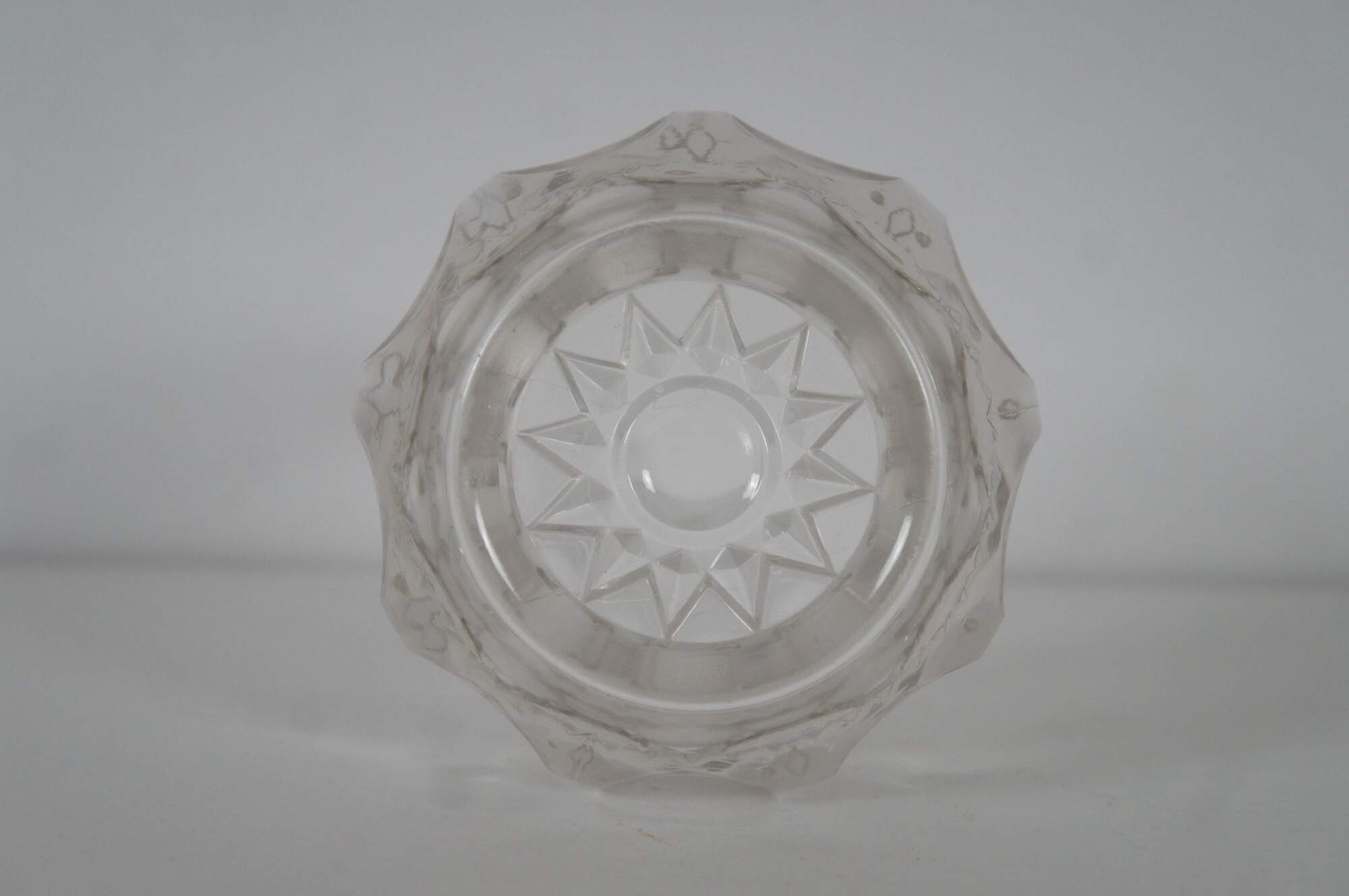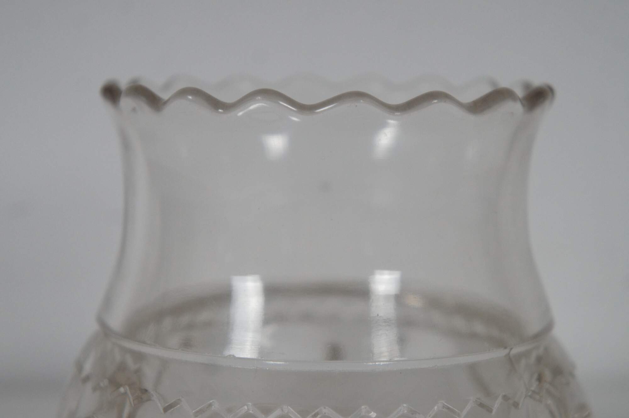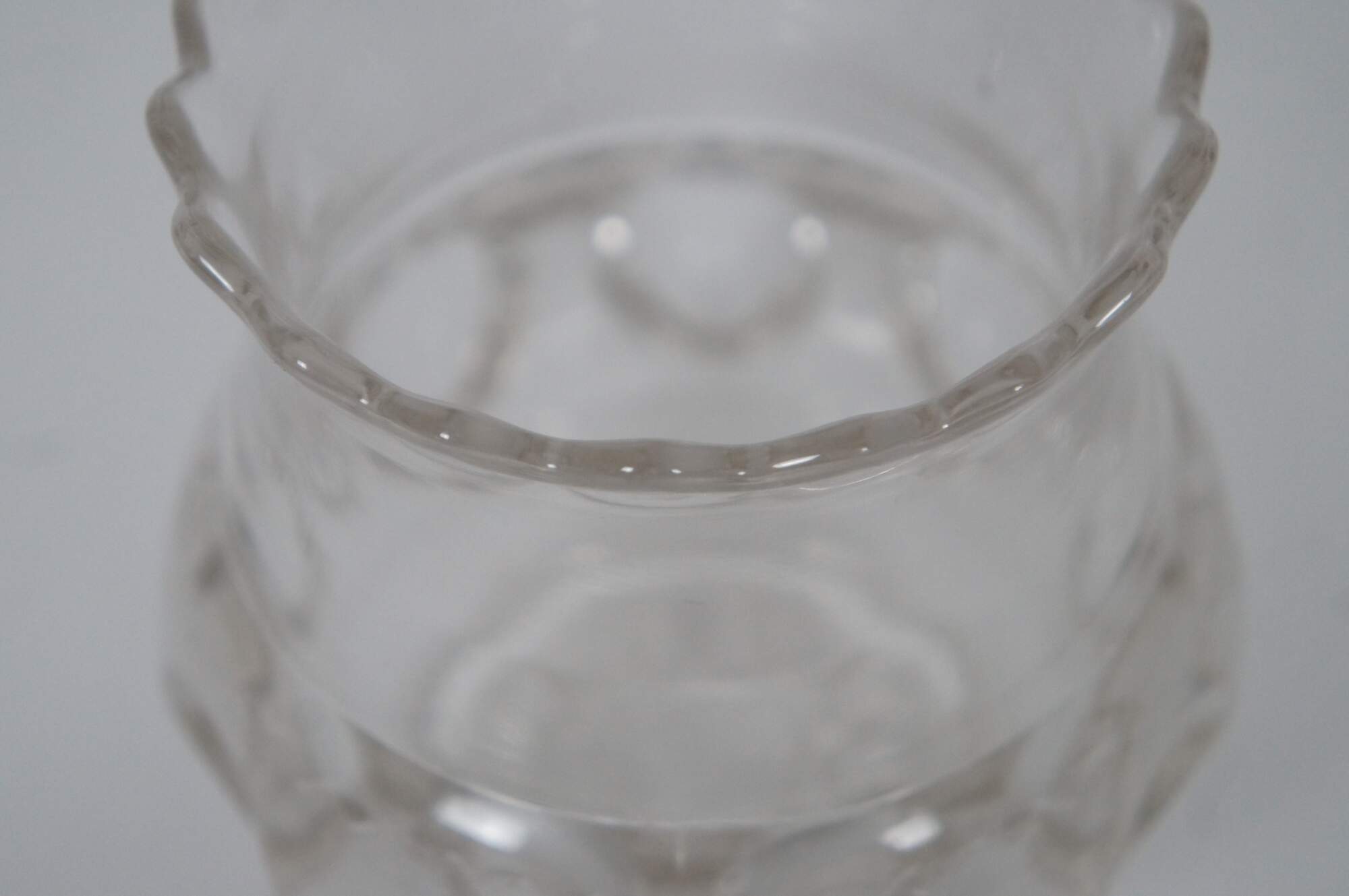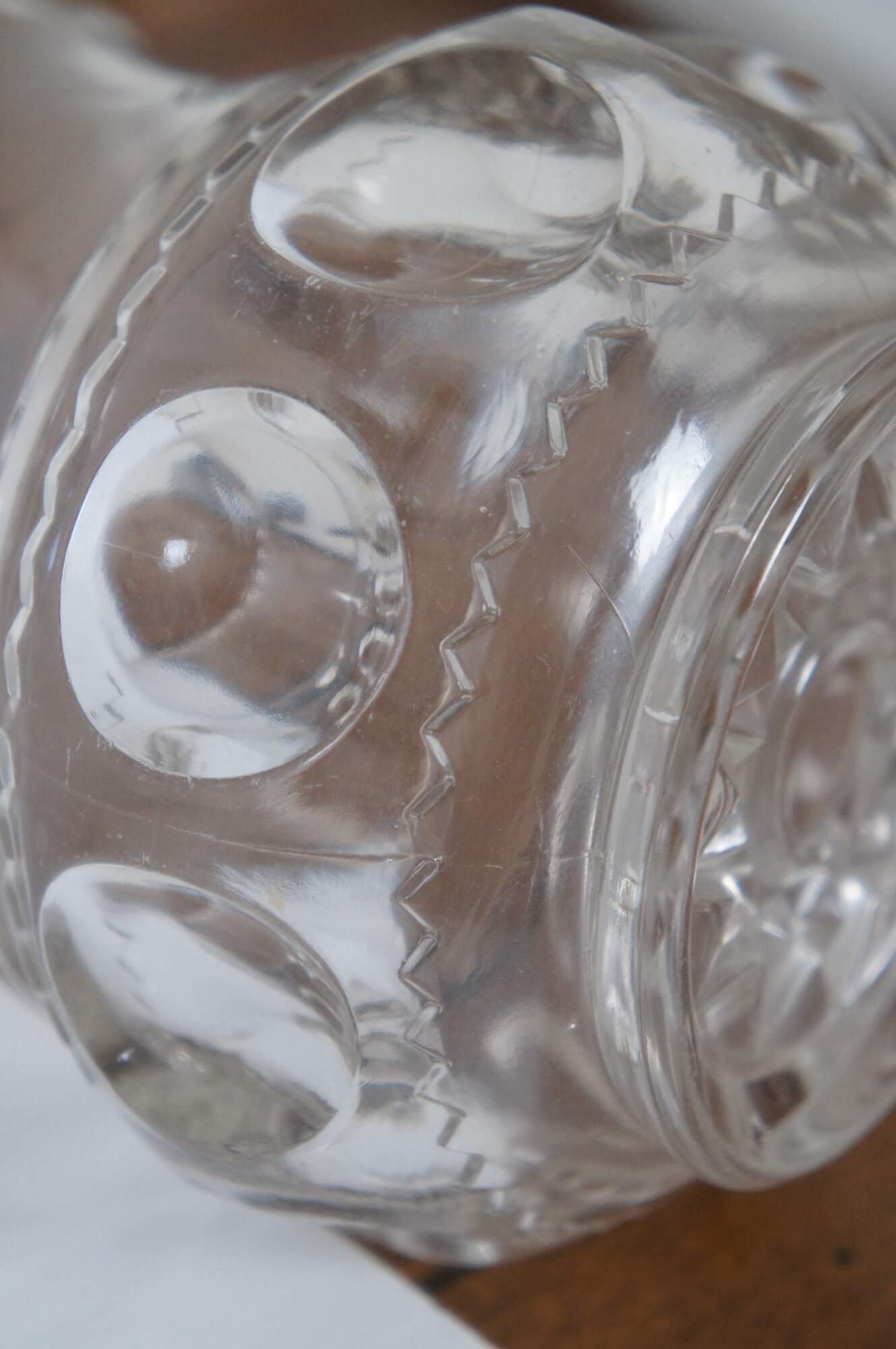 Antique Victorian EAPG kings crown pressed glass spooner vase or toothpick holder featuring thumbprint and sawtooth design.
