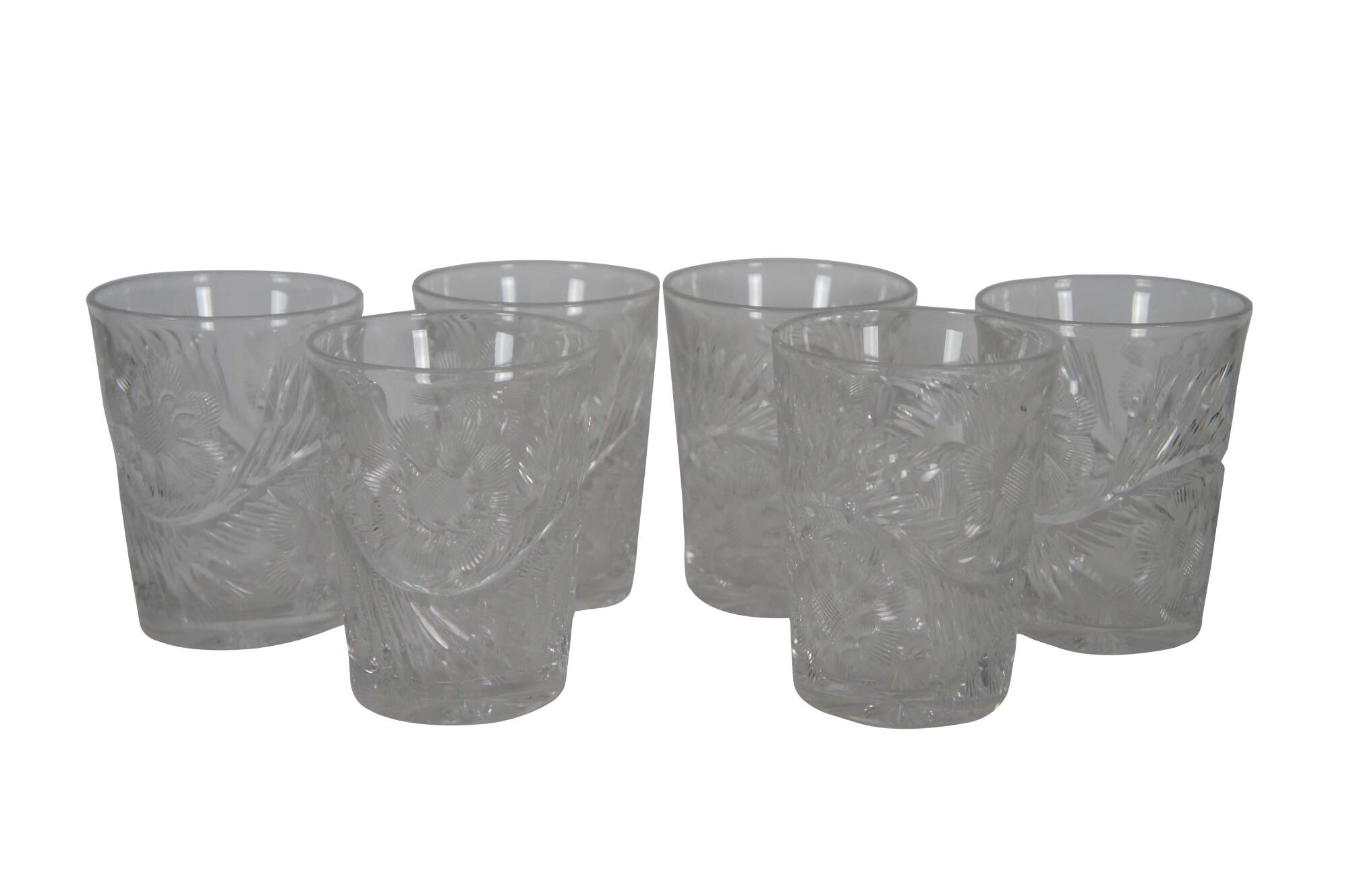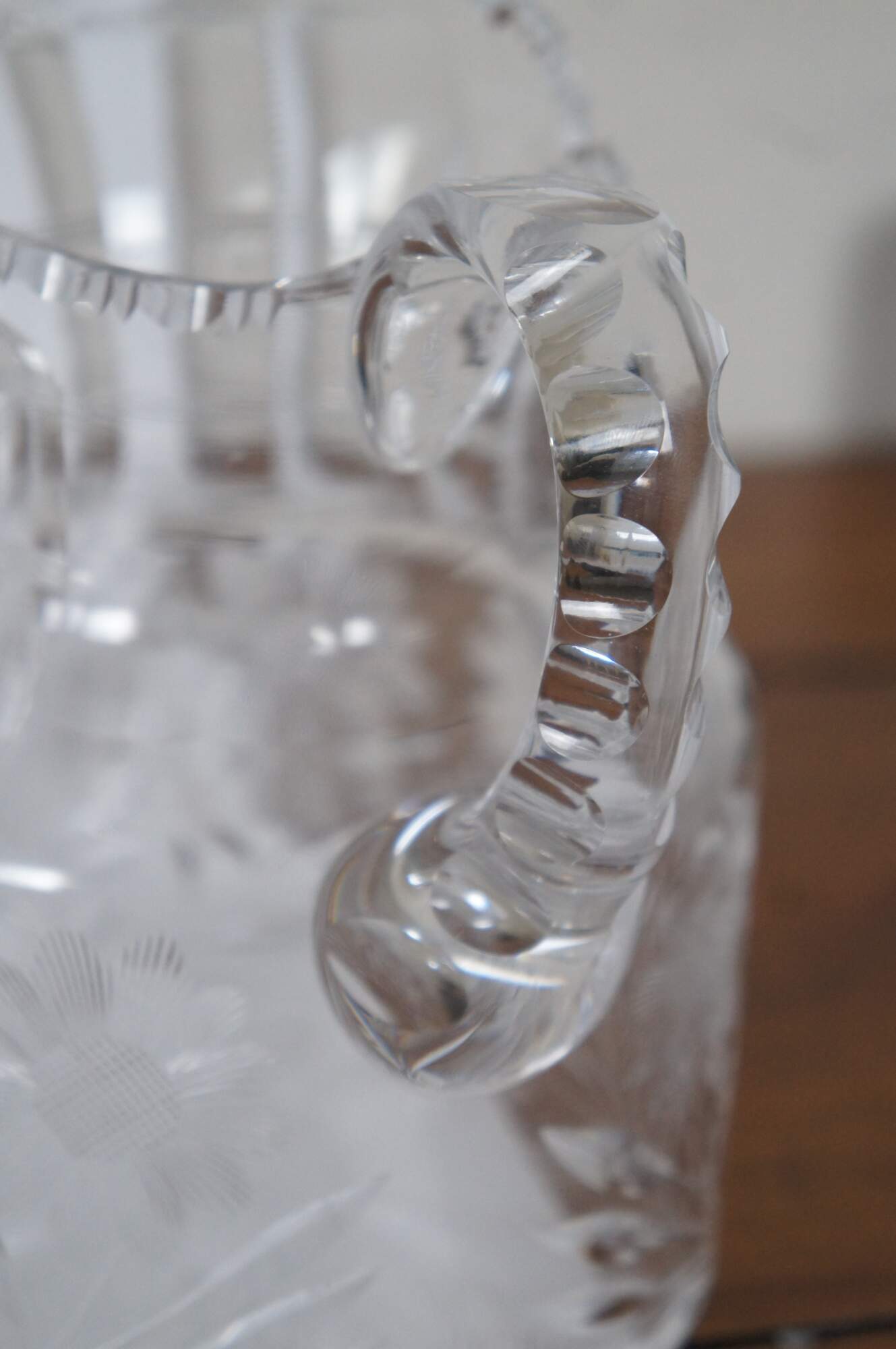 Antique heavy cut crystal pitcher and six tumbler glasses featuring floral daisy design.